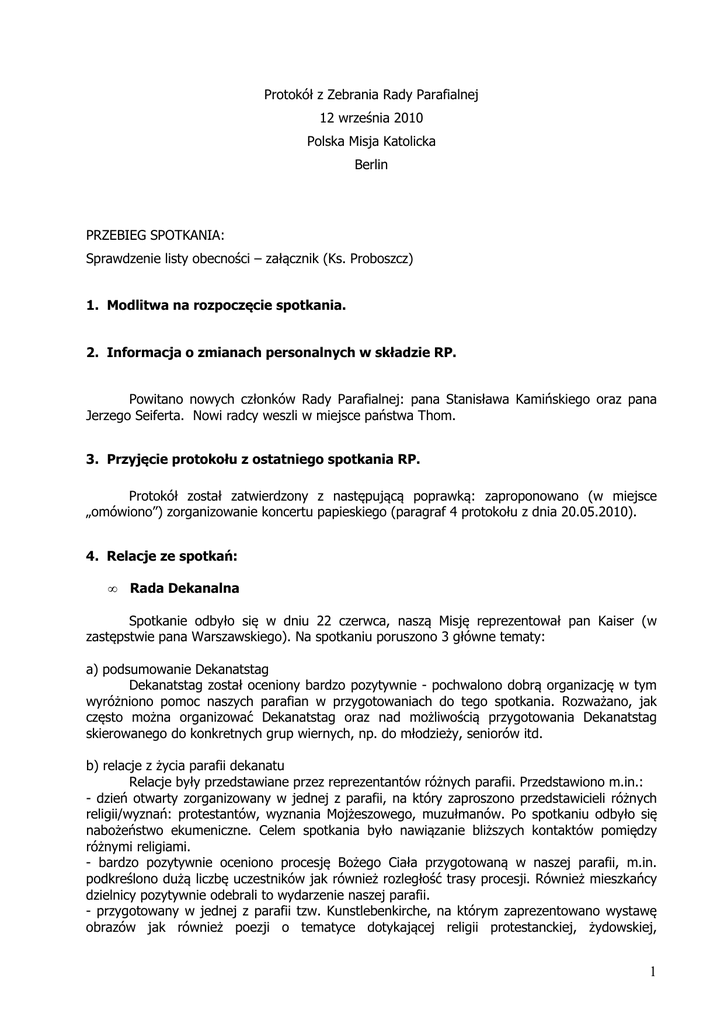 Protokół z Zebrania Rady Parafialnej 12 września 2010 Polska Misja Katolicka Berlin PRZEBIEG SPOTKANIA: Sprawdzenie listy obecności – załącznik (Ks. Proboszcz) 1. Modlitwa na rozpoczęcie spotkania. 2. Informacja o zmianach personalnych w składzie RP. Powitano nowych członków Rady Parafialnej: pana Stanisława Kamińskiego oraz pana Jerzego Seiferta. Nowi radcy weszli w miejsce państwa Thom. 3. Przyjęcie protokołu z ostatniego spotkania RP. Protokół został zatwierdzony z następującą poprawką: zaproponowano (w miejsce „omówiono”) zorganizowanie koncertu papieskiego (paragraf 4 protokołu z dnia 20.05.2010). 4. Relacje ze spotkań: • Rada Dekanalna Spotkanie odbyło się w dniu 22 czerwca, naszą Misję reprezentował pan Kaiser (w zastępstwie pana Warszawskiego). Na spotkaniu poruszono 3 główne tematy: a) podsumowanie Dekanatstag Dekanatstag został oceniony bardzo pozytywnie - pochwalono dobrą organizację w tym wyróżniono pomoc naszych parafian w przygotowaniach do tego spotkania. Rozważano, jak często można organizować Dekanatstag oraz nad możliwością przygotowania Dekanatstag skierowanego do konkretnych grup wiernych, np. do młodzieży, seniorów itd. b) relacje z życia parafii dekanatu Relacje były przedstawiane przez reprezentantów różnych parafii. Przedstawiono m.in.: - dzień otwarty zorganizowany w jednej z parafii, na który zaproszono przedstawicieli różnych religii/wyznań: protestantów, wyznania Mojżeszowego, muzułmanów. Po spotkaniu odbyło się nabożeństwo ekumeniczne. Celem spotkania było nawiązanie bliższych kontaktów pomiędzy różnymi religiami. - bardzo pozytywnie oceniono procesję Bożego Ciała przygotowaną w naszej parafii, m.in. podkreślono dużą liczbę uczestników jak również rozległość trasy procesji. Również mieszkańcy dzielnicy pozytywnie odebrali to wydarzenie naszej parafii. - przygotowany w jednej z parafii tzw. Kunstlebenkirche, na którym zaprezentowano wystawę obrazów jak również poezji o tematyce dotykającej religii protestanckiej, żydowskiej, 1 muzułmańskiej. Spotkaniu towarzyszyły również dyskusje i wykłady na różnorodne tematy. Spotkanie zakończyło się nabożeństwem. c) sprawy aktualne - poproszono, by wierni z parafii samodzielnie informowali się o różnych wydarzeniach organizowanych w Archidiecezji Berlińskiej. Informacje te są stale aktualizowane i dostępne na stronie Erzbistum (www.erzbistumberlin.de), gdyż wiele informacji o planowanych wydarzeniach nie dociera do parafii. - w styczniu 2011 roku odbędzie się szkolenie dla osób prowadzących grupy przy parafii. Zapraszano, by osoby odpowiedzialne z naszej misji, które chciałyby wziąć w tym szkoleniu zostały na nie skierowane. - w dekanacie działa grupa młodzieżowa „Dekanatsjugendhelferrunde”, zajmująca się organizowaniem m.in. różnych imprez młodzieżowych. Jej przedstawiciele zwrócili się z zapytaniem, czy ktoś z młodzieży z naszej parafii nie chciałby się również zaangażować w działanie tej grupy. • Przygotowujące do obchodów na dzień 3.10.2010 W spotkaniu wziął udział pan Seifert. Obchody dnia 03.10.2010 mają przebiec w formie nabożeństwa ekumenicznego pod hasłem: „Danken, feiern und beten”, które rozpocznie się o godz. 17.00 w parafii Herz Jesu. Po nabożeństwie odbędzie się spotkanie oraz dyskusje przy wspólnym posiłku. Na obchodach będą obecni kardynał Sterzinsky, główny odpowiedzialny kościoła ewangelickiego oraz ewentualnie przedstawiciele kościoła żydowskiego i muzułmańskiego. Również do naszej Misji zostanie wystosowane zaproszenie. • Procesja Bożego Ciała w naszej parafii - wyjaśniono, ze kapłan z naszej misji zamykał procesję, gdyż ostatni ołtarz został przydzielony Polskiej Misji. - rozważano możliwość skrócenia jednego odcinka procesji - procesja Bożego Ciała prawdopodobnie odbędzie się również w przyszłym roku, i na spotkaniu z ks. Kozurem podsumowującym procesję będzie można omówić wszelkie pomocne zmiany na przyszły rok. • Pielgrzymka do Neuzelle - pierwsza pielgrzymka dla misji obcojęzycznych w diecezji berlińskiej. - w spotkaniu uczestniczyło ok. 500 – 600 osób z 25 narodowości i 15 Misji zorganizowanych w Berlinie, w tym nasza Misja. - odbył się wspólny obiad, na którym można było zapoznać się z innymi misjami; również dla dzieci zorganizowano miejsce do zabawy. - 6 wspólnot, m.in. nasza Misja, Indie, Ghana, Kamerun, Korea miało okazję przedstawić swoję Misje przed wszystkimi zebranymi, prezentując przygotowany program artystyczny. 5. Informacje na temat oczekujących nas wydarzeń w Misji oraz Archidiecezji: • Dni Papieskie w naszej Misji - Dni papieskie odbędą się pod hasłem „Nie lękajcie się. Otwórzcie drzwi Chrystusowi”. 2 - 1.10.2001 otwarcie wystawy promującej młodych artystów. Wystawa pt. „Z niezauważanych” prezentująca malarstwo i rzeźbę Dominiki Sitarskiej oraz Anity Mańk. - 3.10.2010 po Mszy o godz. 12.00 odbędzie się koncert papieski przygotowany przez dzieci. W domku parafii niemieckiej natomiast będzie przeprowadzona sprzedaż ciasta, z którego dochód zostanie przeznaczony na wsparcie wyjazdu dzieci z rodzin wielodzietnych na kolonie jesienne do Concordii. • Przygotowania do światowych Dni Młodzieży w Madrycie - Terminy spotkań przygotowujących do wyjazdu są ustalone do grudnia br. i są otwarte zarówno dla tych, którzy pragną wyjechać na Dni Młodzieży jak również dla tych, którzy wspierają tę ideę modlitwą. Na spotkaniach tych będzie rozważane 10 tematów przygotowujących duchowo do tego wydarzenia. - Dni Młodzieży, 25-te już z kolei, odbędą się 11-21. sierpnia 2011; koszt 650 euro. Istnieje również możliwość wzięcia udziału w pielgrzymce przygotowującej, która będzie biegła trasą sanktuariów w Portugalii i Hiszpanii, m.in. Fatima, Toledo, i odbędzie się 6-11. sierpnia. K