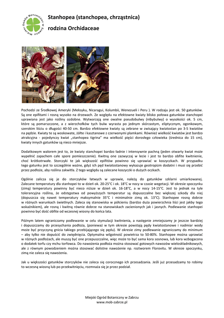 Stanhopea (stanchopea, chrząstnica) rodzina Orchidaceae Pochodzi ze Środkowej Ameryki (Meksyku, Nicaragui, Kolumbii, Wenezueli i Peru ). W rodzaju jest ok. 50 gatunków. Są one epifitami i rosną wysoko na drzewach. Ze względu na efektowne kwiaty blisko połowa gatunków stanchopei uprawiana jest jako rośliny ozdobne. Wytwarzają one owalne pseudobulwy (nibybulwy) o wysokości ok. 5 cm, które są pomarszczone, a z wierzchołków tych bulw wyrasta po jednym skórzastym, eliptycznym, ogonkowym, szerokim liściu o długości 40-50 cm. Bardzo efektowne kwiaty są zebrane w zwisający kwiatostan po 3-5 kwiatów na pędzie. Kwiaty te są woskowate, żółte i kasztanowe z czerwonymi plamkami. Również wielkość kwiatów jest bardzo atrakcyjna - pojedynczy kwiat „stanhopea tigrina” ma wielkość pięści dorosłego człowieka (średnica do 15 cm), kwiaty innych gatunków są nieco mniejsze. Dodatkowym walorem jest to, że kwiaty stanchopei bardzo ładnie i intensywnie pachną (jeden otwarty kwiat może wypełnić zapachem całe spore pomieszczenie). Kwitną one zazwyczaj w lecie i jest to bardzo obfite kwitnienie, choć krótkotrwałe. Storczyki te jak większość epifitów powinno się uprawiać w koszyczkach. W przypadku tego gatunku jest to szczególnie ważne, gdyż ich pęd kwiatostanowy wykazuje geotropizm dodatni i musi się przebić przez podłoże, aby roślina zakwitła. Z tego względu są zalecane koszyczki o dużych oczkach. Ogólnie zalicza się je do storczyków łatwych w uprawie, należą do gatunków szklarni umiarkowanej. Zalecane temperatury dla stanhopei to w dzień ok. 20-25°C i ok. 18°C w nocy w czasie wegetacji. W okresie spoczynku (zimą) temperatury powinny być nieco niższe w dzień ok. 16-18°C, a w nocy 14-15°C. Jest to jednak na tyle tolerancyjna roślina, że odstępstwa od powyższych temperatur są dopuszczalne bez większej szkody dla niej (dopuszcza się nawet temperatury maksymalnie 35°C i minimalnie zimą ok. 13°C). Stanhopee rosną dobrze w różnych warunkach świetlnych. Zaleca się stanowiska w półcieniu (bardzo duża powierzchnia liści jest jakby tego wskaźnikiem), ale rosną i kwitną równie dobrze na stanowiskach zacienionych jak i jasnych. Podlewanie stanhopei powinno być dość obfite od wczesnej wiosny do końca lata. Późnym latem ograniczamy podlewanie w celu stymulacji kwitnienia, a następnie zmniejszamy je jeszcze bardziej i dopuszczamy do przesychania podłoża, (ponieważ w tym okresie powstają pędy kwiatostanowe i nadmiar wody może być przyczyną gnicia takiego przebijającego się pędu). W okresie zimy podlewanie ograniczamy do minimum – aby tylko nie dopuścić do zwiędnięcia. Optymalna wilgotność powietrza to 50-80%. Stanhopee można uprawiać w różnych podłożach, ale muszą być one przepuszczalne, więc może to być sama kora sosnowa, lub kora wzbogacona o dodatek torfu czy mchu torfowca. Do nawożenia podłoża można stosować gotowych nawozów wieloskładnikowych, ale z równym powodzeniem można stosować dolistne nawożenie np. roztworem Florovitu. W okresie spoczynku, zimą nie zaleca się nawożenia. Jak u większości gatunków storczyków nie zaleca się corocznego ich przesadzania. Jeśli już przesadzamy to robimy to wczesną wiosną lub po przekwitnięciu, rozmnaża się je przez podział. Miejski Ogród Botaniczny w Zabrzu www.mob-zabrze.pl