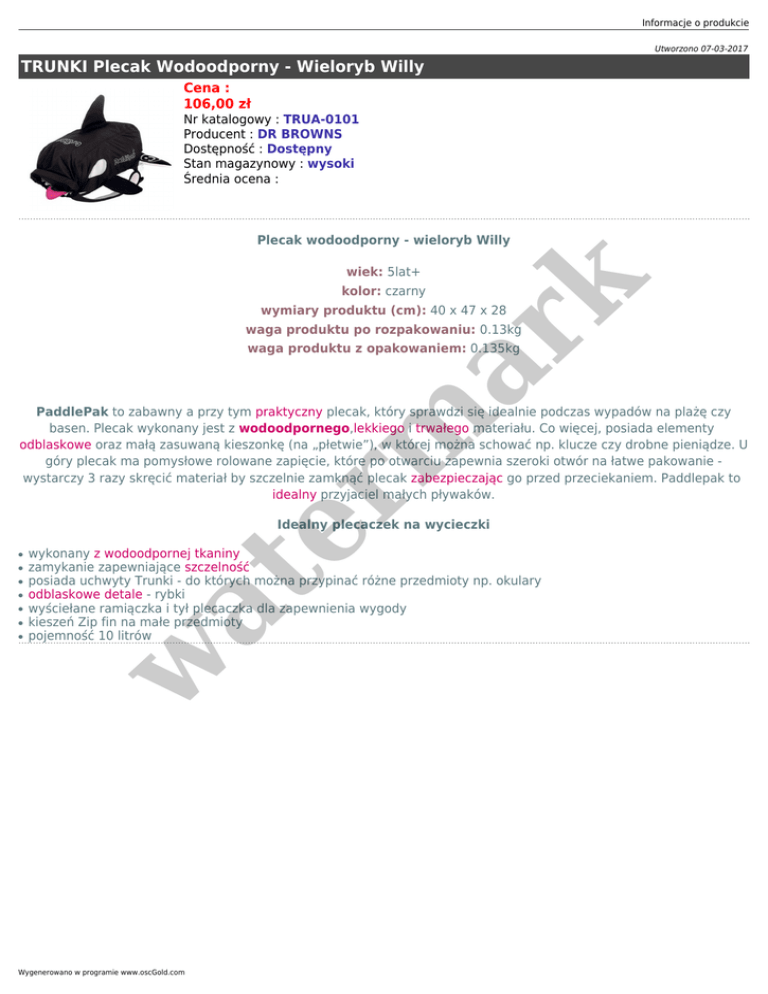Informacje o produkcie Utworzono 07-03-2017 TRUNKI Plecak Wodoodporny - Wieloryb Willy Cena : 106,00 zł Nr katalogowy : TRUA-0101 Producent : DR BROWNS Dostępność : Dostępny Stan magazynowy : wysoki Średnia ocena : Plecak wodoodporny - wieloryb Willy er m ar k wiek: 5lat+ kolor: czarny wymiary produktu (cm): 40 x 47 x 28 waga produktu po rozpakowaniu: 0.13kg waga produktu z opakowaniem: 0.135kg PaddlePak to zabawny a przy tym praktyczny plecak, który sprawdzi się idealnie podczas wypadów na plażę czy basen. Plecak wykonany jest z wodoodpornego,lekkiego i trwałego materiału. Co więcej, posiada elementy odblaskowe oraz małą zasuwaną kieszonkę (na „płetwie”), w której można schować np. klucze czy drobne pieniądze. U góry plecak ma pomysłowe rolowane zapięcie, które po otwarciu zapewnia szeroki otwór na łatwe pakowanie wystarczy 3 razy skręcić materiał by szczelnie zamknąć plecak zabezpieczając go przed przeciekaniem. Paddlepak to idealny przyjaciel małych pływaków. Idealny plecaczek na wycieczki ● ● ● ● ● w ● wykonany z wodoodpornej tkaniny zamykanie zapewniające szczelność posiada uchwyty Trunki - do których można przypinać różne przedmioty np. okulary odblaskowe detale - rybki wyściełane ramiączka i tył plecaczka dla zapewnienia wygody kieszeń Zip fin na małe przedmioty pojemność 10 litrów at ● Wygenerowano w programie www.oscGold.com