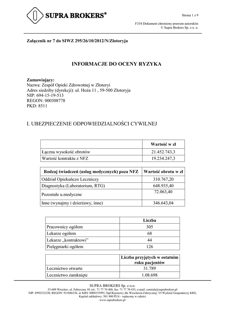 Strona 1 z 9 F334 Dokument chroniony prawem autorskim © Supra Brokers Sp. z o. o. Załącznik nr 7 do SIWZ 295/26/10/2012/N/Złotoryja INFORMACJE DO OCENY RYZYKA Zamawiający: Nazwa: Zespół Opieki Zdrowotnej w Złotoryi Adres siedziby (dyrekcji): ul. Hoża 11 , 59-500 Złotoryja NIP: 694-15-19-513 REGON: 000308778 PKD: 8511 I. UBEZPIECZENIE ODPOWIEDZIALNOŚCI CYWILNEJ Wartość w zł Łączna wysokość obrotów Wartość kontraktu z NFZ 21.452.743,3 19.234.247,3 Rodzaj świadczeń (usług medycznych) poza NFZ Oddział Opiekuńczo Leczniczy Diagnostyka (Laboratorium, RTG) Wartość obrotu w zł 310.767,20 648.935,40 72.063,40 Pozostałe u.medyczne Inne (wynajmy i dzierżawy, inne) 346.643,04 Pracownicy ogółem Lekarze ogółem Lekarze „kontraktowi” Pielęgniarki ogółem Liczba 305 68 44 126 Lecznictwo otwarte Lecznictwo zamknięte Liczba przyjętych w ostatnim roku pacjentów 31.789 1.08.698 SUPRA BROKERS Sp. z o.o. 53-609 Wrocław, ul. Fabryczna 10, tel.: 71 77 70 400, fax: 71 77 70 455, e-mail: [email protected] NIP: 8992523230, REGON: 931886336, nr KRS: 0000155993, Sąd Rejonowy dla Wrocławia-Fabrycznej, VI Wydział Gospodarczy KRS, Kapitał zakładowy: 501 800 PLN - wpłacony w całości www.suprabrokers.pl Strona 2 z 9 F334 Dokument chroniony prawem autorskim © Supra Brokers Sp. z o. o. Oddział Chirurgii Ogólnej Ginekologiczno-Położniczy Neonatologiczny Pediatryczny Otolaryngologiczny Neurologiczny Chorób Wewnętrznych Anestezjologiczny Rehabilitacyjny Opiekuńczo-Leczniczy Liczba lekarzy kontraktowych 6 4 0 4 4 1 1 5 0 1 Liczba łóżek 30 30 8 26 15 20 51 2 55 37 Sposób organizacji opieki lekarskiej podczas dyżurów: umowa o prace i kontraktowi OCENA RYZYKA ZAKAŻEŃ SZPITALNYCH 1 2 3 4 5 6 7 8 W podmiocie leczniczym działa Zespół d/s. Zakażeń Szpitalnych W podmiocie leczniczym rejestrowane są zakażenia szpitalne wszystkie wybiórczo Liczba stwierdzanych rocznie zakażeń szpitalnych krwiopochodnych (wzw B, wzw C, hiv) gronkowca innych Podmiot leczniczy zgłasza do Sanepid zakażenia szpitalne/choroby zakaźne wszystkie krwiopochodne Podmiot leczniczy posiada centralną sterylizatornię W podmiocie leczniczym używane są sterylizatory narzędzi na suche, gorące powietrze Prowadzona jest wewnętrzna kontrola procesów sterylizacji Testy używane do kontroli procesów sterylizacji i pracy sterylizatorów: wskaźniki fizyczne wydruk komputerowy testy Bowie-Dicka testy paskowe testy zintegrowane testy biologiczne TAK NIE TAK TAK 0 2 30 TAK TAK NIE TAK TAK NIE NIE TAK TAK TAK SUPRA BROKERS Sp. z o.o. 53-609 Wrocław, ul. Fabryczna 10, tel.: 71 77 70 400, fax: 71 77 70 455, e-mail: [email protected] NIP: 8992523230, REGON: 931886336, nr KRS: 0000155993, Sąd Rejonowy dla Wrocławia-Fabrycznej, VI Wydział Gospodarczy KRS, Kapitał zakładowy: 501 800 PLN - wpłacony w całości www.suprabrokers.pl Strona 3 z 9 F334 Dokument chroniony prawem autorskim © Supra Brokers Sp. z o. o. 9 10 11 12 13 14 Używane są puszki Schimmelbuscha jako opakowania do sterylizacji Inne opakowania używane do sterylizacji puszki kontenerowe rękawy papierowo – foliowe inne Do mycia rąk używane jest mydło w: dozownikach kostkach Do dezynfekcji rąk używany jest środek dezynfekcyjny w dozownikach Cały personel poddawany jest szkoleniom z zakresu zapobiegania infekcjom szkolenie tylko przy przyjęciu do pracy systematycznie W podmiocie leczniczym opracowane są następujące procedury postępowania mycia i dezynfekcji rąk w czasie pobierania krwi 15 16 17 18 przy wykonywaniu iniekcji podczas dezynfekcji podczas sterylizacji ze sprzętem endoskopowym z zużytym sprzętem jednorazowym ze skażonym mat. biologicznym Przestrzeganie procedur jest systematycznie kontrolowane Możliwa jest izolacja pacjentów chorych zakaźnie Podmiot leczniczy posiada myjnię do endoskopów półautomatyczną automatyczną sterylizator Cały personel narażony na zakażenie wzw jest zaszczepiony przeciwko żółtaczce typu B (na podstawie dokumentacji w Zakł. Leczniczym) NIE NIE TAK NIE TAK NIE TAK TAK TAK TAK TAK TAK TAK TAK TAK TAK TAK TAK TAK TAK Zakres świadczonych usług medycznych Lecznictwo zamknięte Poradnie specjalistyczne Zakład pielęgnacyjno – opiekuńczy Zakład rehabilitacji SUPRA BROKERS Sp. z o.o. 53-609 Wrocław, ul. Fabryczna 10, tel.: 71 77 70 400, fax: 71 77 70 455, e-mail: [email protected] NIP: 8992523230, REGON: 931886336, nr KRS: 0000155993, Sąd Rejonowy dla Wrocławia-Fabrycznej, VI Wydział Gospodarczy KRS, Kapitał zakładowy: 501 800 PLN - wpłacony w całości www.suprabrokers.pl Strona 4 z 9 F334 Dokument chroniony prawem autorskim © Supra Brokers Sp. z o. o. Fizykoterapia Diagnostyka specjalistyczna Apteka szpitalna Zakres świadczonych usług pozamedycznych Usługi sterylizacji dla podmiotów zewnętrznych Wynajem pomieszczeń Podmiot leczniczy posiada laboratorium diagnostyczne posiada laboratorium mikrobiologiczne Posiadane certyfikaty Certyfikat ISO 9001 ZARZĄDZANIE RYZYKIEM OC W podmiocie leczniczym funkcjonuje Zespół do spraw minimalizacji ryzyka roszczeń medycznych. W podmiocie leczniczym został powołany Pełnomocnik (nie dotyczy pełnomocnika prawnego) do spraw postępowania z roszczeniem medycznym. W podmiocie leczniczym zastosowane są procedury nadzoru nad roszczeniem: - określania związku przyczynowo – skutkowego roszczenia, - podejmowania prób wycofania roszczenia, - postępowania w celu doprowadzenia do ugody. II. UBEZPIECZENIA MIENIA ZASTOSOWANE ZABEZPIECZENIA PRZECIWPOŻAROWE gaśnice hydranty wewnętrzne hydranty zewnętrzne stały dozór SUPRA BROKERS Sp. z o.o. 53-609 Wrocław, ul. Fabryczna 10, tel.: 71 77 70 400, fax: 71 77 70 455, e-mail: [email protected] NIP: 8992523230, REGON: 931886336, nr KRS: 0000155993, Sąd Rejonowy dla Wrocławia-Fabrycznej, VI Wydział Gospodarczy KRS, Kapitał zakładowy: 501 800 PLN - wpłacony w całości www.suprabrokers.pl Strona 5 z 9 F334 Dokument chroniony prawem autorskim © Supra Brokers Sp