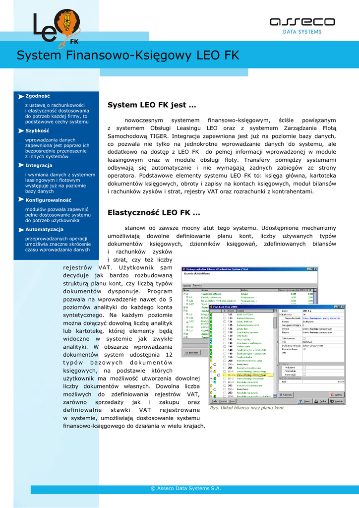 FK System Finansowo-Księgowy LEO FK Zgodność z ustawą o rachunkowości i elastyczność dostosowania do potrzeb każdej firmy, to podstawowe cechy systemu Szybkość wprowadzania danych zapewniona jest poprzez ich bezpośrednie przenoszenie z innych systemów Integracja i wymiana danych z systemem leasingowym i flotowym występuje już na poziomie bazy danych System LEO FK jest … nowoczesnym systemem finansowo-księgowym, ściśle powiązanym z systemem Obsługi Leasingu LEO oraz z systemem Zarządzania Flotą Samochodową TIGER. Integracja zapewniona jest już na poziomie bazy danych, co pozwala nie tylko na jednokrotne wprowadzanie danych do systemu, ale dodatkowo na dostęp z LEO FK do pełnej informacji wprowadzonej w module leasingowym oraz w module obsługi floty. Transfery pomiędzy systemami odbywają się automatycznie i nie wymagają żadnych zabiegów ze strony operatora. Podstawowe elementy systemu LEO FK to: księga główna, kartoteka dokumentów księgowych, obroty i zapisy na kontach księgowych, moduł bilansów i rachunków zysków i strat, rejestry VAT oraz rozrachunki z kontrahentami. Konfigurowalność modułów pozwala zapewnić pełne dostosowanie systemu do potrzeb użytkownika Elastyczność LEO FK … stanowi od zawsze mocny atut tego systemu. Udostępnione mechanizmy umożliwiają dowolne definiowanie planu kont, liczby używanych typów przeprowadzanych operacji umożliwia znaczne skrócenie dokumentów księgowych, dzienników księgowań, zdefiniowanych bilansów czasu wprowadzania danych i rachunków zysków i strat, czy też liczby rejestrów VAT. Użytkownik sam decyduje jak bardzo rozbudowaną strukturą planu kont, czy liczbą typów dokumentów dysponuje. Program pozwala na wprowadzenie nawet do 5 poziomów analityki do każdego konta syntetycznego. Na każdym poziomie można dołączyć dowolną liczbę analityk lub kartotekę, której elementy będą widoczne w systemie jak zwykłe analityki. W obszarze wprowadzania dokumentów system udostępnia 12 typów bazowych dokumentów księgowych, na podstawie których użytkownik ma możliwość utworzenia dowolnej liczby dokumentów własnych. Dowolna liczba możliwych do zdefiniowania rejestrów VAT, zarówno sprzedaży jak i zakupu oraz Rys. Układ bilansu oraz planu kont definiowalne stawki VAT rejestrowane w systemie, umożliwiają dostosowanie systemu finansowo-księgowego do działania w wielu krajach. Automatyzacja © Asseco Data Systems S.A. Możliwość stworzenia własnej kartoteki … będącej zdefiniowanym przez użytkownika zbiorem rekordów jest kolejną unikalną cechą LEO FK. Można też zdefiniować kartotekę jako podzbiór bazy danych systemu, tworząc odpowiednie zapytanie w języku SQL. Daje to niespotykaną w innych systemach elastyczność analityki. Ponieważ dane systemu finansowo-księgowego znajdują się razem z danymi innych systemów, istnieje możliwość definiowania kartotek powstających z danych wprowadzanych w innych działach firmy. Kartoteki mogą być tworzone, na przykład na podstawie listy umów leasingowych, kontrahentów, kredytów, banków, walut, pojazdów, itd. Nie ma konieczności wprowadzania do planu kont poszczególnych analityk z takiej kartoteki, wystarczy do danego konta podłączyć kartotekę i wszystkie jej elementy traktowane będą jak zwykłe analityki. Taka kartoteka będzie się automatycznie powiększać, w miarę powstawania nowych umów, czy dodawania nowych kontrahentów. Kontrola wprowadzanych danych … możliwa jest dzięki wbudowanemu mechanizmowi „bufora”, pozwala on prowadzić pełną kontrolę dokumentów przed ich zapisaniem. System automatycznie przeprowadza również pełną kontrolę dokumentów księgowych przed ich zaksięgowaniem. Kontrolowane są wszystkie wymagane ustawą o rachunkowości parametry dokumentu. Wszystkie niespójności są w sposób czytelny zgłaszane operatorowi, który od razu ma możliwość ich skorygowania. Zgodnie z ustawą o rachunkowości w systemie prowadzona jest rejestracja dzienników księgowań. Dokumenty w dziennikach rejestrowane są automatycznie w momencie ich księgowania. Zależnie od potrzeb istnieje możliwość zdefiniowania dowolnej liczby dzienników. Ustawa o Przeciwdziałaniu Praniu Brudnych Pieniędzy nakłada na leasingodawcę obowiązek ewidencji każdej transakcji przekraczającej ustawową kwotę oraz konieczność cyklicznego przekazywania danych do Generalnego Inspektora Informacji Finansowej (GIIF). Wbudowany w system moduł wspiera te działania, zarówno automatycznie wybierając dane podlegające rejestracji, jak również Rys. Lista dokumentów przygotowując gotowe pliki, które można wysłać do GIIF. Efektywność … to kolejna ważna cecha systemu LEO FK. Oprócz standardowego, ręcznego wprowadzania danych w dokumentach księgowych, możliwe jest wykorzystanie wbudowanych kreatorów (np.: stornowania dokumentów, konwersji kont księgowych, odczytu płatności przychodzących), które znacznie przyśpieszają wprowadzanie dokumentów księgowych. Dokumenty księgowe, generowane w module leasingowym, automatycznie wprowadzane są do systemu finansowoksięgowego bez konieczności ingerencji operatora. W systemie znajdują się zaawansowane mechanizmy wyszukiwania i filtrowania danych, np.: dokumentów księgowych czy też © Asseco Data Systems S.A. rozrachunków z klientami. Dostępne kryteria obejmują m.in.: daty, opisy, typy dokumentów, wartości, itd., pozwala to na szybkie odszukanie danych do edycji bądź wydruku. Dodatkowe moduły … takie jak Dziennik zakupów, Płatności przychodzące i wychodzące lub Polecenie zapłaty, są kolejnym atutem Systemu LEO FK. Dzięki modułowi Dziennik zakupów możliwe jest szybkie i bezbłędne wprowadzanie dokumentów zakupowych przychodzących do firmy. Operator wprowadza tylko konieczne dane, takie jak numer faktury, kwoty, wybiera kontrahenta i określa wzorzec księgowania. Na podstawie tak wprowadzonyc