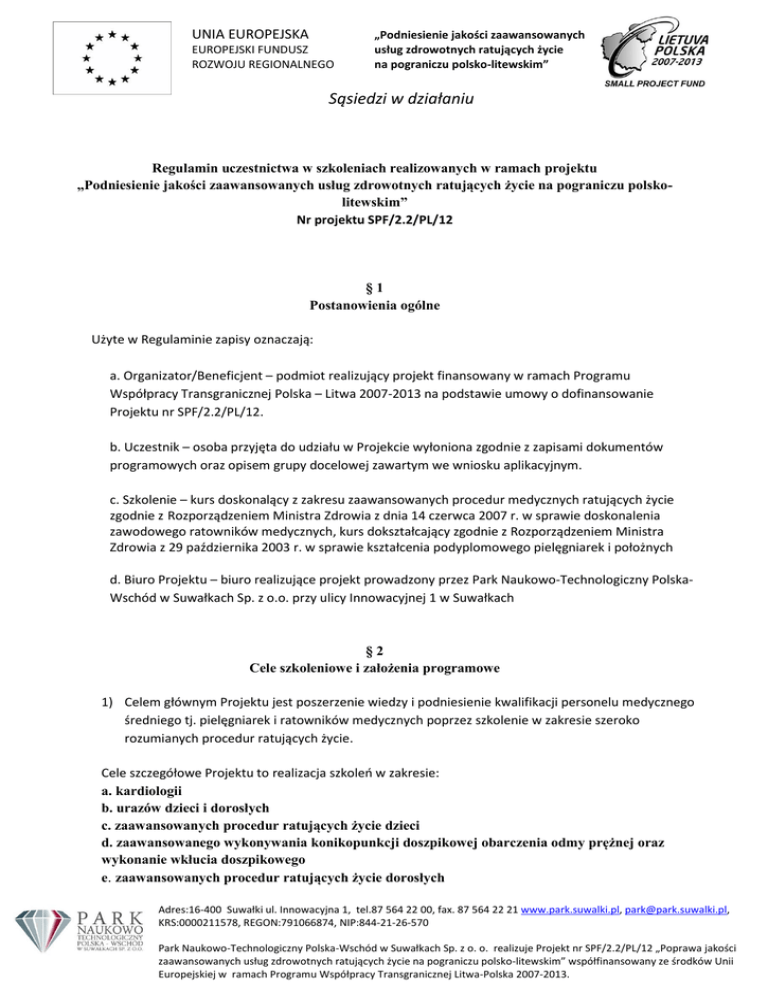 UNIA EUROPEJSKA EUROPEJSKI FUNDUSZ ROZWOJU REGIONALNEGO „Podniesienie jakości zaawansowanych usług zdrowotnych ratujących życie na pograniczu polsko-litewskim” Sąsiedzi w działaniu Regulamin uczestnictwa w szkoleniach realizowanych w ramach projektu „Podniesienie jakości zaawansowanych usług zdrowotnych ratujących życie na pograniczu polskolitewskim” Nr projektu SPF/2.2/PL/12 §1 Postanowienia ogólne Użyte w Regulaminie zapisy oznaczają: a. Organizator/Beneficjent – podmiot realizujący projekt finansowany w ramach Programu Współpracy Transgranicznej Polska – Litwa 2007-2013 na podstawie umowy o dofinansowanie Projektu nr SPF/2.2/PL/12. b. Uczestnik – osoba przyjęta do udziału w Projekcie wyłoniona zgodnie z zapisami dokumentów programowych oraz opisem grupy docelowej zawartym we wniosku aplikacyjnym. c. Szkolenie – kurs doskonalący z zakresu zaawansowanych procedur medycznych ratujących życie zgodnie z Rozporządzeniem Ministra Zdrowia z dnia 14 czerwca 2007 r. w sprawie doskonalenia zawodowego ratowników medycznych, kurs dokształcający zgodnie z Rozporządzeniem Ministra Zdrowia z 29 października 2003 r. w sprawie kształcenia podyplomowego pielęgniarek i położnych d. Biuro Projektu – biuro realizujące projekt prowadzony przez Park Naukowo-Technologiczny PolskaWschód w Suwałkach Sp. z o.o. przy ulicy Innowacyjnej 1 w Suwałkach §2 Cele szkoleniowe i założenia programowe 1) Celem głównym Projektu jest poszerzenie wiedzy i podniesienie kwalifikacji personelu medycznego średniego tj. pielęgniarek i ratowników medycznych poprzez szkolenie w zakresie szeroko rozumianych procedur ratujących życie. Cele szczegółowe Projektu to realizacja szkoleń w zakresie: a. kardiologii b. urazów dzieci i dorosłych c. zaawansowanych procedur ratujących życie dzieci d. zaawansowanego wykonywania konikopunkcji doszpikowej obarczenia odmy prężnej oraz wykonanie wkłucia doszpikowego e. zaawansowanych procedur ratujących życie dorosłych Adres:16-400 Suwałki ul. Innowacyjna 1, tel.87 564 22 00, fax. 87 564 22 21 www.park.suwalki.pl, [email protected], KRS:0000211578, REGON:791066874, NIP:844-21-26-570 Park Naukowo-Technologiczny Polska-Wschód w Suwałkach Sp. z o. o. realizuje Projekt nr SPF/2.2/PL/12 „Poprawa jakości zaawansowanych usług zdrowotnych ratujących życie na pograniczu polsko-litewskim” współfinansowany ze środków Unii Europejskiej w ramach Programu Współpracy Transgranicznej Litwa-Polska 2007-2013. UNIA EUROPEJSKA EUROPEJSKI FUNDUSZ ROZWOJU REGIONALNEGO „Podniesienie jakości zaawansowanych usług zdrowotnych ratujących życie na pograniczu polsko-litewskim” Sąsiedzi w działaniu §3 Zasady udziału 1. W szkoleniach mogą wziąć udział zatrudnieni w jednostkach służby zdrowia: a. pielęgniarki / pielęgniarze b. ratownicy / ratowniczki medyczne 2. Uczestnik musi spełniać łącznie następujące wymogi formalne: a. zatrudnienie w jednostkach ochrony zdrowia na terenie województwa podlaskiego lub warmińsko – mazurskiego w Polsce, lub powiatów Mariampol i Alytus na Litwie b. posiada prawo wykonywania zawodu c. posiada co najmniej 3-miesięczny staż pracy w zawodzie d. z własnej inicjatywy jest zainteresowany nabyciem nowych, uzupełnieniem lub podwyższeniem posiadanych kwalifikacji i umiejętności w zakresie zaawansowanych procedur ratujących życie. 3. Z chwilą przystąpienia do Projektu każdy uczestnik zobowiązany jest dostarczyć następujące dokumenty: a. formularz zgłoszenia uczestnictwa w Projekcie wraz z oświadczeniem o zapoznaniu się niniejszym Regulaminem. 4. Zgodnie z zasadami rekrutacji w ramach szkoleń zrekrutowanych zostanie 120 Uczestników (90 osób z Polski i 30 osób z Litwy) 5. Kandydaci będą kwalifikowani na poszczególne szkolenia według kolejności zgłoszeń. 6. Każdy kandydat może uczestniczyć tylko w jednym szkoleniu. W przypadku złożenia przez jedną osobę wniosków na kilka szkoleń zostanie ona zakwalifikowana tylko na jedno wybrane przez zespół projektowy szkolenie. 7. Z osobami zakwalifikowanymi do udziału w szkoleniach zostaną podpisane umowy szkoleniowe. 8. Od wyników kwalifikacji nie przysługuje odwołanie. 9. Projekt jest otwarty na osoby niepełnosprawne dlatego infrastruktura będzie dostosowana do szczególnych potrzeb tych osób. 10. Udział Uczestników we wszystkich działaniach realizowanych w ramach Projektu jest bezpłatny. 11. Wszystkie informacje, dokumenty i formularze dotyczące realizacji Projektu dostępne będą na stronie internetowej Projektu zdrowie.park.suwalki.pl oraz w Biurze Projektu. §4 Obowiązki Organizatora 1. Organizator zobowiązuje się do przeprowadzenia 5 cyklów szkoleń w formie kursów dokształcających i warsztatów szkoleniowych w zakresie medycznych czynności ratunkowych 2. W ramach projektu zostaną zrealizowane następujące cykle szkoleń w zaawansowanych zabiegach ratujących życie: a. kardiologiczne: czas trwania – 30 godzin zajęć edukacyjnych, ilość uczestników - 24 osoby, Adres:16-400 Suwałki ul. Innowacyjna 1, tel.87 564 22 00, fax. 87 564 22 21 www.park.suwalki.pl, [email protected], KRS:0000211578, REGON:791066874, NIP:844-21-26-570 Park Naukowo-Technologiczny Polska-Wschód w Suwałkach Sp. z o. o. realizuje Projekt nr SPF/2.2/PL/12 „Poprawa jakości zaawansowanych usług zdrowotnych ratujących życie na pograniczu polsko-litewskim” współfinansowany ze środków Unii Europejskiej w ramach Programu Współpracy Transgranicznej Litwa-Polska 2007-2013. UNIA EUROPEJSKA EUROPEJSKI FUNDUSZ ROZWOJU REGIONALNEGO „Podniesienie jakości zaawansowanych usług zdrowotnych ratujących życie na pograniczu polsko-litewskim” Sąsiedzi w działaniu 3. 4. 5. 6. 7. 8. b. urazów dzieci i dorosłych: czas trwania – 30 godzin zajęć edukacyjnych, ilość uczestników - 24 osoby, c. pediatrii: czas trwania – 30 godzin zajęć edukacyjnych, ilość uczestników - 24 osoby, d. wykonywan