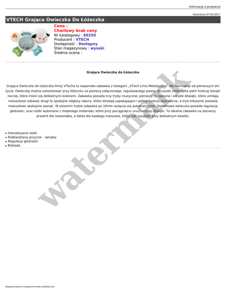 Informacje o produkcie Utworzono 07-03-2017 VTECH Grająca Owieczka Do Łóżeczka Cena : Chwilowy brak ceny Nr katalogowy : 60250 Producent : VTECH Dostępność : Dostępny Stan magazynowy : wysoki Średnia ocena : er m ar k Grająca Owieczka do Łóżeczka Grająca Owieczka do Łóżeczka firmy VTecha to wspaniała zabawka z kategorii „VTech Linia Melodyczna” dla niemowląt od pierwszych dni życia. Owieczkę można zamontować przy łóżeczku za pomocą załączonego, regulowanego paska. Brzuszek zwierzątka pełni funkcję lampki nocnej, która mieni się delikatnymi kolorami. Zabawka posiada trzy tryby muzyczne; pierwszy to radosne i wesołe dźwięki, które umilają maluszkowi zabawę; drugi to spokojne odgłosy natury, które działają uspakajająco i pełnią funkcje poznawcze, a tryb kołysanki pozwala maluszkowi spokojnie zasnąć. W ostatnim trybie zabawka po 10min wyłącza się automatycznie. Dodatkowo owieczka posiada regulację głośności, oraz nóżki wykonane z miękkiego materiału, które przy pociągnięciu uruchamiają dźwięki. To idealna zabawka na pierwszy prezent dla noworodka, a także dla każdego maluszka, który lubi zasypiać przy delikatnym świetle. ■ ■ ■ w at ■ Interaktywne nóżki Podświetlany przycisk – lampka Regulacja głośności Blokada Wygenerowano w programie www.oscGold.com