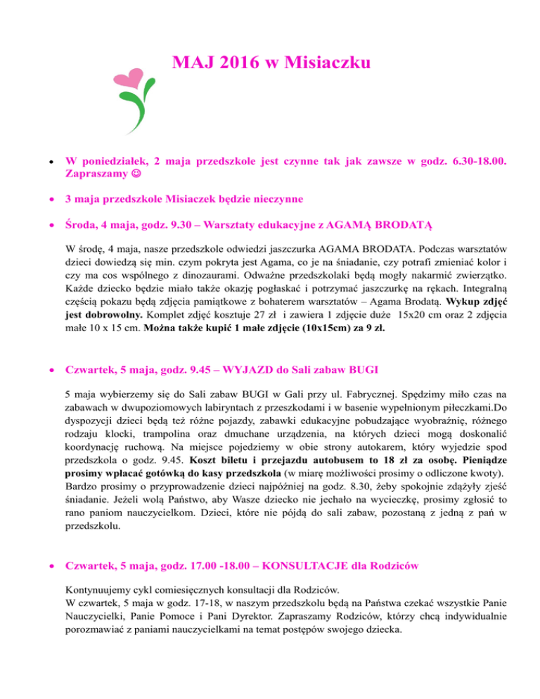 MAJ 2016 w Misiaczku W poniedziałek, 2 maja przedszkole jest czynne tak jak zawsze w godz. 6.30-18.00. Zapraszamy 3 maja przedszkole Misiaczek będzie nieczynne Środa, 4 maja, godz. 9.30 – Warsztaty edukacyjne z AGAMĄ BRODATĄ W środę, 4 maja, nasze przedszkole odwiedzi jaszczurka AGAMA BRODATA. Podczas warsztatów dzieci dowiedzą się min. czym pokryta jest Agama, co je na śniadanie, czy potrafi zmieniać kolor i czy ma cos wspólnego z dinozaurami. Odważne przedszkolaki będą mogły nakarmić zwierzątko. Każde dziecko będzie miało także okazję pogłaskać i potrzymać jaszczurkę na rękach. Integralną częścią pokazu będą zdjęcia pamiątkowe z bohaterem warsztatów – Agama Brodatą. Wykup zdjęć jest dobrowolny. Komplet zdjęć kosztuje 27 zł i zawiera 1 zdjęcie duże 15x20 cm oraz 2 zdjęcia małe 10 x 15 cm. Można także kupić 1 małe zdjęcie (10x15cm) za 9 zł. Czwartek, 5 maja, godz. 9.45 – WYJAZD do Sali zabaw BUGI 5 maja wybierzemy się do Sali zabaw BUGI w Gali przy ul. Fabrycznej. Spędzimy miło czas na zabawach w dwupoziomowych labiryntach z przeszkodami i w basenie wypełnionym piłeczkami.Do dyspozycji dzieci będą też różne pojazdy, zabawki edukacyjne pobudzające wyobraźnię, różnego rodzaju klocki, trampolina oraz dmuchane urządzenia, na których dzieci mogą doskonalić koordynację ruchową. Na miejsce pojedziemy w obie strony autokarem, który wyjedzie spod przedszkola o godz. 9.45. Koszt biletu i przejazdu autobusem to 18 zł za osobę. Pieniądze prosimy wpłacać gotówką do kasy przedszkola (w miarę możliwości prosimy o odliczone kwoty). Bardzo prosimy o przyprowadzenie dzieci najpóźniej na godz. 8.30, żeby spokojnie zdążyły zjeść śniadanie. Jeżeli wolą Państwo, aby Wasze dziecko nie jechało na wycieczkę, prosimy zgłosić to rano paniom nauczycielkom. Dzieci, które nie pójdą do sali zabaw, pozostaną z jedną z pań w przedszkolu. Czwartek, 5 maja, godz. 17.00 -18.00 – KONSULTACJE dla Rodziców Kontynuujemy cykl comiesięcznych konsultacji dla Rodziców. W czwartek, 5 maja w godz. 17-18, w naszym przedszkolu będą na Państwa czekać wszystkie Panie Nauczycielki, Panie Pomoce i Pani Dyrektor. Zapraszamy Rodziców, którzy chcą indywidualnie porozmawiać z paniami nauczycielkami na temat postępów swojego dziecka. Wtorek, 10 maja, godz. 10.30 – TEATRZYK „Złota Rybka” Teatr URWIS zaprosi nas na przedstawienie pt.: „Złota Rybka”. Zapraszamy Środa, 11 maja, godz. 8.50 –Wyjście do BIBLIOTEKI na spotkanie autorskie z pisarzem Jarosławem Siekiem 11 maja ponownie wybierzemy się do biblioteki przy ul. Nałkowskich w Lublinie. Tym razem zostaliśmy zaproszeni na spotkanie z pisarzem panem Jarosławem Siekiem - autorem ponad 30 książek dla dzieci. Spotkanie przeznaczone jest dla dzieci od 4 lat, dlatego tym razem maluszki z grupy „Jeżyki” zostaną z panią w przedszkolu. Pan Siek pisze książki o różnych miastach i regionach Polski min.: „Gadający Lublin, czyli co usłyszeli koziołek i inni”; „Konik konika z Konina”; „Włodzio- reżyser z Łodzi” i inne. O jego bajkach można było usłyszeć w programach TVP i Polsatu. Publikowała je „Gazeta Wyborcza”. Książki jego autorstwa były wydawane w językach polskim i czeskim. Na ich podstawie powstały bajki animowane. Do audiobooków głosu użyczali znani polscy aktorzy, tacy jak chociażby Jan Peszek czy Mirosław Baka. Na spotkaniu będzie możliwość zakupu książeczki pt.: „Gadający Lublin, czyli co usłyszeli koziołek i inni”. Cena książki to 10 zł. Jeżeli chcą Państwo zakupić książkę z dedykacją od samego autora, prosimy zgłosić to do nauczycielek w przedszkolu do piątku, 6 maja. Więcej na temat autora i jego książek można poczytać na stronie: www.jaroslawsiek.pl Bardzo prosimy o przyprowadzenie dzieci najpóźniej na godz. 8.00, żeby spokojnie zdążyły zjeść śniadanie. Jeżeli wolą Państwo, aby Wasze dziecko nie szło na wycieczkę, prosimy zgłosić to rano paniom nauczycielkom. Dzieci, które nie pójdą do biblioteki, pozostaną z maluszkami w przedszkolu. Środa, 11 maja –Wyjazd na Przegląd Piosenki Angielskiej Dzieci z naszego przedszkola wezmą udział w Przeglądzie piosenki angielskiej „The Land of Singing Butterflies”, który odbędzie się 11 maja w Centrum Kongresowym Uniwersytetu Przyrodniczego przy ul. Akademickiej 5. Szczegóły konkursu i listę uczestników podamy w najbliższym terminie. Czwartek, 12 maja, godz. 9.15 –Warsztaty: CO KRYJE STARY KUFER…? 11 maja Fundacja Aktywności Obywatelskiej zaprosi nas na pierwszy z cyklu trzech warsztatów pod nazwą „Witamina L jak Lublin”. Pierwsze zajęcia pod hasłem „Co kryje stary kufer….?” przybliżą dzieciom świat sprzed kilkunastu dekad. Piątek, 13 maja, godz. 9.30 – Spotkanie na temat HARCERSTWA 13 maja nasze przedszkole odwiedzi harcerka Ola Rębisz, która opowie dzieciom czym jest harcerstwo i czego można nauczyć się na zbiórkach zuchów i harcerzy. Pani Ola poprowadzi też zabawy dla przedszkolaków. Środa, 18 maja, godz. 10.30 –Teatr BAJKA Teatr Bajka zaprosi nas na przedstawienie pt.: „Kocmołuszek” Tematem spektaklu jest zapoznanie dzieci ze sposobami dbania o swoje zdrowie oraz higienę osobistą. Dzieci będą nie tylko oglądały ale także czynnie uczestniczyły w humorystycznym przedstawieniu. Podczas zabawy nauczą się tego, jak ważnym jest bycie czystym i schludnym dla zachowania zdrowia. 17,18,19 maja, godz. 15.00 – ŚWIĘTO RODZINY Zapraszamy wszystkich Rodziców naszych przedszkolaków na uroczystości związane z obchodami Dni Mamy i Taty . W programie część artystyczna przygotowana przez dzieci pod kierunkiem pań nauczycielek, podarunki dla Gości wykonane własnoręcznie przez dzieci oraz słodki poczęstunek :-). Zapraszamy! Wtorek, 17 maja, godz. 15.00 – spotkanie dla Rodziców z grupy Pani Magdy „Pszczółki” Środa, 18 maja, godz. 15
