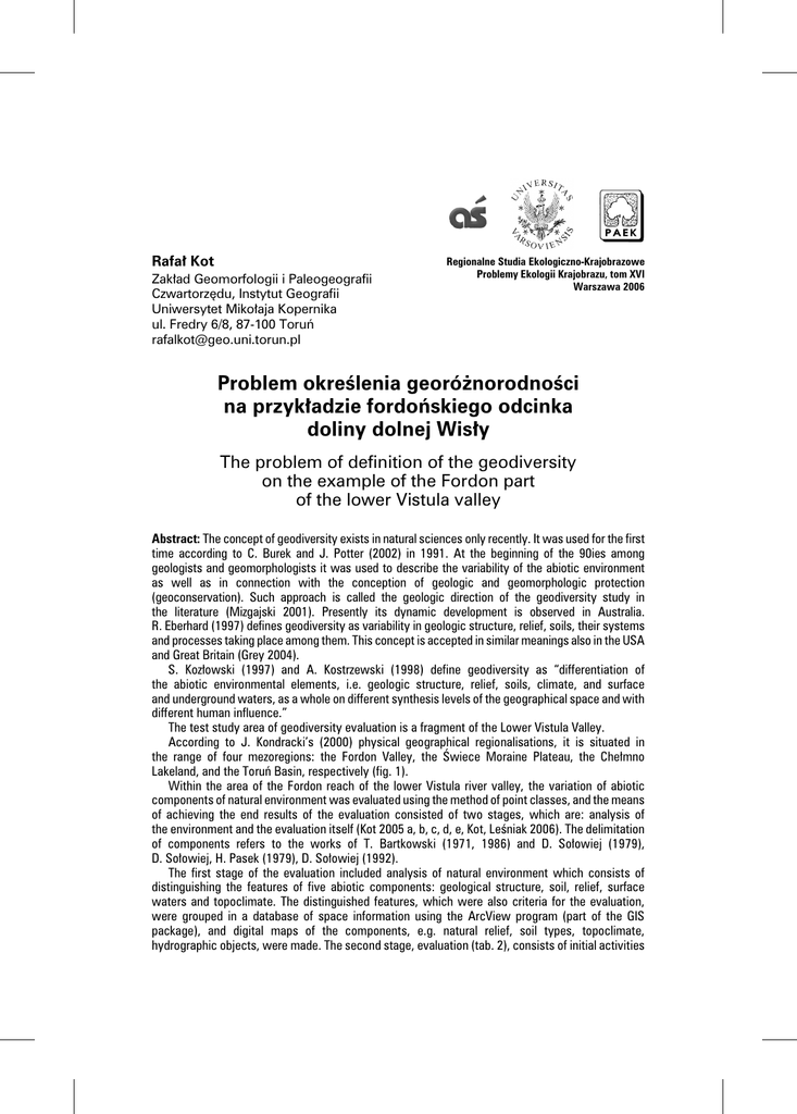 Rafa³ Kot Zak³ad Geomorfologii i Paleogeografii Czwartorzêdu, Instytut Geografii Uniwersytet Miko³aja Kopernika ul. Fredry 6/8, 87-100 Toruñ [email protected] Regionalne Studia Ekologiczno-Krajobrazowe Problemy Ekologii Krajobrazu, tom XVI Warszawa 2006 Problem okreœlenia georó¿norodnoœci na przyk³adzie fordoñskiego odcinka doliny dolnej Wis³y The problem of definition of the geodiversity on the example of the Fordon part of the lower Vistula valley Abstract: The concept of geodiversity exists in natural sciences only recently. It was used for the first time according to C. Burek and J. Potter (2002) in 1991. At the beginning of the 90ies among geologists and geomorphologists it was used to describe the variability of the abiotic environment as well as in connection with the conception of geologic and geomorphologic protection (geoconservation). Such approach is called the geologic direction of the geodiversity study in the literature (Mizgajski 2001). Presently its dynamic development is observed in Australia. R. Eberhard (1997) defines geodiversity as variability in geologic structure, relief, soils, their systems and processes taking place among them. This concept is accepted in similar meanings also in the USA and Great Britain (Grey 2004). S. Koz³owski (1997) and A. Kostrzewski (1998) define geodiversity as “differentiation of the abiotic environmental elements, i.e. geologic structure, relief, soils, climate, and surface and underground waters, as a whole on different synthesis levels of the geographical space and with different human influence.” The test study area of geodiversity evaluation is a fragment of the Lower Vistula Valley. According to J. Kondracki’s (2000) physical geographical regionalisations, it is situated in the range of four mezoregions: the Fordon Valley, the Œwiece Moraine Plateau, the Che³mno Lakeland, and the Toruñ Basin, respectively (fig. 1). Within the area of the Fordon reach of the lower Vistula river valley, the variation of abiotic components of natural environment was evaluated using the method of point classes, and the means of achieving the end results of the evaluation consisted of two stages, which are: analysis of the environment and the evaluation itself (Kot 2005 a, b, c, d, e, Kot, Leœniak 2006). The delimitation of components refers to the works of T. Bartkowski (1971, 1986) and D. So³owiej (1979), D. So³owiej, H. Pasek (1979), D. So³owiej (1992). The first stage of the evaluation included analysis of natural environment which consists of distinguishing the features of five abiotic components: geological structure, soil, relief, surface waters and topoclimate. The distinguished features, which were also criteria for the evaluation, were grouped in a database of space information using the ArcView program (part of the GIS package), and digital maps of the components, e.g. natural relief, soil types, topoclimate, hydrographic objects, were made. The second stage, evaluation (tab. 2), consists of initial activities 228 Rafa³ Kot and specific activities. Initial activities of the evaluation were defining the main goal and scale of the processing as well as the basic surface and evaluation criteria. A basic area in the evaluation of methodology was a 500 m grid. The analysed area consisted of 1119 grids. Five components of the environment were evaluated by determining fourteen criteria. Specific activities were organized at three levels while for each of them the three stages were determined including value typology, creation of classes row and point classes. In geodiversity evaluation conducted by point classes method, the final result depends mostly on quality components recognition but also in a further sequence on their presentation in a specific model and scale. Important are also selection of evaluation criteria, size and shape of basic area, scale of representation, number of groups in classes row, and value of assigned points. Geodiversity depends mainly on intensity, recurrence and the time length of processes, and factors that have been taking place in the past and nowadays as well anthropogenic modifications of the area. Key words: geodiversity, nature conservation, complex phisical geography, geoecology, evaluation of natural environment, georeserve, lower Vistula valley S³owa kluczowe: georó¿norodnoœæ, ochrona przyrody, geografia fizyczna kompleksowa, geoekologia, ocena œrodowiska przyrodniczego, georezerwat, dolina dolnej Wis³y Zarys problemu Obecnie wa¿nym problemem badawczym nauk przyrodniczych jest rozpoznanie zó¿nicowania biotycznych i abiotycznych elementów œrodowiska przyrodniczego. W naukach biologicznych funkcjonuje od lat siedemdziesi¹tych pojêcie bioró¿norodnoœci (ang. biodiversity, niem. Biodiversität), którego wyjaœnienie zaproponowali R.H. Whittaker (1972) i M.L. Cody (1975). Autorzy ci wyró¿niaj¹ trzy poziomy bioró¿norodnoœci, które okreœlaj¹ jako alfa-ró¿norodnoœæ okreœlaj¹c¹ z³o¿onoœæ ekosystemu, wyra¿an¹ najczêœciej poprzez liczbê gatunków, beta-ró¿norodnoœæ dotycz¹c¹ tempa zmian sk³adu gatunkowego wzd³u¿ okreœlonych gradientów siedliskowych oraz gamma-ró¿norodnoœæ ujmuj¹c¹ ³¹cznie dwa pierwsze poziomy i okreœlaj¹c¹ bogactwo gatunkowe w skali regionalnej. PóŸniej charakterystyk¹ bioró¿norodnoœci i wyznaczaniem jej poziomów zajmowali siê miêdzy innymi E.P. Odum (1982) oraz J. Gliwicz (1992) i E.P. Odum (1994), za A. Richlingiem i J. Solonem (1996), a tak¿e K. Faliñska (2004). Pojêciem komplementarnym do bioró¿norodnoœci jest georó¿norodnoœæ o`ghe).). Bioró¿no(ang. geodiversity, niem. Geodiversität, ros. cemomglmmao`ghe rodnoœæ i georó¿norodnoœæ oraz antropogeniczne przekszta³cenia œrodowiska przyrodniczego decyduj¹ wspólnie o ró¿norodnoœci krajobrazu (ang. landscape diversity, niem. Landschaftsdiversität). Zró¿nicowanie krajobrazu okreœla siê jako bogactwo struktur komponentów biotycz