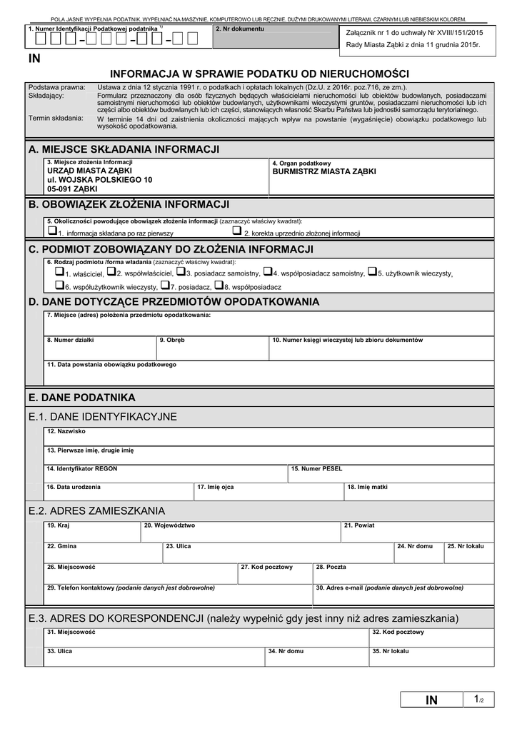 POLA JASNE WYPEŁNIA PODATNIK. WYPEŁNIAĆ NA MASZYNIE, KOMPUTEROWO LUB RĘCZNIE, DUŻYMI DRUKOWANYMI LITERAMI, CZARNYM LUB NIEBIESKIM KOLOREM. 1. Numer Identyfikacji Podatkowej podatnika 1) - - 2. Nr dokumentu Załącznik nr 1 do uchwały Nr XVIII/151/2015 - Rady Miasta Ząbki z dnia 11 grudnia 2015r. IN INFORMACJA W SPRAWIE PODATKU OD NIERUCHOMOŚCI Podstawa prawna: Składający: Termin składania: Ustawa z dnia 12 stycznia 1991 r. o podatkach i opłatach lokalnych (Dz.U. z 2016r. poz.716, ze zm.). Formularz przeznaczony dla osób fizycznych będących właścicielami nieruchomości lub obiektów budowlanych, posiadaczami samoistnymi nieruchomości lub obiektów budowlanych, użytkownikami wieczystymi gruntów, posiadaczami nieruchomości lub ich części albo obiektów budowlanych lub ich części, stanowiących własność Skarbu Państwa lub jednostki samorządu terytorialnego. W terminie 14 dni od zaistnienia okoliczności mających wpływ na powstanie (wygaśnięcie) obowiązku podatkowego lub wysokość opodatkowania. A. MIEJSCE SKŁADANIA INFORMACJI 3. Miejsce złożenia Informacji 4. Organ podatkowy URZĄD MIASTA ZĄBKI ul. WOJSKA POLSKIEGO 10 05-091 ZĄBKI BURMISTRZ MIASTA ZĄBKI B. OBOWIĄZEK ZŁOŻENIA INFORMACJI 1. informacja składana po raz pierwszy 2. korekta uprzednio złożonej informacji 5. Okoliczności powodujące obowiązek złożenia informacji (zaznaczyć właściwy kwadrat): C. PODMIOT ZOBOWIĄZANY DO ZŁOŻENIA INFORMACJI 1. właściciel, 2. współwłaściciel, 3. posiadacz samoistny, 4. współposiadacz samoistny, 5. użytkownik wieczysty, 6. współużytkownik wieczysty, 7. posiadacz, 8. współposiadacz 6. Rodzaj podmiotu /forma władania (zaznaczyć właściwy kwadrat): D. DANE DOTYCZĄCE PRZEDMIOTÓW OPODATKOWANIA 7. Miejsce (adres) położenia przedmiotu opodatkowania: 8. Numer działki 9. Obręb 10. Numer księgi wieczystej lub zbioru dokumentów 11. Data powstania obowiązku podatkowego E. DANE PODATNIKA E.1. DANE IDENTYFIKACYJNE 12. Nazwisko 13. Pierwsze imię, drugie imię 15. Numer PESEL 14. Identyfikator REGON 17. Imię ojca 16. Data urodzenia 18. Imię matki E.2. ADRES ZAMIESZKANIA 19. Kraj 22. Gmina 20. Województwo 21. Powiat 23. Ulica 26. Miejscowość 24. Nr domu 27. Kod pocztowy 29. Telefon kontaktowy (podanie danych jest dobrowolne) 25. Nr lokalu 28. Poczta 30. Adres e-mail (podanie danych jest dobrowolne) E.3. ADRES DO KORESPONDENCJI (należy wypełnić gdy jest inny niż adres zamieszkania) 31. Miejscowość 33. Ulica 32. Kod pocztowy 34. Nr domu 35. Nr lokalu IN 1/2 POLA JASNE WYPEŁNIA PODATNIK. WYPEŁNIAĆ NA MASZYNIE, KOMPUTEROWO LUB RĘCZNIE, DUŻYMI DRUKOWANYMI LITERAMI, CZARNYM LUB NIEBIESKIM KOLOREM. F. DANE DOTYCZĄCE PRZEDMIOTÓW OPODATKOWANIA NIEPODLEGAJĄCYCH ZWOLNIENIU F.1 POWIERZCHNIA GRUNTÓW 2 Podstawa opodatkowania w m /ha 1. Związane z prowadzeniem działalności gospodarczej, bez względu na sposób zakwalifikowania w ewidencji gruntów i budynków 36. 2. Pod wodami powierzchniowymi stojącymi lub wodami powierzchniowymi płynącymi jezior i zbiorników sztucznych (Powierzchnię należy podać z dokładnością do czterech miejsc po przecinku) należy podać z dokładnością do czterech miejsc po przecinku) 3.(Powierzchnię Pozostałe grunty, w tym zajęte na prowadzenie odpłatnej statutowej działalności pożytku 37. …………………………………………m2 …………………….,............................ha 38. publicznego przez organizacje pożytku publicznego ……………………………………….. m2 4. Niezabudowane objęte obszarem rewitalizacji, w którym mowa w ustawie z dnia 9 października 2015r. o rewitalizacji, i położone na terenach, dla których miejscowy plan zagospodarowania przestrzennego przewiduje przeznaczenie pod zabudowę mieszkaniową, usługową albo zabudowę o przeznaczeniu mieszanym obejmującym wyłącznie te rodzaje zabudowy, jeżeli od dnia wejścia w życie tego planu w odniesieniu do tych gruntów upłynął okres 4 lat, a w tym czasie nie zakończono budowy zgodnie z przepisami prawa budowlanego 39. ……………………………………….. m2 F.2. POWIERZCHNIA BUDYNKÓW LUB ICH CZĘŚCI Do powierzchni użytkowej budynku lub jego części należy zaliczyć powierzchnię mierzoną po wewnętrznej długości ścian na wszystkich kondygnacjach, z wyjątkiem powierzchni klatek schodowych oraz szybów dźwigowych. Za kondygnację uważa się również garaże podziemne, piwnice, sutereny i poddasza użytkowe. Podstawa opodatkowania w m2 1. Mieszkalne – ogółem, w tym: • kondygnacji o wysokości od 1,40 do 2,20 m 40. ……………………………………………m2 • kondygnacji o wysokości powyżej 2,20 m 41. ……………………………………………m 2 2. Związane z prowadzeniem działalności gospodarczej oraz części budynków mieszkalnych zajęte na prowadzenie działalności gospodarczej – ogółem, w tym: • kondygnacji o wysokości od 1,40 do 2,20 m 42. ……………………………………………m2 • kondygnacji o wysokości powyżej 2,20 m 43. ……………………………………………m 2 3. Zajęte na prowadzenie działalności gospodarczej w zakresie obrotu kwalifikowanym materiałem siewnym – ogółem, w tym: • kondygnacji o wysokości od 1,40 do 2,20 m 44. ……………………………………………m • kondygnacji o wysokości powyżej 2,20 m 45. ……………………………………………m 2 2 4. Związane z udzielaniem świadczeń zdrowotnych w rozumieniu przepisów o działalności leczniczej, zajęte przez podmioty udzielające tych świadczeń, w tym: • kondygnacji o wysokości od 1,40 do 2,20 m 46. …………………………………………….m • kondygnacji o wysokości powyżej 2,20 m 47. …………………………………………….m 2 2 5. Pozostałe, w tym zajęte na prowadzenie odpłatnej statutowej działalności pożytku publicznego przez organiza