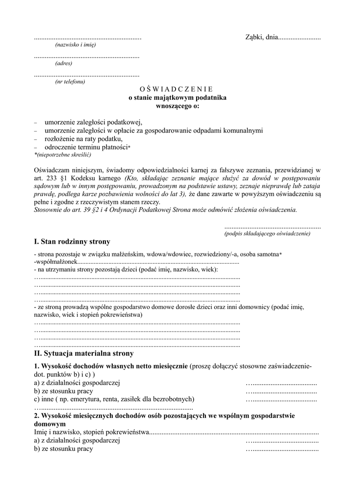 ............................................................ Ząbki, dnia........................ (nazwisko i imię) ........................................................... (adres) ........................................................... (nr telefonu) O ŚWIAD C ZEN I E o stanie majątkowym podatnika wnoszącego o: umorzenie zaległości podatkowej, umorzenie zaległości w opłacie za gospodarowanie odpadami komunalnymi rozłożenie na raty podatku, odroczenie terminu płatności* *(niepotrzebne skreślić) Oświadczam niniejszym, świadomy odpowiedzialności karnej za fałszywe zeznania, przewidzianej w art. 233 §1 Kodeksu karnego (Kto, składając zeznanie mające służyć za dowód w postępowaniu sądowym lub w innym postępowaniu, prowadzonym na podstawie ustawy, zeznaje nieprawdę lub zataja prawdę, podlega karze pozbawienia wolności do lat 3), że dane zawarte w powyższym oświadczeniu są pełne i zgodne z rzeczywistym stanem rzeczy. Stosownie do art. 39 §2 i 4 Ordynacji Podatkowej Strona może odmówić złożenia oświadczenia. ...................................................... (podpis składającego oświadczenie) I. Stan rodzinny strony - strona pozostaje w związku małżeńskim, wdowa/wdowiec, rozwiedziony/-a, osoba samotna * -współmałżonek................................................................................................... - na utrzymaniu strony pozostają dzieci (podać imię, nazwisko, wiek): ….......................................................................................................................... ….......................................................................................................................... ….......................................................................................................................... ….......................................................................................................................... - ze stroną prowadzą wspólne gospodarstwo domowe dorosłe dzieci oraz inni domownicy (podać imię, nazwisko, wiek i stopień pokrewieństwa) ….......................................................................................................................... ….......................................................................................................................... ….......................................................................................................................... ….......................................................................................................................... II. Sytuacja materialna strony 1. Wysokość dochodów własnych netto miesięcznie (proszę dołączyć stosowne zaświadczeniedot. punktów b) i c) ) a) z działalności gospodarczej ….................................... b) ze stosunku pracy ….................................... c) inne ( np. emerytura, renta, zasiłek dla bezrobotnych) ….................................... …..................................................................................... 2. Wysokość miesięcznych dochodów osób pozostających we wspólnym gospodarstwie domowym Imię i nazwisko, stopień pokrewieństwa............................................................................................... a) z działalności gospodarczej …..................................... b) ze stosunku pracy …..................................... c) inne ( np. emerytura, renta, zasiłek dla bezrobotnych) …..................................................................................... …..................................... Imię i nazwisko, stopień pokrewieństwa............................................................................................... a) z działalności gospodarczej …..................................... b) ze stosunku pracy …..................................... c) inne ( np. emerytura, renta, zasiłek dla bezrobotnych) …..................................... …..................................................................................... Imię i nazwisko, stopień pokrewieństwa............................................................................................... a) z działalności gospodarczej …..................................... b) ze stosunku pracy …..................................... c) inne ( np. emerytura, renta, zasiłek dla bezrobotnych) …..................................... …..................................................................................... 3. Posiadany majątek (nieruchomości gruntowe i budynki, własność/współwłasność, środki transportu i inne rzeczy o znacznej wartości) dom jednorodzinny …............................................................................................................................ …............................................................................................................................................................ mieszkanie spółdzielcze lokatorskie...................................................................................................... …............................................................................................................................................................ mieszkanie spółdzielcze własnościowe.................................................................................................. …............................................................................................................................................................ mieszkanie komunalne o powierzchni................................................................................................... …............................................................................................................................................................ mieszkanie własne o powierzchni................................................