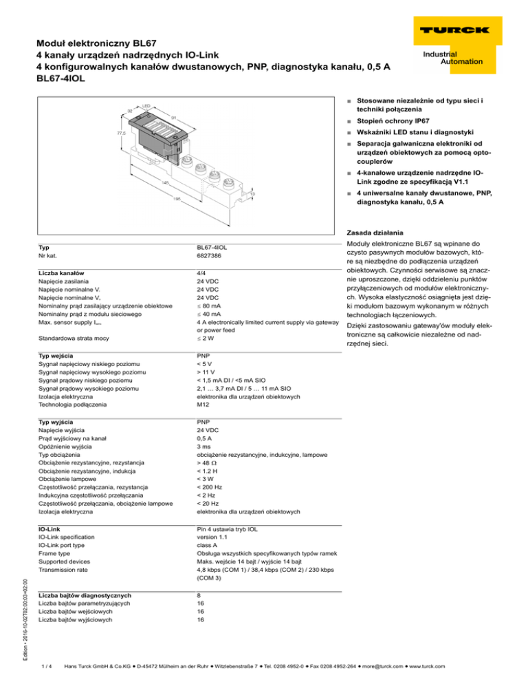 Moduł elektroniczny BL67 4 kanały urządzeń nadrzędnych IO-Link 4 konfigurowalnych kanałów dwustanowych, PNP, diagnostyka kanału, 0,5 A BL67-4IOL ■ Stosowane niezależnie od typu sieci i techniki połączenia ■ Stopień ochrony IP67 ■ Wskaźniki LED stanu i diagnostyki ■ Separacja galwaniczna elektroniki od urządzeń obiektowych za pomocą optocouplerów ■ 4-kanałowe urządzenie nadrzędne IOLink zgodne ze specyfikacją V1.1 ■ 4 uniwersalne kanały dwustanowe, PNP, diagnostyka kanału, 0,5 A Edition • 2016-10-02T02:00:03+02:00 Zasada działania Typ Nr kat. BL67-4IOL 6827386 Liczba kanałów Napięcie zasilania Napięcie nominalne Vi Napięcie nominalne Vo Nominalny prąd zasilający urządzenie obiektowe Nominalny prąd z modułu sieciowego Max. sensor supply Isens Standardowa strata mocy 4/4 24 VDC 24 VDC 24 VDC ð 80 mA ð 40 mA 4 A electronically limited current supply via gateway or power feed ð2W Typ wejścia Sygnał napięciowy niskiego poziomu Sygnał napięciowy wysokiego poziomu Sygnał prądowy niskiego poziomu Sygnał prądowy wysokiego poziomu Izolacja elektryczna Technologia podłączenia PNP <5V > 11 V < 1,5 mA DI / <5 mA SIO 2,1 … 3,7 mA DI / 5 … 11 mA SIO elektronika dla urządzeń obiektowych M12 Typ wyjścia Napięcie wyjścia Prąd wyjściowy na kanał Opóźnienie wyjścia Typ obciążenia Obciążenie rezystancyjne, rezystancja Obciążenie rezystancyjne, indukcja Obciążenie lampowe Częstotliwość przełączania, rezystancja Indukcyjna częstotliwość przełączania Częstotliwość przełączania, obciążenie lampowe Izolacja elektryczna PNP 24 VDC 0,5 A 3 ms obciążenie rezystancyjne, indukcyjne, lampowe > 48 ò < 1.2 H <3W < 200 Hz < 2 Hz < 20 Hz elektronika dla urządzeń obiektowych IO-Link IO-Link specification IO-Link port type Frame type Supported devices Transmission rate Pin 4 ustawia tryb IOL version 1.1 class A Obsługa wszystkich specyfikowanych typów ramek Maks. wejście 14 bajt / wyjście 14 bajt 4,8 kbps (COM 1) / 38,4 kbps (COM 2) / 230 kbps (COM 3) Liczba bajtów diagnostycznych Liczba bajtów parametryzujących Liczba bajtów wejściowych Liczba bajtów wyjściowych 8 16 16 16 1/4 Moduły elektroniczne BL67 są wpinane do czysto pasywnych modułów bazowych, które są niezbędne do podłączenia urządzeń obiektowych. Czynności serwisowe są znacznie uproszczone, dzięki oddzieleniu punktów przyłączeniowych od modułów elektronicznych. Wysoka elastyczność osiągnięta jest dzięki modułom bazowym wykonanym w różnych technologiach łączeniowych. Dzięki zastosowaniu gateway'ów moduły elektroniczne są całkowicie niezależne od nadrzędnej sieci. Hans Turck GmbH & Co.KG ñ D-45472 Mülheim an der Ruhr ñ Witzlebenstraße 7 ñ Tel. 0208 4952-0 ñ Fax 0208 4952-264 ñ [email protected] ñ www.turck.com Moduł elektroniczny BL67 4 kanały urządzeń nadrzędnych IO-Link 4 konfigurowalnych kanałów dwustanowych, PNP, diagnostyka kanału, 0,5 A BL67-4IOL Dimensions (W x L x H) Certyfikaty Temperatura pracy Temperatura składowania Wilgotność względna Test wibracyjny Zwiększona odporność na wibracje - do 5 g (przy 10 do 150 Hz) - do 20 g (przy 10 do 150 Hz) Test przeciążeniowy/wstrząsowy Spadek i powrót Montaż na szynie DIN bez konieczności wiercenia zgodnie z EN 60715, uchwyt zakończeniowy Instalacja na płycie bazowej lub w dowolnym miejscu obok maszyny. W takim wypadku każdy kolejny moduł montowany jest za pomocą dwóch śrub. zgodnie z IEC 68-2-27 zgodnie z IEC 68-2-31 oraz częściowo z IEC 68-2-32 zgodnie z EN 61131-2 IP67 393 rok/lata zgodnie z SN 29500 (Ed. 99) 20 °C 0.9…1.2 Nm Edition • 2016-10-02T02:00:03+02:00 Kompatybilność elektromagnetyczna Klasa ochrony MTTF Tightening torque fixing screw 32 x 91 x 59mm CE, cULus, GOST -40…+70 °C -40…+85 °C 5 do 95 % (wewnętrznie), poziom RH-2, bez kondensacji (składowanie w temp. 45 °C) zgodnie z EN 61131 2/4 Hans Turck GmbH & Co.KG ñ D-45472 Mülheim an der Ruhr ñ Witzlebenstraße 7 ñ Tel. 0208 4952-0 ñ Fax 0208 4952-264 ñ [email protected] ñ www.turck.com Moduł elektroniczny BL67 4 kanały urządzeń nadrzędnych IO-Link 4 konfigurowalnych kanałów dwustanowych, PNP, diagnostyka kanału, 0,5 A BL67-4IOL kompatybilny moduł bazowy Rysunek wymiarowy Type Konfiguracja pinów Edition • 2016-10-02T02:00:03+02:00 BL67-B-4M12 6827187 4 x M12, 5-pinów, żeńskie Pin configuration 3/4 Hans Turck GmbH & Co.KG ñ D-45472 Mülheim an der Ruhr ñ Witzlebenstraße 7 ñ Tel. 0208 4952-0 ñ Fax 0208 4952-264 ñ [email protected] ñ www.turck.com Moduł elektroniczny BL67 4 kanały urządzeń nadrzędnych IO-Link 4 konfigurowalnych kanałów dwustanowych, PNP, diagnostyka kanału, 0,5 A BL67-4IOL LED display LED Color D CZERWONY Status Meaning wył. Brak informacji o błędzie lub trwa diagnostyka. zał. Błąd komunikacja MODBUS. Sprawdź czy odłączone zostały więcej niż dwa sąsiadujące moduły elektroniczne. Należy ich poszukiwać między gateway'em a bieżącym modułem. CZERWONY MIGANIE (0,5 Hz) Następująca diagnostyka modułu wył. Stan kanału x = 0 (wył.) ZIELONY MIGANIE Aktywna komunikacja IO-Link, CZERWONY zał. CZERWONY MIGANIE Kanały IO-Link 0…3 Tryb IO-Link poprawne dane procesowe Brak komunikacji IO-Link i/lub błąd modułu, niepoprawne dane procesowe Aktywna komunikacja IO-Link i/lub błąd modułu, niepoprawne dane procesowe Kanały IO-Link wył. Stan kanału x = 0 (wył.) zał. Stan kanału x = 1 (zał.) wył. Stan kanału x = 0 (wył.) ZIELONY zał. Stan kanału x = 1 (zał.) CZERWONY MIGANIE (0,5 Hz) Zwarcie kanału wyjścia x 0…3 Tryb SIO ZIELONY Kanały XSG 4…7 Kompatybilne gateway'e Nr katalogo- Typ Komunikacja 6827232 BL67-GW-DPV1 PROFIBUS-DP FW v1.27 System PLC z masterem PROFIBUS-DP. 6827214 BL67-GW-EN PROFINET FW v3.0.9.0 Wieloprotokołowa brama komunikacyjna Ethernet dla PROFINET, Ether- wy Wersja lub wyż- Aplikacja sza EtherNet/IP™ Net/IP™ lub urządzenia nadrzędnego Modbus TC