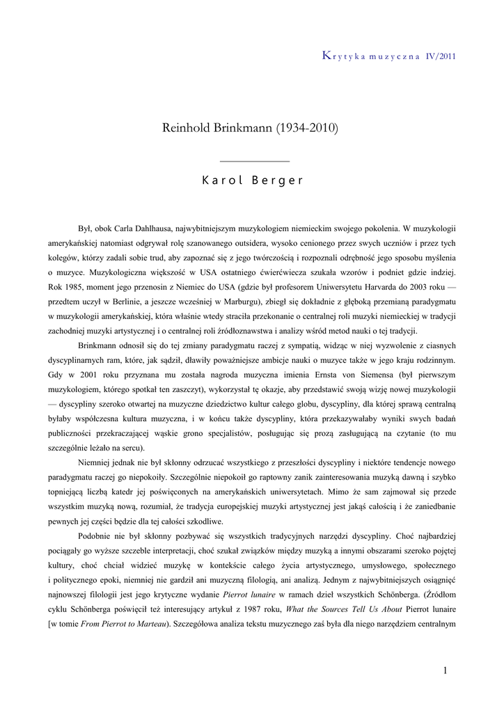 Kr y t y k a m u z y c z n a IV/2011 Reinhold Brinkmann (1934-2010) Karol Berger Był, obok Carla Dahlhausa, najwybitniejszym muzykologiem niemieckim swojego pokolenia. W muzykologii amerykańskiej natomiast odgrywał rolę szanowanego outsidera, wysoko cenionego przez swych uczniów i przez tych kolegów, którzy zadali sobie trud, aby zapoznać się z jego twórczością i rozpoznali odrębność jego sposobu myślenia o muzyce. Muzykologiczna większość w USA ostatniego ćwierćwiecza szukała wzorów i podniet gdzie indziej. Rok 1985, moment jego przenosin z Niemiec do USA (gdzie był profesorem Uniwersytetu Harvarda do 2003 roku — przedtem uczył w Berlinie, a jeszcze wcześniej w Marburgu), zbiegł się dokładnie z głęboką przemianą paradygmatu w muzykologii amerykańskiej, która właśnie wtedy straciła przekonanie o centralnej roli muzyki niemieckiej w tradycji zachodniej muzyki artystycznej i o centralnej roli źródłoznawstwa i analizy wśród metod nauki o tej tradycji. Brinkmann odnosił się do tej zmiany paradygmatu raczej z sympatią, widząc w niej wyzwolenie z ciasnych dyscyplinarnych ram, które, jak sądził, dławiły poważniejsze ambicje nauki o muzyce także w jego kraju rodzinnym. Gdy w 2001 roku przyznana mu została nagroda muzyczna imienia Ernsta von Siemensa (był pierwszym muzykologiem, którego spotkał ten zaszczyt), wykorzystał tę okazje, aby przedstawić swoją wizję nowej muzykologii — dyscypliny szeroko otwartej na muzyczne dziedzictwo kultur całego globu, dyscypliny, dla której sprawą centralną byłaby współczesna kultura muzyczna, i w końcu także dyscypliny, która przekazywałaby wyniki swych badań publiczności przekraczającej wąskie grono specjalistów, posługując się prozą zasługującą na czytanie (to mu szczególnie leżało na sercu). Niemniej jednak nie był skłonny odrzucać wszystkiego z przeszłości dyscypliny i niektóre tendencje nowego paradygmatu raczej go niepokoiły. Szczególnie niepokoił go raptowny zanik zainteresowania muzyką dawną i szybko topniejącą liczbą katedr jej poświęconych na amerykańskich uniwersytetach. Mimo że sam zajmował się przede wszystkim muzyką nową, rozumiał, że tradycja europejskiej muzyki artystycznej jest jakąś całością i że zaniedbanie pewnych jej części będzie dla tej całości szkodliwe. Podobnie nie był skłonny pozbywać się wszystkich tradycyjnych narzędzi dyscypliny. Choć najbardziej pociągały go wyższe szczeble interpretacji, choć szukał związków między muzyką a innymi obszarami szeroko pojętej kultury, choć chciał widzieć muzykę w kontekście całego życia artystycznego, umysłowego, społecznego i politycznego epoki, niemniej nie gardził ani muzyczną filologią, ani analizą. Jednym z najwybitniejszych osiągnięć najnowszej filologii jest jego krytyczne wydanie Pierrot lunaire w ramach dzieł wszystkich Schönberga. (Źródłom cyklu Schönberga poświęcił też interesujący artykuł z 1987 roku, What the Sources Tell Us About Pierrot lunaire [w tomie From Pierrot to Marteau). Szczegółowa analiza tekstu muzycznego zaś była dla niego narzędziem centralnym 1 Kr y t y k a m u z y c z n a IV/2011 od samego początku, od czasów pracy doktorskiej, Arnold Schönberg, Drei Klavierstücke Op. 11: Studien zur frühen Atonalität bei Schönberg, która ukazała się w formie książkowej w 1967 roku (i ponownie w roku 2000). Ani filologia jednak, ani analiza, nie były dlań celem samym dla siebie. Były raczej koniecznym, niepomijalnym wstępem do spraw naprawdę istotnych — do rozumiejącej interpretacji dzieła, interpretacji, w której dzieło miało współbrzmieć z całym życiem duchowym, społecznym i politycznym swego czasu. Zajmował się głównie tradycją muzyczną niemieckiego obszaru językowego w dziewiętnastym i dwudziestym wieku. Szczególnym zainteresowaniem darzył trzy wątki tej tradycji. Po pierwsze, od początku w centrum jego uwagi znalazła się druga szkoła wiedeńska. Wspomnianemu już dziełu Schönberga poświęcił w 1997 roku piękny szkic, The Fool as Paradigm: Schönberg’s Pierrot Lunaire and the Modern Artist (w tomie Schoenberg and Kandinsky: An Historic Encounter). Drugim obszarem, do którego często wracał, była symfonika dziewiętnastego wieku. Eroice poświęcił jedno ze swych najważniejszy studiów, Die Zeit der Eroica (w tomie Musik in der Zeit, Zeit in der Musik, 2000) — szkic, który jest owocną i inspirującą próbą zastosowania do wyników analizy muzycznej pojęcia „przyspieszenia”, którym historyk Reinhard Kosseleck charakteryzuje poczucie historii na przełomie dziewiętnastego wieku. Prawdziwą lekcją metody Brinkmanna jest jego książka o Drugiej Symfonii Brahmsa (1990), gdzie analiza paru niespodziewanie pochmurnych taktów z na ogół idyllicznej pierwszej części symfonii prowadzi poprzez rozważania o melancholijnym temperamencie kompozytora do znaczenia melancholii w kulturze drugiej połowy dziewiętnastego wieku. Inspirując się pracą socjologa Wolfa Lepeniesa, Brinkmann uprawia tu swoistą antropologię nastrojów, wiążąc bardzo konkretne cechy dzieła Brahmsa nie tylko z jego prywatną strukturą psychiczną, ale — co ważniejsze — z duchową strukturą jego czasu i miejsca, także miejsca w historii muzyki. Trzecią wreszcie dziedziną, której Brinkmann poświęcał szczególną uwagę, była pieśń romantyczna. Był człowiekiem o wysokiej kulturze literackiej i słuchając pieśni Schuberta albo Schumanna, wrażliwy był w równym stopniu na ich muzykę co na słowa ich poetów (pod tym względem nie naśladował Schönberga, który przyznał kiedyś z nieukrywaną satysfakcją, że nie ma pojęcia, o czym mówią słowa jego ulubionych pieśni Schuberta). Jego lektura pieśni Mondnacht w książce o cyklu Eichendorffa, Schumann und Eichendorff: Studien zum Liederkreis Op. 39 (1997), jest wielka lekcja uważnego i wrażliwe