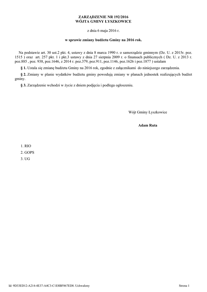 ZARZĄDZENIE NR 192/2016 WÓJTA GMINY ŁYSZKOWICE z dnia 6 maja 2016 r. w sprawie zmiany budżetu Gminy na 2016 rok. Na podstawie art. 30 ust.2 pkt. 4, ustawy z dnia 8 marca 1990 r. o samorządzie gminnym (Dz. U. z 2015r. poz. 1515 ) oraz art. 257 pkt. 1 i pkt.3 ustawy z dnia 27 sierpnia 2009 r. o finansach publicznych ( Dz. U. z 2013 r. poz.885 , poz. 938, poz.1646, z 2014 r. poz.379, poz.911, poz.1146, poz.1626 i poz.1877 ) ustalam § 1. Ustala się zmianę budżetu Gminy na 2016 rok, zgodnie z załącznikami do niniejszego zarządzenia. § 2. Zmiany w planie wydatków budżetu gminy powodują zmiany w planach jednostek realizujących budżet gminy. § 3. Zarządzenie wchodzi w życie z dniem podjęcia i podlega ogłoszeniu. Wójt Gminy Łyszkowice Adam Ruta 1. RIO 2. GOPS 3. UG Id: 9D33ED12-A214-4E37-A4C3-C1E8BF867ED8. Uchwalony Strona 1 Załącznik Nr 1 do Zarządzenia Nr 192/2016 Wójta Gminy Łyszkowice z dnia 6 maja 2016 r. dział rozdział § nazwa Dochody Pomoc społeczna pozostała działalność 2010 dotacje celowe przekazane z budżetu państwa na realizację zadań bieżących z zakresu administarcji rządowej oraz innych zadań zleconych gminom 852 85295 852 Pomoc społeczna świadczenie wychowawcze 85211 2060 Dotacje celowe otrzymane z budżetu państwa na zadania bieżące z zakresu administracji rządowej zlecone gminom (związkom gmin, związkom powiatowo-gminnym), związane z realizacją świadczenia wychowawczego stanowiącego pomoc państwa w wychowywaniu dzieci Id: 9D33ED12-A214-4E37-A4C3-C1E8BF867ED8. Uchwalony zmniejszenia zwiększenia 2 974 672,00 2 974 672,00 2 974 672,00 2 974 672,00 2 974 672,00 2 974 672,00 2 974 672,00 Strona 1 Załącznik Nr 2 do Zarządzenia Nr 192/2016 Wójta Gminy Łyszkowice z dnia 6 maja 2016 r. dział rozdział 852 85295 852 85211 § nazwa Wydatki Pomoc społeczna pozostała działalność wynagrodzenia i składki od nich naliczane świadczenia na rzecz osób fizycznych wydatki bieżące związane z działalnością statutową Pomoc społeczna świadczenie wychowawcze wynagrodzenia i składki od nich naliczane świadczenia na rzecz osób fizycznych wydatki bieżace związane z działanością statutową zmniejszenia zwiększenia 2 974 672,00 2 974 672,00 2 974 672,00 41 055,00 2 903 357,00 30 260,00 2 974 672,00 2 974 672,00 41 055,00 2 903 357,00 30 260,00 Pismo Nr FN-I.3113.2.60.2016 Id: 9D33ED12-A214-4E37-A4C3-C1E8BF867ED8. Uchwalony Strona 1