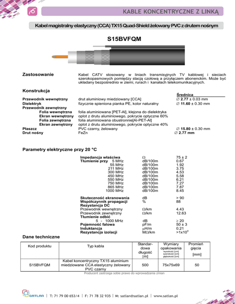 Kabel magistralny elastyczny (CCA) TX15 Quad-Shield żelowany PVC z drutem nośnym S15BVFQM Zastosowanie Kabel CATV stosowany w liniach transmisyjnych TV kablowej i sieciach szerokopasmowych pomiędzy stacją czołową a przyłączem abonenckim. Może być układany bezpośrednio w ziemi, rurach i kanałach telekomunikacyjnych. Konstrukcja Przewodnik wewnętrzny Dielektryk Przewodnik zewnętrzny Folia wewnętrzna Ekran wewnętrzny Folia zewnętrzna Ekran zewnętrzny Płaszcz Drut nośny Średnica 2.77 ± 0.03 mm 11.60 ± 0.30 mm drut aluminiowy miedziowany [CCA] fizycznie spieniona pianka PE, kolor naturalny folia aluminiowana [PET-Al], klejona do dielektryka oplot z drutu aluminiowego, pokrycie optyczne 60% folia aluminiowana obustronnie[Al-PET-Al] oplot z drutu aluminiowego, pokrycie optyczne 40% PVC czarny, żelowany FeZn 15.80 ± 0.30 mm 2.77 mm Parametry elektryczne przy 20 °C Impedancja właściwa Tłumienie przy 5 MHz 55 MHz 211 MHz 300 MHz 450 MHz 550 MHz 750 MHz 865 MHz 1000 MHz dB/100m dB/100m dB/100m dB/100m dB/100m dB/100m dB/100m dB/100m dB/100m 75 ± 2 0.67 1.92 3.75 4.53 5.58 6.21 7.27 7.87 8.45 Skuteczność ekranowania Współczynnik propagacji Rezystancja DC Przewodnik wewnętrzny Przewodnik zewnętrzny Tłumienie odbić 5 - 1000 MHz Pojemność falowa Induktancja Rezystancja izolacji dB % > 90 88 /km /km 4.43 12.63 dB pF/m H/m M/km 20 50 ± 3 0.21 4 >1x10 Dane techniczne Kod produktu S15BVFQM Typ kabla Kabel koncentryczny TX15 aluminium miedziowane CCA elastyczny żelowany PVC czarny Promień gięcia Standardowa długość [m] Wymiary opakowania wysokość [cm] szerokość [cm] głębokość [cm] [mm] 500 75x75x69 50 Producent zastrzega sobie prawo do wprowadzania zmian .