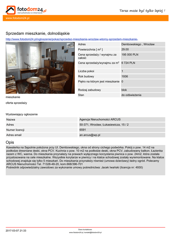 Teraz może być tylko lepiej ! www.fotodom24.pl Sprzedam mieszkanie, dolnośląskie http://www.fotodom24.pl/ogloszenie/pokaz/sprzedaz-mieszkanie-wroclaw-wtorny-sprzedam-mieszkanieAdres Dembowskiego , Wrocław Powierzchnia [ m2 ] 29.00 Cena sprzedaży / wynajmu za całość 195 000 PLN Cena sprzedaży/wynajmu za m2 6 724 PLN Liczba pokoi 1 Rok budowy 1936 Piętro na którym jest mieszkanie 0 mieszkanie Rodzaj zabudowy blok Stan do odświeżenia oferta sprzedaży Wystawiający ogłoszenie Nazwa Agencja Nieruchomości ARCUS Adres 50-371, Wrocław, Łukasiewicza, 15 / 2 Numer licencji 6591 Adres email [email protected] Opis Kawalerka na Sępolnie położona przy Ul. Dembowskiego, okna od strony cichego podwórka. Pokój o pow. 14 m2 na podłodze drewniane deski, okna PCV. Kuchnia o pow. 10 m2 na podłodze deski, okna PCV, zabudowany balkon. Łazienka razem z WC, wanna. Do mieszkania przynależy na prawach wyłącznego korzystania piwnica o pow. 24m2, która została przystosowana na cele mieszkalne. Wszystkie korytarze w piwnicy i na klatce schodowej zostały wyremontowane. Na klatce schodowej znajduje się tylko 5 mieszkań. Do mieszkania przynależy również (umowa dzierżawy) ładny ogród. Polecamy ARCUS Nieruchomości Tel. 71328-48-20, kom.668/396-701 Pośrednik odpowiedzialny zawodowo za wykonanie umowy pośrednictwa: Jacek Iwański (licencja nr: 4930) 2017-03-07 21:33 Dane kontaktowe: www.fotodom24.pl, [email protected]