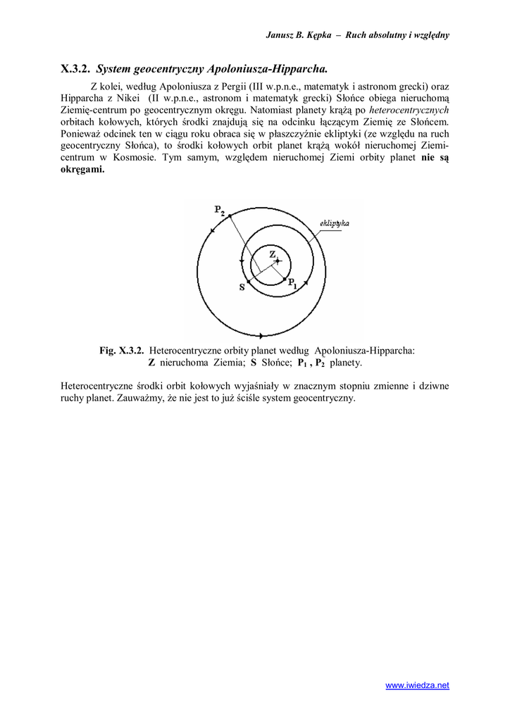 Janusz B. Kępka – Ruch absolutny i względny X.3.2. System geocentryczny Apoloniusza-Hipparcha. Z kolei, według Apoloniusza z Pergii (III w.p.n.e., matematyk i astronom grecki) oraz Hipparcha z Nikei (II w.p.n.e., astronom i matematyk grecki) Słońce obiega nieruchomą Ziemię-centrum po geocentrycznym okręgu. Natomiast planety krążą po heterocentrycznych orbitach kołowych, których środki znajdują się na odcinku łączącym Ziemię ze Słońcem. Ponieważ odcinek ten w ciągu roku obraca się w płaszczyźnie ekliptyki (ze względu na ruch geocentryczny Słońca), to środki kołowych orbit planet krążą wokół nieruchomej Ziemicentrum w Kosmosie. Tym samym, względem nieruchomej Ziemi orbity planet nie są okręgami. Fig. X.3.2. Heterocentryczne orbity planet według Apoloniusza-Hipparcha: Z nieruchoma Ziemia; S Słońce; P1 , P2 planety. Heterocentryczne środki orbit kołowych wyjaśniały w znacznym stopniu zmienne i dziwne ruchy planet. Zauważmy, że nie jest to już ściśle system geocentryczny. www.iwiedza.net