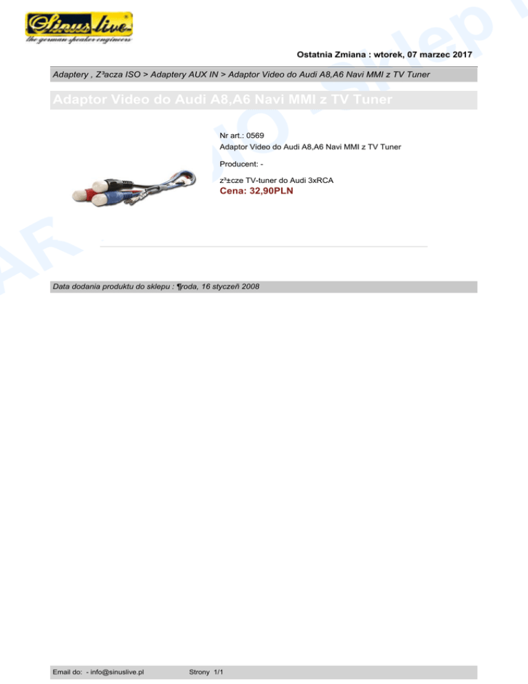 e l k -S i p Ostatnia Zmiana : wtorek, 07 marzec 2017 Adaptery , Z³acza ISO > Adaptery AUX IN > Adaptor Video do Audi A8,A6 Navi MMI z TV Tuner Adaptor Video do Audi A8,A6 Navi MMI z TV Tuner O I D Nr art.: 0569 Adaptor Video do Audi A8,A6 Navi MMI z TV Tuner Producent: - A U A R z³±cze TV-tuner do Audi 3xRCA Cena: 32,90PLN Data dodania produktu do sklepu : ¶roda, 16 styczeñ 2008 Email do: - [email protected] Strony 1/1