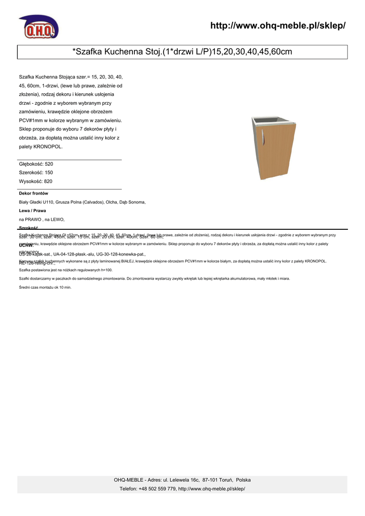 http://www.ohq-meble.pl/sklep/ *Szafka Kuchenna Stoj.(1*drzwi L/P)15,20,30,40,45,60cm Szafka Kuchenna Stojąca szer.= 15, 20, 30, 40, 45, 60cm, 1-drzwi, (lewe lub prawe, zależnie od złożenia), rodzaj dekoru i kierunek usłojenia drzwi - zgodnie z wyborem wybranym przy zamówieniu, krawędzie oklejone obrzeżem PCV#1mm w kolorze wybranym w zamówieniu. Sklep proponuje do wyboru 7 dekorów płyty i obrzeża, za dopłatą można ustalić inny kolor z palety KRONOPOL. Głębokość: 520 Szerokość: 150 Wysokość: 820 Dekor frontów Biały Gładki U110, Grusza Polna (Calvados), Olcha, Dąb Sonoma, Lewa / Prawa na PRAWO , na LEWO, Szrokość Szafka Kuchenna Stojąca Gł.=52cm, szer.= 15, 20, 30, 40, 45, 60cm, 1-drzwi, (lewe lub prawe, zależnie od złożenia), rodzaj dekoru i kierunek usłojenia drzwi - zgodnie z wyborem wybranym przy szer. 30 cm, szer. 45cm, szer. 15 cm, szer. 20 cm, szer. 40cm, Szer. 60 cm, zamówieniu, krawędzie oklejone obrzeżem PCV#1mm w kolorze wybranym w zamówieniu. Sklep proponuje do wyboru 7 dekorów płyty i obrzeża, za dopłatą można ustalić inny kolor z palety UCHW. KRONOPOL. US-26-kajak-sat., UA-04-128-płask.-alu, UG-30-128-konewka-pat., Korpusy szafek kuchennych wykonane są z płyty laminowanej BIAŁEJ, krawędzie oklejone obrzeżem PCV#1mm w kolorze białym, za dopłatą można ustalić inny kolor z palety KRONOPOL. RE-128-reling-chr., Szafka postawiona jest na nóżkach regulowanych h=100. Szafki dostarczamy w paczkach do samodzielnego zmontowania. Do zmontowania wystarczy zwykły wkrętak lub lepiej wkrętarka akumulatorowa, mały młotek i miara. Średni czas montażu ok 10 min. OHQ-MEBLE - Adres: ul. Lelewela 16c, 87-101 Toruń, Polska Telefon: +48 502 559 779, http://www.ohq-meble.pl/sklep/