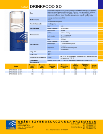 NAZWA DRINKFOOD SD Opis Uniwersalny wąż ssawno-tłoczny do płynnych substancji spożywczych jak soki i napoje z niewielką zawartością alkoholu. Warstwa wewnętrzna biała i gładka, wykonana z wysokiej jakości gumy EPDM. Warstwa zewnętrzna gładka, odporna na ścieranie, ozon i warunki atmosferyczne. Wyrób zgodny z FDA. Zastosowania - napoje alkoholowe do 15% - soki - substancje spożywcze Konstrukcja węża - wąż z gumy Warstwa wew. Wzmocnienie Warstwa zew. kolor - biały rodzaj materiału - guma EPDM technologia - gładka rodzaj - ssawno-tłoczny technologia - kord syntetyczny - spirala stalowa kolor - niebieski rodzaj materiału - guma EPDM technologia - z odciskiem tekstylnym odporność - na ozon - na warunki atmosferyczne - na ścieranie temp. min. -30°C temp. max. 120°C Czyszczenie/Sterylizacja Uwagi Certyfikaty i dopuszczenia Spełnia wymogi FDA 21.177.2600 dla płynnych substancji spożywczych. Wąż może być poddawany sterylizacji parą wodną nasyconą o temperaturze 140° C. DRINKFOOD SD-051 51 63 10 30 Mini. Mini. promień promień zagięcia zagięcia (mm) (mm) 255 DRINKFOOD SD-076 76 88 10 30 380 40 3.00 DRINKFOOD SD-100 100 113 10 30 500 40 3.43 Index Index Średnica wew. (mm) Średnica zew. (mm) Ciśnienie robocze (bar) Ciśnienie rozrywające (bar) Standard. Standard. długość długość rolki rolki (m) (m) 40 Ciężar Ciężar (kg/m) (kg/m) 1.61 WĘŻE I SZYBKOZŁĄCZA DLA PRZEMYSŁU TICON sp. zo.o. 62-020 Swarzędz Jasin ul. Poznańska 37 www.ticon.pl Sekretariat: Dane aktualne na dzień 2017-03-07 tel. 061 81 87 230 fax. 061 81 87 231 Dział handlowy: tel. 061 81 87 234 fax. 061 81 87 235