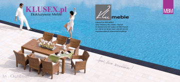 Galeria POLSKIE MEBLE Salon Meblowy Klu-meble – Poznań Al. Solidarności 34/I piętro | 61-696 Poznań tel. +48 61 657 68 62 | kom +48 607 615 255 www.klumeble.pl | [email protected] lewy moduł | model 68.0311 85 × 183 × 66 cm Cena: 3.689,- materac: 579,- wymiary prawy moduł | model 68.0312 85 × 183 × 66 cm Cena: 3.689,- materac: 579,- wymiary consola | model 68.0313 34 × 174 × 44 cm Cena: 2.419,- wymiary parasol écru | model 66.00.0038 ∅ 330 × 271 cm Cena: 1.999,- wymiary Madrigal Relax 2 Madrigal Dining fotel | model 68.0316 63 × 66 × 88 cm Cena: 1.059,- wymiary poduszka | model 10.0845 50 × 46 × 4 cm Cena: 99,- wymiary stół | model 72.0105 wymiary 180 × 100 × 75 cm Cena: 3.999 stół | model 72.0207 wymiary 180 × 100 × 75 cm Cena: 3.999,- stół | model 72.0211 wymiary 220 × 100 × 75 cm Cena: 4.419,- 3 moduł narożny model 68.0305 wymiary 95 × 95 Cena: 2.399,- Madrigal Lounge 4 × 70 cm poduszka moduł narożny siedziskowa : 250,oparciowa: 250,- moduł Środkowy model 68.0306 wymiary 75 × 95 × 70 cm Cena: 1.999,- poduszka moduł Środkowy siedziskowa : 250,oparciowa: 250,- fotel | model 68.0304 100 × 95 × 70 cm Cena: 2.849,- wymiary stół | model 68.0309 wymiary 60 × 87 × 31 cm Cena: 1.199,- szyba: 249,- stół | model 68.0307 wymiary 87 × 87 × 31 cm Cena: 1.449 szyba: 319,- 5 Tortuga Tobacco fotel | model 68.0336 61 × 62 × 86 cm Cena: 1.129,poduszka: 99,- wymiary fotel | model 68.0426 61 × 62 × 86 cm Cena: 1.129,poduszka: 99,- wymiary stół | model 72.0102 wymiary 160 × 90 × 74 cm Cena: 2.849,- 6 Bellini Rondo Tobac- fotel | model 68.0320 62 × 60 × 85 cm Cena: 889,- wymiary poduszka | siedziskowa Cena: 89,- stół | model 68.0338 wymiary 90 × 90 × 74 cm Cena: 2.399,- Stół | model 68.0342 wymiary 160 × 90 × 74 cm Cena: 2.849,- 7 Bellini Rondo Koala fotel | model 68.0503 62 × 60 × 85 cm Cena: 949,poduszka: 89,- wymiary 8 stół | model 72.0202 wymiary 90 × 90 × 74 cm Cena: 2.259,- stół | model 72.0203 wymiary 160 × 90 × 74 cm Cena: 2.849,- Balou Koala fotel | model 68.0514 66 × 68 × 90 cm Cena: 969,- wymiary poduszka | siedziskowa Cena: 99,- Stół | model 72.0210 wymiary 200 × 100 × 76 cm Cena: 4.419,- Stół | model 72.0102 wymiary 160 × 90 × 74 cm Cena: 2.849,- 9 Bistro Bellini Rondo Mocca fotel | model 68.0181 62 × 62 × 85 cm Cena: 799,poduszka: 89,- wymiary stelaż składany model 76.0001 wymiary wysokość Cena: 639,- 73 cm blat | model 76.0030 wymiary 75 × 75 cm Cena: 799,- Stół | model 68.0196 wymiary 90 × 90 × 74 cm Cena: 2.419,- Stół | model 72.0102 wymiary 160 × 90 × 74 cm 10 blat | model 76.0014 wymiary ∅ 75 cm Cena: 799,- Cena: 2.849,- 11 Bellini Dining Mocca fotel | model 68.0102 59 × 62 × 93 cm Cena: 639,- wymiary 12 poduszka siedziskowa Cena: 99,- Bellini Lounge Mocca stół | model 68.0110 wymiary 160 × 90 × 74 cm Cena: 2.639,- Stół rozkładany | model 68.0184 180 / 240 × 100 × 75 cm Cena: 4.419,- wymiary fotel model 68.0116 wymiary 90 × 90 × 65 cm Cena: 2.259,- moduł narożny model 68.0118 wymiary 90 × 90 × 65 cm Cena: 1.999,- moduł Środkowy model 68.0117 wymiary 75 × 90 × 65 cm Cena: 1.599,- Poduszka siedziskowa : 250,oparciowa: 250,- stół | model 68.0119 wymiary 60 × 90 × 32 cm Cena: 1.199,- szyba: 249,- stół | model 68.0120 wymiary 90 × 90 × 32 cm Cena: 1.369,- szyba: 319,- 13 Szezlong Wellnes Leżak Bellini leżak | model 68.0502 77 × 205 × 53 cm Cena: 3.059,- wymiary leżak | model 68.0327 77 × 205 × 53 cm Cena: 2.849,- wymiary leżak | model 68.0104 77 × 205 × 53 cm Cena: 2.419,- wymiary Materac do leżaka Cena: 399,- szezlong | model 68.0335 70 × 200 × 26 cm Cena: 2.639,- wymiary 14 Materac do szezlongu Cena: 399,- Stolik | model 68.0328 50 × 50 × 45 cm Cena: 799,- wymiary Stolik | model 68.0195 50 × 50 × 45 cm Cena: 1.049,- wymiary 15 Huśtawka Heaven Swing Spa szezlong Podwójny model 68.0164 wymiary 110 × 164 cm Cena: 2.399,- 16 szezlong Podwójny model 68.0314 wymiary 110 × 164 cm Cena: 2.849 Materac do szezlongu Cena: 1.599,- stelaż Aluminiowy model 70.0324 wymiary 180 × 190 Cena: 3.059,- × 275 cm daszek do szezlongu Cena: 729,- Huśtawka Heaven Swing 17 Romeo Elegance Romeo Fotel | model 65.0109 55 × 61 × 87 cm Cena: 399,- wymiary 18 poduszka | écru siedzisko | oparcie Cena: 169,- poduszka czerwona poduszka | écru poduszka | ascot Fotel | model 65.0202 58 × 62 × 100 cm Cena: 559,- wymiary poduszka | écru siedzisko | oparcie Cena: 199,- stół | model 65.0220 wymiary 75 × 75 × 73 cm Cena: 639,- stół rozkładany model 65.0207 wymiary 165 / 215 × 100 × 73 cm Cena: 3.059,- stół | model 65.0110 wymiary 160 × 90 × 73 cm Cena: 1.199,- stół | model wymiary 125 × Cena: 799,- 65.0222 75 × 73 cm 19 Pawilon Romeo Romantik Romeo Rondo fotel | model 65.0212 63 × 58 × 82 cm Cena: 599,poduszka: 319,- wymiary 20 stół | model 65.0214 wymiary ∅ 110 × 73 cm Cena: 2.499,- stół | model 65.0118 wymiary ∅ 100 × 73 cm Cena: 729,- barek | model 65.0215 65 × 94 × 82 cm Cena: 1.059,- wymiary pawilon | model 65.0204 300 × 300 × 320 cm Cena: 4.849,Cena kompletu: 7.247,- wymiary zasłony 68.0205 Cena: 799,- model ścianki boczne Cena: 1.599,- 21 Leżak Romeo leżak | model 65.0108 69 × 186 × 72 cm Cena: 1.199,- wymiary Pawilon Romeo Elegance pawilon | model 65.0200 350 × 350 × 330 cm Cena: 4.849,Cena kompletu: 6.198,- wymiary materac écru do leżaka Cena: 289 fotel | model 65.0202 58 × 62 × 100 cm Cena: 559,- wymiary stolik | model 65.0208 50 × 50 × 50 cm Cena: 319,- wymiary stół rozkładany model 65.0207 wymiary 165 / 215 × Cena: 3.059,- 22 zasłony 68.0201 Cena: 1.689,- model poduszka | écru siedzisko | oparcie Cena: 199,- 100 × 73 cm 23 Romeo dodatki lampa finca model 67.0028 wymiary 26 × 26 kwietnik flores × 108 cm Cena: 369,lampa finca model 67.0029 wymiary 26 × 26 × 156 cm Cena: 419,- kwietnik scala model 65.0115 wymiary 60 × 60 Cena: 399,- × 60 cm model 65.0113 wymiary 55 × 55 Cena: 199,- × 102 cm Par