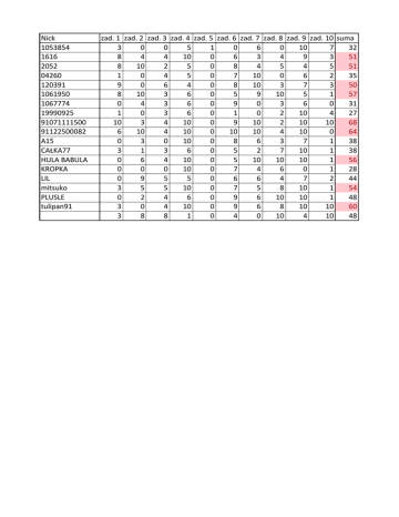 Nick zad. 1 zad. 2 zad. 3 zad. 4 zad. 5 zad. 6 zad. 7 zad. 8 zad. 9 zad