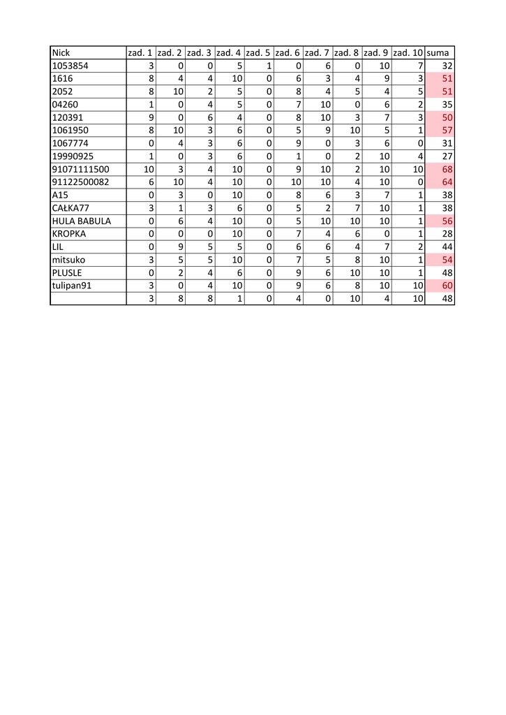Nick 1053854 1616 2052 04260 120391 1061950 1067774 19990925 91071111500 91122500082 A15 CAŁKA77 HULA BABULA KROPKA LIL mitsuko PLUSLE tulipan91 zad. 1 zad. 2 zad. 3 zad. 4 zad. 5 zad. 6 zad. 7 zad. 8 zad. 9 zad. 10 suma 3 0 0 5 1 0 6 0 10 7 32 8 4 4 10 0 6 3 4 9 3 51 8 10 2 5 0 8 4 5 4 5 51 1 0 4 5 0 7 10 0 6 2 35 9 0 6 4 0 8 10 3 7 3 50 8 10 3 6 0 5 9 10 5 1 57 0 4 3 6 0 9 0 3 6 0 31 1 0 3 6 0 1 0 2 10 4 27 10 3 4 10 0 9 10 2 10 10 68 6 10 4 10 0 10 10 4 10 0 64 0 3 0 10 0 8 6 3 7 1 38 3 1 3 6 0 5 2 7 10 1 38 0 6 4 10 0 5 10 10 10 1 56 0 0 0 10 0 7 4 6 0 1 28 0 9 5 5 0 6 6 4 7 2 44 3 5 5 10 0 7 5 8 10 1 54 0 2 4 6 0 9 6 10 10 1 48 3 0 4 10 0 9 6 8 10 10 60 3 8 8 1 0 4 0 10 4 10 48