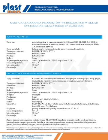 KARTA KATALOGOWA PRODUKTÓW WCHODZĄCYCH W SKŁAD SYSTEMU INSTALACYJNEGO PP PLASTBOR RURY PP / KSZTAŁTKI Typy rur: Typy kształtek: Tworzywo sztuczne: Producent: Produkt : Kolor : Współczynnik płyniecia: Maxa temperatura: Max ciśnienie : Gwarancja: rury jednorodne w zakresie średnic 16-110mm (SDR 11, SDR 7,4, SDR 6) rury stabilizowane w zakresie średnic 20-110mm (włóknem szklanym SDR7.4, aluminium SDR-6) kolana, mufy, redukcje, trójniki, uchwyty, mijanki, zaślepki POLIPROPYLEN TYP 3 Borealis, Sabic RA130E-847 Szary 190/5 g/10min 0,56 / 230/2.16 g/10min 0,25 95° C * 10 bar* 5 lat KSZTAŁTKI PP Z ELEMENTAMI MOSIĘZNYMI TYP GZ/GW Typy kształtek: Tworzywo sztuczne: Producent: Produkt : Kolor : Współczynnik płyniecia: Wtopki: Producent: Product: Kolor: Skład (%): Przyłącza Maxa temperatura: Max ciśnienie : Gwarancja: Kształtki PP z zatopionymi wtopkami mosiężnymi kolana gz/gw, mufy gz/gw, śrubunki etc. (gwinty wewnętrzne oraz zewnętrzne), zawory kulowe. POLIPROPYLEN TYP 3 Borealis, Sabic RA130E-847 Szary 190/5 g/10min 0,56 / 230/2.16 g/10min 0,25 Mosiądz Sizer BRASS MO.59 (CuZn39Pb2) nie dotyczy Cu 59-60, Pb 1,6-2,5, Fe 0,30 max, Ni 0,30 max, Sn 0,30 max, Al 0,05 max, inne 0,20 max, Zn (śladowo) gwinty zewnetrzne / gwinty wewnetrzne od ½” do 3” 95° C* 10 bar* 5 lat Zakres zastosowania systemu instalacyjnego PLASTBOR: instalacje zimnej i ciepłej wody użytkowej, instalacje centralnego ogrzewania, instalacje sprężonego powietrza, systemy nawadniania i ogrzewania gruntu, instalacje klimatyzacyjne, instalacje chłodnicze (woda lodowa). *Instalacja powinna być przeprowadzona przez osobę z odpowiednimi uprawnieniami oraz zgodnie z zaleceniami producenta. Temperatura jak i maksymalne zastosowane ciśnienie powinno być zgodne z parametrami pracy systemu wskazanymi przez producenta.