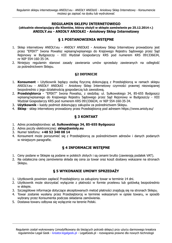 Regulamin sklepu internetowego ANIOLY.eu - ANIOŁY ANIOŁKI - Aniołowy Sklep Internetowy - Konsumencie możesz go zapisać na dysku lub wydrukować REGULAMIN SKLEPU INTERNETOWEGO (aktualnie obowiązujący dla Klientów, którzy złożyli w sklepie zamówienie po 25.12.2014 r.) ANIOLY.eu - ANIOŁY ANIOŁKI - Aniołowy Sklep Internetowy § 1 POSTANOWIENIA WSTĘPNE 1. Sklep internetowy ANIOLY.eu - ANIOŁY ANIOŁKI - Aniołowy Sklep Internetowy prowadzony jest przez "EFEKT" Iwona Powalisz wpisaną/wpisanego do Krajowego Rejestru Sądowego przez Sąd Rejonowy w Bydgoszczy - XIII Wydział Gospodarczy KRS pod numerem KRS 091336634, nr NIP 554-160-35-34. 2. Niniejszy regulamin stanowi zasady zawierania umów sprzedaży zawieranych na odległość za pośrednictwem Sklepu. §2 DEFINICJE 1. Konsument - Użytkownik będący osobą fizyczną dokonującą z Przedsiębiorcą w ramach sklepu ANIOLY.eu - ANIOŁY ANIOŁKI - Aniołowy Sklep Internetowy czynności prawnej niezwiązanej bezpośrednio z jego działalnością gospodarczą lub zawodową. 2. Przedsiębiorca - "EFEKT" Iwona Powalisz, z siedzibą: ul. Sułkowskiego 34, 85-655 Bydgoszcz wpisaną/wpisanego do Krajowego Rejestru Sądowego przez Sąd Rejonowy w Bydgoszczy - XIII Wydział Gospodarczy KRS pod numerem KRS 091336634, nr NIP 554-160-35-34. 3. Użytkownik - każdy podmiot dokonujący zakupów za pośrednictwem Sklepu. 4. Sklep - sklep internetowy prowadzony przez Przedsiębiorcę pod adresem https://www.anioly.eu/ § 3 KONTAKT 1. 2. 3. 4. Adres przedsiębiorstwa: ul. Sułkowskiego 34, 85-655 Bydgoszcz Adres poczty elektronicznej: [email protected] Numer telefonu: +48 52 340 08 14 Konsument może porozumieć się z Przedsiębiorcą za pośrednictwem adresów i danych podanych w niniejszym paragrafie. § 4 INFORMACJE WSTĘPNE 1. Ceny podane w Sklepie są podane w polskich złotych i są cenami brutto (zawierają podatek VAT). 2. Na ostateczna cenę zamówienia składa się cena za towar oraz koszt dostawy wskazane na stronach Sklepu. § 5 WYKONANIE UMOWY SPRZEDAŻY 1. Użytkownik powinien zapłacić Przedsiębiorcy za zakupiony towar w terminie 14 dni. 2. Użytkownik może skorzystać wyłącznie z płatności w formie przelewu lub gotówką bezpośrednio w sklepie. 3. Szczegółowe informacje dotyczące akceptowanych metod płatności znajdują się na stronach Sklepu. 4. Towar zostanie wysłany przez Przedsiębiorcę w terminie wskazanym w opisie towaru, w sposób wybrany przez Konsumenta podczas składania zamówienia. 5. Dostawa towaru odbywa się wyłącznie na terenie Polski. Regulamin został wykreowany (zmodyfikowany do bieżących potrzeb sklepu) przy użyciu darmowego kreatora regulaminów Legal Geek - kreator.legalgeek.pl - LegalGeek.pl - rozwiązania prawne dla nowych technologii Regulamin sklepu internetowego ANIOLY.eu - ANIOŁY ANIOŁKI - Aniołowy Sklep Internetowy - Konsumencie możesz go zapisać na dysku lub wydrukować § 6 PRAWO ODSTĄPIENIA OD UMOWY 1. Konsument ma prawo odstąpić od umowy w terminie 14 dni bez podania jakiejkolwiek przyczyny. 2. Termin do odstąpienia od umowy wygasa po upływie 14 dni od dnia, w którym Konsument wszedł w posiadanie rzeczy lub w którym osoba trzecia inna niż przewoźnik i wskazana przez Konsumenta weszła w posiadanie rzeczy. 3. Aby skorzystać z prawa odstąpienia od umowy, Konsument musi poinformować Przedsiębiorcę o swojej decyzji o odstąpieniu od umowy w drodze jednoznacznego oświadczenia - korzystając z danych Przedsiębiorcy podanych w niniejszym regulaminie. 4. Konsument może skorzystać ze wzoru formularza odstąpienia od umowy zamieszczonego na końcu niniejszego regulaminu, jednak nie jest to obowiązkowe. 5. Aby zachować termin do odstąpienia od umowy, wystarczy, aby Konsument wysłał informację dotyczącą wykonania przysługującego prawa odstąpienia od umowy przed upływem terminu do odstąpienia od umowy. 6. Skutki odstąpienia od umowy: a) w przypadku odstąpienia od umowy Przedsiębiorca zwraca Konsumentowi wszystkie otrzymane od Konsumenta płatności, w tym koszty dostarczenia rzeczy (z wyjątkiem: dodatkowych kosztów wynikających z wybranego przez Konsumenta sposobu dostarczenia innego niż najtańszy zwykły sposób dostarczenia oferowany przez Przedsiębiorcę w Sklepie), niezwłocznie, a w każdym przypadku nie później niż 14 dni od dnia, w którym Przedsiębiorca został poinformowany o decyzji Konsumenta o wykonaniu prawa odstąpienia od umowy; b) zwrotu płatności Przedsiębiorca dokona przy użyciu takich samych sposobów płatności, jakie zostały przez Konsumenta użyte w pierwotnej transakcji, chyba że Konsument wyraźnie zgodził się na inne rozwiązanie; w każdym przypadku Konsument nie poniesie żadnych opłat w związku z tym zwrotem; c) Przedsiębiorca może wstrzymać się ze zwrotem płatności do czasu otrzymania towaru lub do czasu dostarczenia mu dowodu jego odesłania, w zależności od tego, które zdarzenie nastąpi wcześniej; d) Konsument powinien odesłać towar na adres Przedsiębiorcy podany w niniejszym regulaminie niezwłocznie, a w każdym razie nie później niż 14 dni od dnia, w którym poinformował Przedsiębiorcę o odstąpieniu od umowy. Termin zostanie zachowany, jeżeli Konsument odeśle towar przed upływem terminu 14 dni; e) Konsument ponosi bezpośrednie koszty zwrotu rzeczy; f) Konsument odpowiada tylko za zmniejszenie wartości rzeczy wynikające z korzystania z niej w sposób inny niż było to konieczne do stwierdzenia charakteru, cech i funkcjonowania rzeczy. 7. W przypadku gdy ze względu na swój charakter rzeczy nie mogą zostać w zwykłym trybie odesłane pocztą informacja o tym, a także o kosztach zwrotu rzeczy, będzie się znajdować w opisie rzeczy w Sklepie. 8. Prawo odstąpienia od umowy zawartej na odległość nie przysługuje Konsumentowi w odniesieniu do umowy, w której przedmiotem świadczenia jest rzecz nieprefabrykowana, wyprodukowana według specyfikacji konsumenta lub s