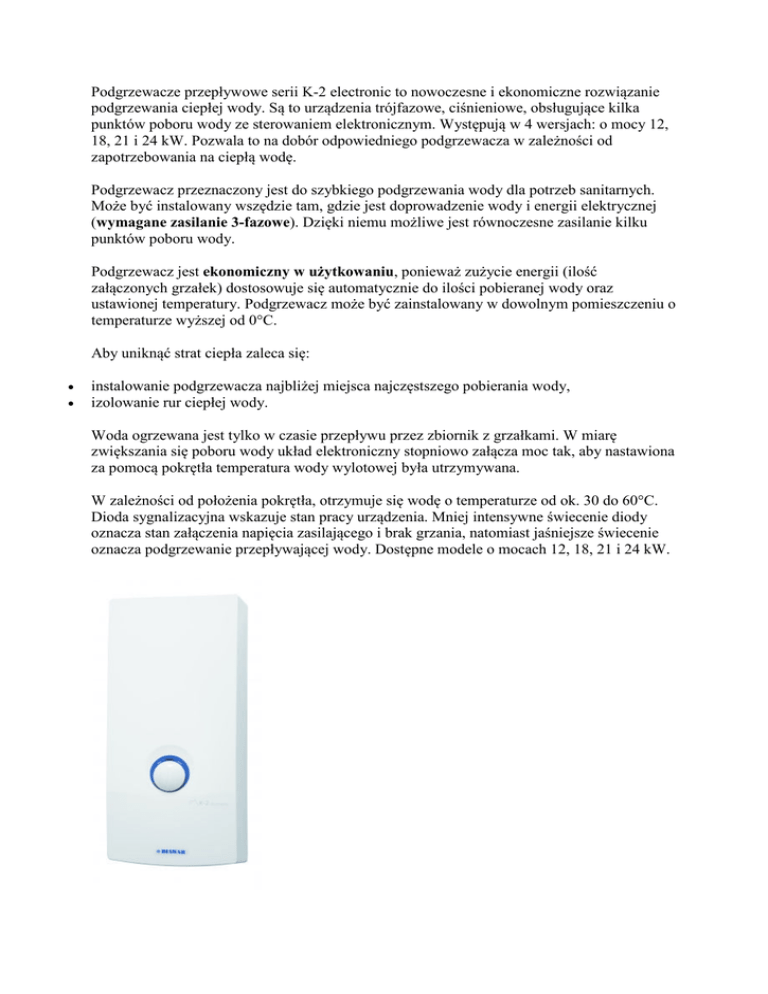 Podgrzewacze przepływowe serii K-2 electronic to nowoczesne i ekonomiczne rozwiązanie podgrzewania ciepłej wody. Są to urządzenia trójfazowe, ciśnieniowe, obsługujące kilka punktów poboru wody ze sterowaniem elektronicznym. Występują w 4 wersjach: o mocy 12, 18, 21 i 24 kW. Pozwala to na dobór odpowiedniego podgrzewacza w zależności od zapotrzebowania na ciepłą wodę. Podgrzewacz przeznaczony jest do szybkiego podgrzewania wody dla potrzeb sanitarnych. Może być instalowany wszędzie tam, gdzie jest doprowadzenie wody i energii elektrycznej (wymagane zasilanie 3-fazowe). Dzięki niemu możliwe jest równoczesne zasilanie kilku punktów poboru wody. Podgrzewacz jest ekonomiczny w użytkowaniu, ponieważ zużycie energii (ilość załączonych grzałek) dostosowuje się automatycznie do ilości pobieranej wody oraz ustawionej temperatury. Podgrzewacz może być zainstalowany w dowolnym pomieszczeniu o temperaturze wyższej od 0°C. Aby uniknąć strat ciepła zaleca się: • • instalowanie podgrzewacza najbliżej miejsca najczęstszego pobierania wody, izolowanie rur ciepłej wody. Woda ogrzewana jest tylko w czasie przepływu przez zbiornik z grzałkami. W miarę zwiększania się poboru wody układ elektroniczny stopniowo załącza moc tak, aby nastawiona za pomocą pokrętła temperatura wody wylotowej była utrzymywana. W zależności od położenia pokrętła, otrzymuje się wodę o temperaturze od ok. 30 do 60°C. Dioda sygnalizacyjna wskazuje stan pracy urządzenia. Mniej intensywne świecenie diody oznacza stan załączenia napięcia zasilającego i brak grzania, natomiast jaśniejsze świecenie oznacza podgrzewanie przepływającej wody. Dostępne modele o mocach 12, 18, 21 i 24 kW. Jedn. OP12.05 OP18.05 OP21.05 OP24.05 - A A A A % 39,7 39,5 39,5 39,5 - XS XS XS XS Dzienne zużycie energii* kWh 2,123 2,136 2,136 2,136 Roczne zużycie energii* kWh 466,8 470 470 470 Poziom mocy akustycznej* dB 15 15 15 15 Napięcie V~ Moc znamionowa - max kW Zakres nastaw temperatury °C Prąd znamionowy A 3x 17,4 Zabezpieczenie A 3 x 20 K-2 electronic Klasa energetyczna* Efektywność energetyczna podgrzewania wody* Profil poboru wody* 400V 3~ 12 18 21 24 30-60 3 x 26,1 3 x 30,4 3 x 34,8 3 x 32 3 x 35 3 x 40 Min. przekrój przewodu zasilającego mm2 4 x 2,5 4x4 4x6 4x6 Wydajność przy ∆ T= 25 °C l/min. 10,1 11,8 13,4 6,7 Ciśnienie znamionowe bar 6 Ciśnienie robocze bar 0,9-6 Masa netto kg 3,2 Gwarancja lata 2 *zgodnie z rozporządzeniem komisji (UE) 812/2013, 814/2013 WYMIARY Jedn. OP-12.05 OP-18.05 OP-21.05 OP-24.05 Szerokość A 210 Wysokość B mm 460 Głębokość C 115
