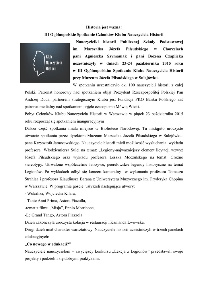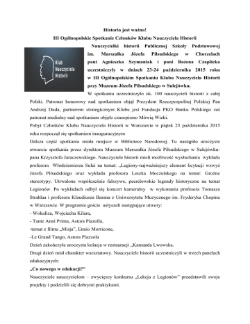 Historia jest ważna! III Ogólnopolskie Spotkanie Członków Klubu Nauczyciela Historii Nauczycielki im. historii Marszałka Publicznej Józefa Szkoły Piłsudskiego w Podstawowej Chorzelach pani Agnieszka Szymaniak i pani Bożena Czaplicka uczestniczyły w dniach 23-24 października 2015 roku w III Ogólnopolskim Spotkaniu Klubu Nauczyciela Historii przy Muzeum Józefa Piłsudskiego w Sulejówku. W spotkaniu uczestniczyło ok. 100 nauczycieli historii z całej Polski. Patronat honorowy nad spotkaniem objął Prezydent Rzeczpospolitej Polskiej Pan Andrzej Duda, partnerem strategicznym Klubu jest Fundacja PKO Banku Polskiego zaś patronat medialny nad spotkaniem objęło czasopismo Mówią Wieki. Pobyt Członków Klubu Nauczyciela Historii w Warszawie w piątek 23 października 2015 roku rozpoczął się spotkaniem inauguracyjnym Dalsza część spotkania miała miejsce w Bibliotece Narodowej. Tu nastąpiło uroczyste otwarcie spotkania przez dyrektora Muzeum Marszałka Józefa Piłsudskiego w Sulejówkupana Krzysztofa Jaraczewskiego. Nauczyciele historii mieli możliwość wysłuchania wykładu profesora Włodziemierza Sulei na temat: „Legiony-najważniejszy element licytacji wzwyż Józefa Piłsudskiego oraz wykładu profesora Leszka Moczulskego na temat: Groźne stereotypy. Utrwalone współcześnie fałszywe, peerelowskie legendy historyczne na temat Legionów. Po wykładach odbył się koncert kameralny w wykonaniu profesora Tomasza Strahlaa i profesora Klaudiusza Barana z Uniwersytetu Muzycznego im. Fryderyka Chopina w Warszawie. W programie goście usłyszeli następujące utwory: - Wokaliza, Wojciecha Kilara, - Tante Anni Prima, Astora Piazolla, -temat z filmu „Misja”, Ennio Morricone, -Le Grand Tango, Astora Piazzola Dzień zakończyła uroczysta kolacja w restauracji „Kamanda Lwowska. Drugi dzień miał charakter warsztatowy. Nauczyciele historii uczestniczyli w trzech panelach edukacyjnych: „Co nowego w edukacji?” Nauczyciele nauczycielom – zwycięzcy konkursu „Lekcja z Legionów” przedstawili swoje projekty i podzielili się dobrymi praktykami. Podczas spotkania edukatorzy zaprezentowali i zaprosili uczestników do udziału w programach edukacyjnych Muzeum – akcja Mamy Niepodległą, akcja Zapal Znicz Legioniście, książka „Nasza paczka i niepodległość”. „Nowoczesne media w edukacji historycznej” W ciągu półtora miesiąca Wykaz Legionistów Polskich uruchomiony przez Muzeum Józefa Piłsudskiego w Sulejówku odnotował ponad milion odsłon! Podczas warsztatów edukatorzy zaprezentowali w jaki sposób można zachęcić uczniów do aktywnej nauki historii wychodząc naprzeciw ich oczekiwaniom i wykorzystując środki multimedialne - internetowy Wykaz, interaktywną Mapą Legionów oraz grę. „Muzeum marzeń nauczyciela historii” Chcemy budować Muzeum Józefa Piłsudskiego w Sulejówku razem z Państwem. Podczas warsztatów eksperckich zaprosimy do dyskusji na temat Państwa oczekiwań dotyczących naszej przyszłej oferty edukacyjnej. na których zaprezentowano propozycje współpracy w ramach projektów muzealnoedukacyjnych, rozmawiano o oczekiwaniach nauczycieli wobec działalności Klubu, zebrano potrzeby i pomysły uczestników dotyczące wymiany doświadczeń i wspierania się w realizacji misji związanej z zawodem nauczyciela historii. Muzeum Józefa Piłsudskiego w Sulejówku, podobnie jak nauczyciele historii, realizuje misję podnoszenia świadomości historycznej wśród młodego pokolenia Polaków. Doceniając i szanując wysiłek nauczycieli w realizowaniu tego trudnego zadania, wystąpiło z inicjatywą powołania Klubu Nauczyciela Historii przy Muzeum Józefa Piłsudskiego w Sulejówku. Celem Klubu jest wspieranie nauczycieli w rozwoju ich zainteresowań historycznych i pasji pedagogicznej, a także budowa środowiska otwartego na wymianę doświadczeń zawodowych. Członkowie Klubu zostali także zaproszeni do współpracy w ramach projektów muzealno-edukacyjnych. Szczegółowe informacje na temat działalności ogólnopolskiego Klubu Nauczyciela Historii można znaleźć na stronie internetowej Muzeum Marszałka Józefa Piłsudskiego w Sulejówku