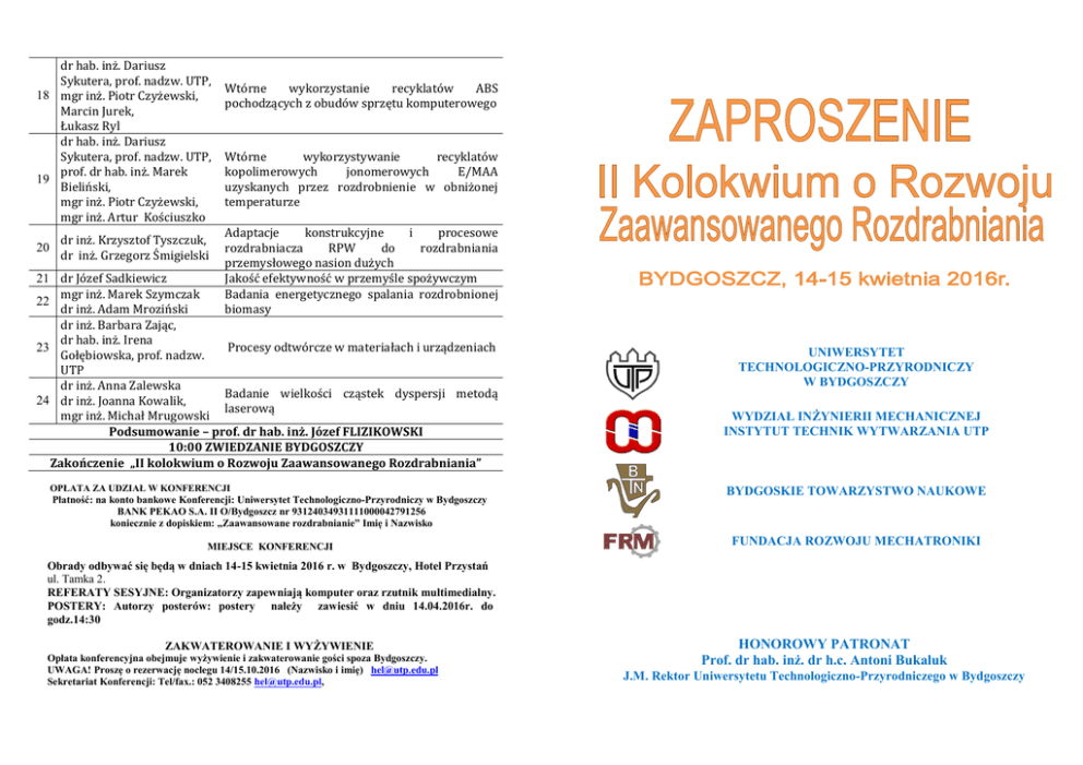 dr hab. inż. Dariusz Sykutera, prof. nadzw. UTP, 18 mgr inż. Piotr Czyżewski, Marcin Jurek, Łukasz Ryl dr hab. inż. Dariusz Sykutera, prof. nadzw. UTP, prof. dr hab. inż. Marek 19 Bieliński, mgr inż. Piotr Czyżewski, mgr inż. Artur Kościuszko 20 dr inż. Krzysztof Tyszczuk, dr inż. Grzegorz Śmigielski Wtórne wykorzystanie recyklatów ABS pochodzących z obudów sprzętu komputerowego Wtórne wykorzystywanie recyklatów kopolimerowych jonomerowych E/MAA uzyskanych przez rozdrobnienie w obniżonej temperaturze Adaptacje konstrukcyjne i procesowe rozdrabniacza RPW do rozdrabniania przemysłowego nasion dużych Jakość efektywność w przemyśle spożywczym Badania energetycznego spalania rozdrobnionej biomasy 21 dr Józef Sadkiewicz mgr inż. Marek Szymczak 22 dr inż. Adam Mroziński dr inż. Barbara Zając, dr hab. inż. Irena 23 Procesy odtwórcze w materiałach i urządzeniach Gołębiowska, prof. nadzw. UTP dr inż. Anna Zalewska Badanie wielkości cząstek dyspersji metodą 24 dr inż. Joanna Kowalik, laserową mgr inż. Michał Mrugowski Podsumowanie – prof. dr hab. inż. Józef FLIZIKOWSKI 10:00 ZWIEDZANIE BYDGOSZCZY Zakończenie „II kolokwium o Rozwoju Zaawansowanego Rozdrabniania” OPŁATA ZA UDZIAŁ W KONFERENCJI Płatność: na konto bankowe Konferencji: Uniwersytet Technologiczno-Przyrodniczy w Bydgoszczy BANK PEKAO S.A. II O/Bydgoszcz nr 93124034931111000042791256 koniecznie z dopiskiem: „Zaawansowane rozdrabnianie” Imię i Nazwisko MIEJSCE KONFERENCJI UNIWERSYTET TECHNOLOGICZNO-PRZYRODNICZY W BYDGOSZCZY WYDZIAŁ INŻYNIERII MECHANICZNEJ INSTYTUT TECHNIK WYTWARZANIA UTP BYDGOSKIE TOWARZYSTWO NAUKOWE FUNDACJA ROZWOJU MECHATRONIKI Obrady odbywać się będą w dniach 14-15 kwietnia 2016 r. w Bydgoszczy, Hotel Przystań ul. Tamka 2. REFERATY SESYJNE: Organizatorzy zapewniają komputer oraz rzutnik multimedialny. POSTERY: Autorzy posterów: postery należy zawiesić w dniu 14.04.2016r. do godz.14:30 ZAKWATEROWANIE I WYŻYWIENIE Opłata konferencyjna obejmuje wyżywienie i zakwaterowanie gości spoza Bydgoszczy. UWAGA! Proszę o rezerwację noclegu 14/15.10.2016 (Nazwisko i imię) [email protected] Sekretariat Konferencji: Tel/fax.: 052 3408255 [email protected], HONOROWY PATRONAT Prof. dr hab. inż. dr h.c. Antoni Bukaluk J.M. Rektor Uniwersytetu Technologiczno-Przyrodniczego w Bydgoszczy PROGRAM KONFERENCJI 14 kwietnia 2016r. I dzień Kolokwium Część I kolokwium 13:30Rejestracja uczestników/lunch 14:40 Przewodniczący: Dr inż. Adam Mroziński Referat wprowadzający prof. dr hab. inż. Marek BIELIŃSKI 14:50 Rozmowy o rozdrabnianiu DYSKUSJA 15 kwietnia 2016r. II dzień Kolokwium 9:00 Sesja posterowa – część II Przewodniczący: dr hab. inż. Andrzej Tomporowski, prof. nadzw. UTP 1. 2. 3. 4. 5. 6. EFEKTYWNOŚĆ ENERGETYCZNA, NIESZKODLIWOŚĆ, JAKOŚĆ dr hab. inż. Andrzej TOMPOROWSKI, prof. nadzw. UTP mgr inż. Robert KASNER 15:30 Proefektywnościowe badania wielotarczowego rozdrabniacza nowej generacji METODYKA BADAŃ prof. dr hab. inż. Józef FLIZIKOWSKI 15:50 Metody badań rozwoju inteligentnego procesów rozdrabniania MATERIAŁ WSADOWY I PRODUKT CELOWY prof. dr hab. inż. Andrzej BOCHAT dr inż. Marcin ZASTEMPOWSKI 16:10 Problematyka doboru cech i parametrów konstrukcyjnych rozdrabniaczy bijakowych ze względu na ich charakterystyki użytkowe MASZYNA – BUDOWA I EKSPLOATACJA dr hab. inż. Marek MACKO, prof. nadzw. UKW 16:30 Przegląd innowacyjnych rozwiązań konstrukcyjnych rozdrabniaczy i młynów w przemyśle PROCES dr hab. inż. Dariusz SYKUTERA, prof. nadzw. UTP Badanie procesu cięcia termoplastycznych tworzyw porowatych 17:30 Dyskusja/Sesja posterowa – część I 18:00 Kolacja/Rozmowy przy stołach 17:00 7. 8. 9. dr inż. Kazimierz Bieliński Prof. .dr hab. inż. Marek Bieliński dr inż. Piotr Czyżewski, Marcin Gronowski, Hubert Hoppe dr inż. Dorota Czarnecka Komorowska dr inż. Ireneusz Grubecki prof. dr hab. inż. Józef Flizikowski, inż. Urszula Taranowska dr inż. Tomasz Jarzyna, prof. dr hab. inż. Henryk Holka dr inż. Jerzy Kaszkowiak, mgr inż. Marietta Markiewicz Patalon, dr inż. Sylwester Borowski dr inż. Joanna Kowalik, dr inż. Anna Zalewska, inż. Marta Lorek mgr inż. Tomasz Mania inż. Weronika Kruszelnicka, 10. dr inż. Izabela Piasecka, Koło Naukowe Top Gran inż. Ola Madej, 11 Koło Naukowe dr inż. Adam Mroziński, 12 dr inż. Krzysztof Tyszczuk dr inż. Karolina Perz, 13 dr inż. Aleksandra Rewolińska, inż. Tomasz Kotarba dr inż. Karolina Perz, 14 dr inż. Aleksandra Rewolińska dr inż. Izabela Piasecka, 15 dr hab. inż. Andrzej Tomporowski, prof. nadzw. UTP mgr inż. Paulina Ropińska, Koło 16 Naukowe mgr inż. Mieczysław Szczypiński, dr hab. inż. Kazimierz Reszka, dr hab. inż. Tomasz Rydzkowski, 17 dr inż. Iwona Michalska-Pożoga, dr Katarzyna Mitura, mgr Michał Szczypiński Monitorowanie procesów przetwarzania Wykorzystanie recyklatów ABS w technologii 3D (FFF) Pulweryzacja odpadów z polietylenu Aglomeracja cząstek drewna w procesie biofiltracji pod wpływem wilgoci Dokładność określania charakterystyk rozdrabniania liści mięty pieprzowej Badania doświadczalne wpływu temperatury na prostoliniowość wałów wielkogabarytowych Badania wstępne masy objętościowej odpadów różnych rodzajów tworzyw sztucznych zagęszczanych w belownicy poziomej Wpływ zmian wielkości cząstek układu dyspersyjnego na ich stabilność Technologia produkcji dachówek kompozytowych optymalizacja procesu produkcji Badanie wielowalcowego rozdrabniacza minerałów Wyznaczanie charakterystyk wielotarczowego rozdrabniania zbóż Stanowisko pomiarowe do monitorowania pracy rozdrabniacza precyzyjnego Badanie wpływu różnych wymienników ciepła na kluczowe parametry produktu Skuteczność filtracji sprężonego powietrza Proefektywnościowe badania wielotarczowego rozdrabniacza nowej generacji - wyniki badan Rozdrabnianie ziarniaków energetycznych biomasy dla celów Inżynieria materiałowa w eksploata