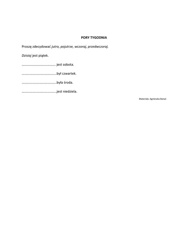 PORY TYGODNIA Proszę zdecydować jutro, pojutrze, wczoraj, przedwczoraj. Dzisiaj jest piątek. …………………………………. jest sobota. …………………………………..był czwartek. …………………………………..była środa. …………………………………..jest niedziela. Materiały: Agnieszka Banaś