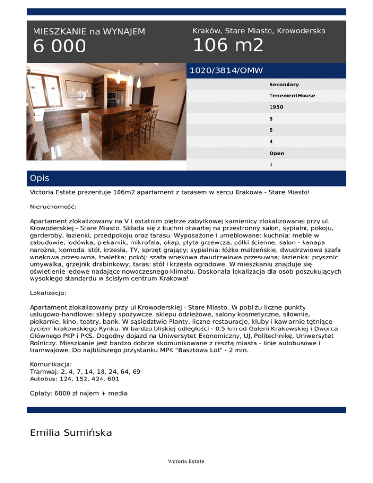 MIESZKANIE na WYNAJEM 6 000 Kraków, Stare Miasto, Krowoderska 106 m2 1020/3814/OMW Secondary TenementHouse 1950 5 5 4 Open 1 Opis Victoria Estate prezentuje 106m2 apartament z tarasem w sercu Krakowa - Stare Miasto! Nieruchomość: Apartament zlokalizowany na V i ostatnim piętrze zabytkowej kamienicy zlokalizowanej przy ul. Krowoderskiej - Stare Miasto. Składa się z kuchni otwartej na przestronny salon, sypialni, pokoju, garderoby, łazienki, przedpokoju oraz tarasu. Wyposażone i umeblowane: kuchnia: meble w zabudowie, lodówka, piekarnik, mikrofala, okap, płyta grzewcza, półki ścienne; salon - kanapa narożna, komoda, stół, krzesła, TV, sprzęt grający; sypialnia: łóżko małżeńskie, dwudrzwiowa szafa wnękowa przesuwna, toaletka; pokój: szafa wnękowa dwudrzwiowa przesuwna; łazienka: prysznic, umywalka, grzejnik drabinkowy; taras: stół i krzesła ogrodowe. W mieszkaniu znajduje się oświetlenie ledowe nadające nowoczesnego klimatu. Doskonała lokalizacja dla osób poszukujących wysokiego standardu w ścisłym centrum Krakowa! Lokalizacja: Apartament zlokalizowany przy ul Krowoderskiej - Stare Miasto. W pobliżu liczne punkty usługowo-handlowe: sklepy spożywcze, sklepu odzieżowe, salony kosmetyczne, siłownie, piekarnie, kino, teatry, bank. W sąsiedztwie Planty, liczne restauracje, kluby i kawiarnie tętniące życiem krakowskiego Rynku. W bardzo bliskiej odległości - 0,5 km od Galerii Krakowskiej i Dworca Głównego PKP i PKS. Dogodny dojazd na Uniwersytet Ekonomiczny, UJ, Politechnikę, Uniwersytet Rolniczy. Mieszkanie jest bardzo dobrze skomunikowane z resztą miasta - linie autobusowe i tramwajowe. Do najbliższego przystanku MPK "Basztowa Lot" - 2 min. Komunikacja: Tramwaj: 2, 4, 7, 14, 18, 24, 64, 69 Autobus: 124, 152, 424, 601 Opłaty: 6000 zł najem + media Emilia Sumińska Victoria Estate tel. +48 512 704 621 email: [email protected] Victoria Estate Powered by TCPDF (www.tcpdf.org)