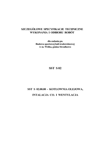 SZCZEGÓŁOWE SPECYFIKACJE TECHNICZNE WYKONANIA I ODBIORU ROBÓT dla zadania pn. Budowa sportowej hali środowiskowej w m. Wólka, gmina Strzałkowo SST S 02 SST S 02.00.00 - KOTŁOWNIA OLEJOWA, INTALACJA CO. I WENTYLACJA 1.1 Przedmiot SST Przedmiotem niniejszej specyfikacji (SST) są wymagania dotyczące wykonania i odbioru robót dotyczących wymiany instalacji centralnego ogrzewania i wentylacji w budynku dla inwestycji pn. „Budowa sportowej hali środowiskowej w m. Wólka, gm. Strzałkowo”. 1.2 Zakres stosowania SST Szczegółowa Specyfikacja Techniczna jest stosowana jako dokument przetargowy i kontraktowy przy zlecaniu i realizacji robót wymienionych w punkcie l. l 1.3 Zakres robót objętych SST Roboty, których dotyczy specyfikacja obejmują wszystkie czynności umożliwiające i mające na celu wykonanie instalacji centralnego ogrzewania z kotłownią olejową i wentylacji w sali gimnastycznej z zapleczem socjalnym zgodnie z punktem 1.1. Niniejsza specyfikacja techniczna związana jest z wykonaniem nw. robót: – montaż kotłowni olejowej z orurowaniem, – montaż kanałów spalinowych i wentylacyjnych, – montaż grzejników płytowych, – montaż rurociągów stalowych spawanych, – montaż armatury odcinającej, regulacyjnej i odpowietrzającej i pomiarowej, – zabezpieczenie antykorozyjne rurociągów, – montaż izolacji termicznej rurociągów, – montaż wywietrzaków dachowych, – montaż wentylatorów osiowych, – montaż wentylatorów łazienkowych, – montaż nawietrzaków podokiennych, – montaż kratek wentylacyjnych, – montaż podstaw dachowych. 1.4 Określenia podstawowe – Instalacja centralnego ogrzewania wodna, systemu zamkniętego - instalacja, której przestrzeń wodna nie ma swobodnego połączenia z atmosferą i jest zabezpieczona zgodnie z PN-B-02414, – Ciśnienie próbne - ciśnienie próby hydraulicznej, jakiemu poddaje się armaturę, elementy przewodów, urządzenia w celu sprawdzenia szczelności, – Ciśnienie robocze czynnika grzejnego - ustalona przez projektanta najwyższa wltrtość nadciśnienia statycznego czynnika grzejnego w instalacji podczas jego przepływu, – Czynnik grzejny - płyn (woda) przenoszący ciepło; roztwór substancji zapobiegających korozji lub obniżających temperaturę zamarzania wody, – Naczynie wzbiorcze przeponowe - zbiornik ciśnieniowy z elastyczną przeponą oddzielającą przestrzeń wodną od przestrzeni gazowej, przejmujący zmianę objętości wody w zładzie spowodowane zmianami jej temperatury, – Pompa obiegowa - pompa wymuszająca krążenie wody w instalacji c.o., – Kompensacja naturalna - umożliwienie każdemu odcinkowi rur rozszerzanie się bez ograniczeń w wyniku zmiany kierunku prowadzenia i właściwe rozmieszczenie punktów stałych, – punkt stały - uchwyty mocujące ustalające nieprzesuwne położenie przewodu. 1.5 Ogólne wymagania dotyczące robót Ogólne wymagania dotyczące robót podano w ST „Wymagania ogólne". 2.0 Materiały Warunki ogólne stosowania materiałów podano w ST „Wymagania ogólne". Mogą być stosowane wyroby producentów krajowych i zagranicznych posiadające aprobaty techniczne wydane przez odpowiednie Instytuty Badawcze. Wykonawca uzyska przed zastosowaniem wyrobu akceptację Inwestora. 2.1 Rury i łączniki – rury stalowe czarne ze szwem ze stali 10BX wg PN-73/H-74200 średnicy 15-65 mm, – kolana stalowe hamburskie średnicy 15-65 mm, 2.2 Armatura odcinająca, regulacyjna i grzejnikowa – zawory na instalacjach i w kotłowni zgodnie z projektem technicznym, – zawór grzejnikowy typ RTD-N (Danfoss) proste z nastawą wstępną, średnicy 15 mm wg PN-90/M-75011 i HD 1215-2, – głowica termostatyczna dla zaworu RTD-N typ „RTS Everis 4230" (Danfoss) z czujnikiem wbudowanym wg PN-EN 215:2002, 2.3 Kotłownia – kocioł olejowy Vitorond 200 – 100 kW firmy Viessmann, – wymiennik c.w.u. SMART 800, 96 kW, – zbiorniki paliwa 4 x 750 l, – przeponowe naczynia wzbiorcze Reflex zgodnie z projektem technicznym, – pompa obiegu co., pompa ładująca wym., pompa cyrkulacyjna cwu., – automatyka i opomiarowanie zgodnie z projektem technicznym, – kanał spalinowy DN200 i wentylacyjny DN160 ze stali nierdzewnej. 2.4 Grzejniki – grzejniki płytowe kompaktowe typ „K Cosmo-Nova" odmiany 11, 21, 22, 33: wysokość 500, 600 i 900 mm, z walcowanej blachy stalowej wg PN EN 442, z powłoką gruntującą i wykończeniową wg DIN 55900, – aparat grzewczo-wentylacyjny typ Neolux IV wraz z kratką nawiewną i siatką, 2.5 Odpowietrzniki – odpowietrznik manualny wbudowany fabrycznie w grzejnik – odpowietrznik automatyczny typ Taco Hy Vent z zaworem stopowym Ø 15 rnm do montażu na pionie 2.6 Izolacje termiczne rurociągów – otuliny z wełny mineralnej Flexorok o grubości 20 mm Rokwoll dla rurociągów w zakresie średnic 15-50 mm, – otuliny z wełny mineralnej Flexorok o grubości 25 mm Rokwoll dla rurociągów o średnicy 65 mm, – otuliny poliuretanowe o grubości 20 mm dla rurociągów o średnicy 15 mm, – otuliny izolacyjne powinny posiadać świadectwo oceny higienicznej, – otuliny izolacyjne powinny posiadać trwałe oznakowanie zawierające: znak producenta, rodzaj surowca, podstawowe wymiary, datę produkcji, – otuliny izolacyjne powinny być odporne na działanie maksymalnej temperatury eksploatacyjnej (80°C) i posiadać trwałość nie krótszą niż trwałość izolowanego rurociągu, – otuliny izolacyjne powinny być chemicznie obojętne w stosunku do izolowanego rurociągu; nietoksyczne; odporne na chemiczne działanie wody, – otuliny izolacyjne powinny spełniać wymagania p.-poż., 2.7 Elementy wentylacji – wentylator osiowy typ HXM-300 z żaluzją i regulatorem REB, – wentylator łazienkowy typ Dekor 300R Plus, – wentylator łazienkowy typ Dekor 300R, – wentylator łazienkowy typ EDM 100 T, – wywietrzak dachowy typ A 9 400 mm, stalowy, ocynkowany wg KB1-37.6./4/-70, – podstawa dachowa typ