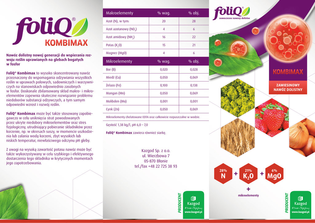 Makroelementy Nawóz dolistny nowej generacji do wspierania rozwoju roślin uprawianych na glebach bogatych w fosfor FoliQ® Kombimax to wysoko skoncentrowany nawóz przeznaczony do wspomagania odżywiania wszystkich roślin w uprawach polowych, sadowniczych i warzywniczych na stanowiskach odpowiednio zasobnych w fosfor. Doskonale zbilansowany skład makro- i mikroelementów zapewnia skuteczne rozwiązanie problemu niedoborów substancji odżywczych, a tym samym odpowiedni wzrost i rozwój roślin. FoliQ® Kombimax może być także stosowany zapobiegawczo w celu uniknięcia strat powodowanych przez ukryte niedobory mikroelementów oraz stres fizjologiczny, utrudniający pobieranie składników przez korzenie, np. w okresach suszy, w momencie uszkodzenia lub zalania wodą korzeni, zbyt wysokich lub niskich temperatur, niewłaściwego odczynu pH gleby. Z uwagi na wysoką zawartość potasu nawóz może być także wykorzystywany w celu szybkiego i efektywnego dostarczenia tego składnika w krytycznych momentach jego zapotrzebowania. % wag. % obj. Azot (N), w tym: 20 28 Azot azotanowy (NO3) 4 6 Azot amidowy (NH2) 16 22 Potas (K2O) 15 21 Magnez (MgO) 4 6 % wag. % obj. Bor (B) 0,020 0,028 Miedź (Cu) 0,050 0,069 Żelazo (Fe) 0,100 0,138 Mangan (Mn) 0,050 0,069 Molibden (Mo) 0,001 0,001 Cynk (Zn) 0,050 0,069 Mikroelementy KOMBIMAX ZAWIESINOWY NAWÓZ DOLISTNY Mikroelementy chelatowane EDTA oraz całkowicie rozpuszczalne w wodzie. Gęstość 1,38 kg/l, pH 6,0 – 7,0 FoliQ® Kombimax zawiera również siarkę. Kazgod Sp. z o.o. ul. Wierzbowa 7 05-870 Błonie tel./fax +48 22 725 38 93 28% N 21% K2O mikroelementy 6% MgO Kluczowe zalety Wysoka koncentracja makro- i mikroelementów dzięki nowoczesnej formulacji zawiesinowej Odpowiednio zbilansowana zawartość azotu oraz potasu, wspierająca i przyspieszająca pobieranie pozostałych składników odżywczych oraz działająca stabilizująco na rośliny Wysoka zawartość magnezu, umożliwiająca efektywne eliminowanie niedoborów tego składnika Dawki i terminy stosowania Uprawa Dawka l/ha Liczba zabiegów Terminy stosowania Zboża 2–3 2–3 po ruszeniu wegetacji do końca fazy kłoszenia Rzepak 2–3 2–3 po ruszeniu wegetacji do początku kwitnienia Buraki cukrowe 3 2 od fazy 4 – 6 liści do zwarcia międzyrzędzi Kukurydza 3 2 od fazy 4 liści Ziemniaki 3 3 pierwszy – w okresie intensywnego rozwoju liści i łodyg, drugi – na początku kwitnienia, trzeci – 14 dni po drugim Drzewa i krzewy owocowe 3 2–3 od fazy różowego/białego pąka Chmiel 3 2–3 w okresie intensywnego wzrostu Ogórek, pomidor 3–5 2–3 od fazy 3 – 4 liści (lub 2 tygodnie po wysadzeniu) w odstępach 7 – 14 dni Cebula, por 3–5 2–3 od fazy 3 – 4 liści (lub 2 tygodnie po wysadzeniu) w odstępach 7 – 14 dni Kapusta, kalafior, brokuły 3–5 2–3 od fazy 4 – 6 liści w odstępach 7 – 14 dni Marchew, pietruszka 3–5 2–3 od fazy tworzenia korzenia spichrzowego do 3 tygodni przed zbiorem, w odstępach 7 – 14 dni Uwaga: Nie mieszać z nawozami fosforanowymi. HUMEKTANTY Najważniejsze korzyści MIESZALNOŚĆ ZE ŚRODKAMI OCHRONY ROŚLIN SURFAKTANTY Poprawa rozwoju systemu korzeniowego Zwiększenie masy wegetatywnej roślin Poprawa odporności i tolerancji roślin na warunki stresowe Optymalne zaopatrzenie roślin w składniki pokarmowe Zwiększenie plonu i poprawa jego jakości ANTYODPAROWYWACZE ŚRODKI ZWIĘKSZAJĄCE PRZYCZEPNOŚĆ CHELATOWANIE EDTA