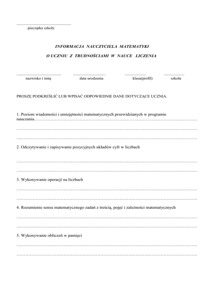 ...................................................... pieczątka szkoły INFORMACJA NAUCZYCIELA MATEMATYKI O UCZNIU Z TRUDNOŚCIAMI W NAUCE LICZENIA ............................................ nazwisko i imię ................................ data urodzenia ..................... klasa(profil) .................... szkoła PROSZĘ PODKREŚLIĆ LUB WPISAĆ ODPOWIEDNIE DANE DOTYCZĄCE UCZNIA. 1. Poziom wiadomości i umiejętności matematycznych przewidzianych w programie nauczania………………………………………………………………………………………………… …………………………………………………………………………………………………………… …………………………………………………………………………………………………………… 2. Odczytywanie i zapisywanie pozycyjnych układów cyfr w liczbach …………………………………………………………………………………………………………… …………………………………………………………………………………………………………… 3. Wykonywanie operacji na liczbach …………………………………………………………………………………………………………… …………………………………………………………………………………………………………… 4. Rozumienie sensu matematycznego zadań z treścią, pojęć i zależności matematycznych …………………………………………………………………………………………………………… …………………………………………………………………………………………………………… 5. Wykonywanie obliczeń w pamięci …………………………………………………………………………………………………………… …………………………………………………………………………………………………………… 6. Spostrzeganie i określanie stosunków przestrzennych i geometrycznych …………………………………………………………………………………………………………… …………………………………………………………………………………………………………… 7. Poziom graficzny pisma: - bez zastrzeżeń - zaburzony (wymienić cechy pisma, kształt, łączenia) …………………………………………………………………………………………………………… …………………………………………………………………………………………………………… 8. Tempo pisma: szybkie, przeciętne, wolne, bardzo wolne. 9. Ogólna ocena sprawdzianów z matematyki …………………………………………………………………………………………………………… …………………………………………………………………………………………………………… 10. Oceny szkolne z poszczególnych przedmiotów nauczenia z ostatniego semestru lub końca roku szkolnego 11. Inne uwagi …………………………………………………………………………………………………………… …………………………………………………………………………………………………………… Proszę do skierowania dołączyć 2 sprawdziany ucznia. …………………………………………… data podpis nauczyciela matematyki