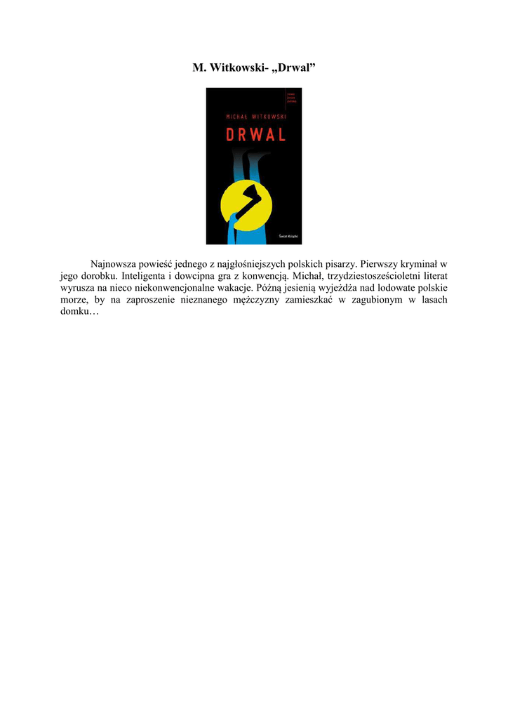 M. Witkowski- „Drwal” Najnowsza powieść jednego z najgłośniejszych polskich pisarzy. Pierwszy kryminał w jego dorobku. Inteligenta i dowcipna gra z konwencją. Michał, trzydziestosześcioletni literat wyrusza na nieco niekonwencjonalne wakacje. Późną jesienią wyjeżdża nad lodowate polskie morze, by na zaproszenie nieznanego mężczyzny zamieszkać w zagubionym w lasach domku…