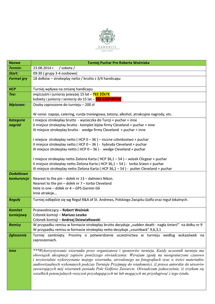 Nazwa Termin: Start: Format gry Turniej Puchar Pro Roberta Woźniaka 23.08.2014 r. / sobota / 09:30 ( grupy 3-4 osobowe) 18 dołków – strokeplay netto / brutto z 3/4 handicapu HCP Tee: Turniej wpływa na zmianę handicapu mężczyźni i juniorzy powyżej 15 lat – TEE ŻÓŁTE kobiety i juniorzy i seniorzy do 15 lat – TEE CZERWONE Osoby zaproszone do turnieju – 200 zł Wpisowe: Kategorie nagród W cenie: napoje, catering, runda treningowa, żetony, alkohol, atrakcyjne nagrody, etc. I miejsce strokeplay brutto - wycieczka do Turcji + puchar + inne II miejsce strokeplay brutto - komplet kijów firmy Cleveland + puchar + inne III miejsce strokeplay brutto - wedge firmy Cleveland + puchar + inne I miejsce strokeplay netto ( HCP 0 – 36 ) – roczne członkostwo + puchar II miejsce strokeplay netto ( HCP 0 – 36 ) - hybryda Cleveland + puchar III miejsce strokeplay netto ( HCP 0 – 36 ) - wedge Cleveland + puchar I miejsce strokeplay netto Zielona Karta ( HCP 36,1 – 54 ) – wózek Clicgear + puchar II miejsce strokeplay netto Zielona Karta ( HCP 36,1 – 54 ) - torba Srixon + puchar III miejsce strokeplay netto Zielona Karta ( HCP 36,1 – 54 ) - putter Cleveland + puchar Dodatkowe konkurencje Nearest to the pin – dołek nr 13 – dalmierz Nikon. Nearest to the pin – dołek nr 7 – torba Cleveland Hole in one – dołek nr 4 – GPS Garmin G6 Inne atrakcje… Reguły Turniej odbędzie się wg Reguł R&A of St. Andrews, Polskiego Związku Golfa oraz reguł lokalnych. Komitet turniejowy Przewodniczący – Robert Woźniak Członek komisji – Mariusz Leszko Członek komisji – Andrzej Dziewiałtowski W przypadku remisu w formacie strokeplay brutto decyduje „sudden death - nagła śmierć” na dołku nr 9 W przypadku remisu w formacie strokeplay netto decyduje „countback” 9,6,3,1 Turniej zamknięty. Prosimy o potwierdzenie uczestnictwa w turnieju według wskazówek na zaproszeniach. Remisy Zgłoszenia Inne ***Wykorzystywanie wizerunku przez organizatora i sponsorów turnieju. Każdy uczestnik turnieju ma obowiązek akceptacji zapisów poniższego oświadczenia: Wyrażam zgodę na nieograniczone czasowo i terytorialnie wykorzystanie mojego wizerunku, utrwalonego na fotografiach oraz w treści materiałów audiowizualnych wykonanych podczas Turnieju Przyjmuję do wiadomości, iż prawa autorskie do utworów zawierających mój wizerunek posiada Pole Golfowe Zawarcie. Oświadczam jednocześnie, iż zrzekam się wszelkich potencjalnych roszczeń przysługujących mi lub mogących mi przysługiwać z tego tytułu.