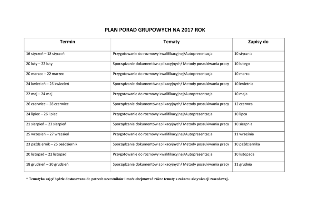 PLAN PORAD GRUPOWYCH NA 2017 ROK Termin Tematy Zapisy do 16 styczeń – 18 styczeń Przygotowanie do rozmowy kwalifikacyjnej/Autoprezentacja 10 stycznia 20 luty – 22 luty Sporządzanie dokumentów aplikacyjnych/ Metody poszukiwania pracy 10 lutego 20 marzec – 22 marzec Przygotowanie do rozmowy kwalifikacyjnej/Autoprezentacja 10 marca 24 kwiecień – 26 kwiecień Sporządzanie dokumentów aplikacyjnych/ Metody poszukiwania pracy 10 kwietnia 22 maj – 24 maj Przygotowanie do rozmowy kwalifikacyjnej/Autoprezentacja 10 maja 26 czerwiec – 28 czerwiec Sporządzanie dokumentów aplikacyjnych/ Metody poszukiwania pracy 12 czerwca 24 lipiec – 26 lipiec Przygotowanie do rozmowy kwalifikacyjnej/Autoprezentacja 10 lipca 21 sierpień – 23 sierpień Sporządzanie dokumentów aplikacyjnych/ Metody poszukiwania pracy 10 sierpnia 25 wrzesień – 27 wrzesień Przygotowanie do rozmowy kwalifikacyjnej/Autoprezentacja 11 września 23 październik – 25 październik Sporządzanie dokumentów aplikacyjnych/ Metody poszukiwania pracy 10 października 20 listopad – 22 listopad Przygotowanie do rozmowy kwalifikacyjnej/Autoprezentacja 10 listopada 18 grudzień – 20 grudzień Sporządzanie dokumentów aplikacyjnych/ Metody poszukiwania pracy 11 grudnia * Tematyka zajęć będzie dostosowana do potrzeb uczestników i może obejmować różne tematy z zakresu aktywizacji zawodowej.