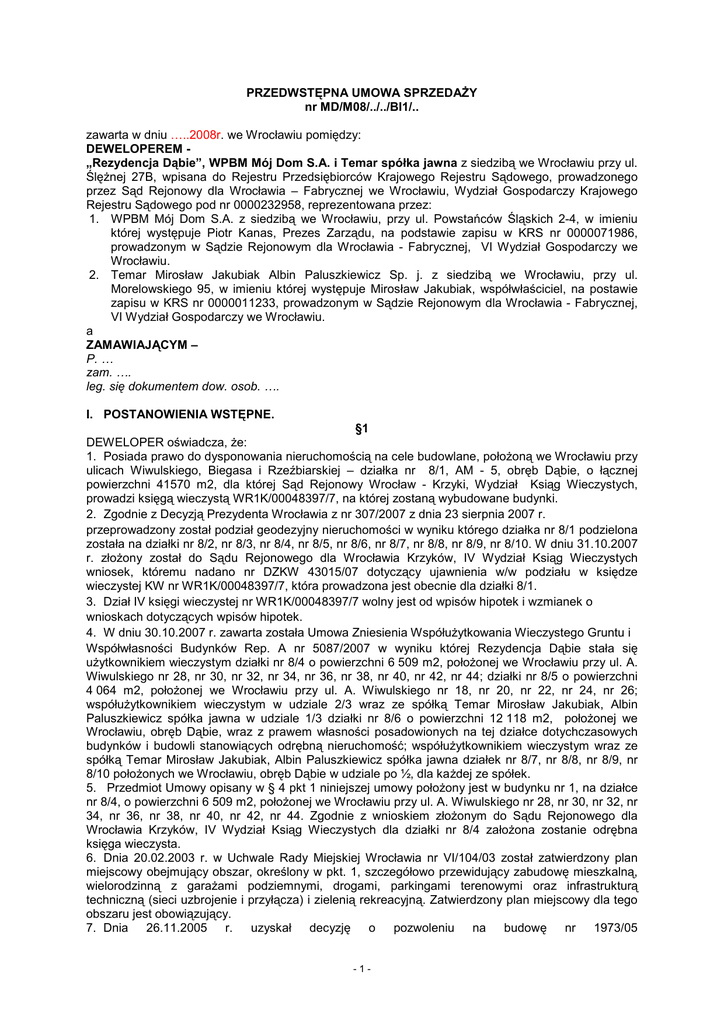PRZEDWSTĘPNA UMOWA SPRZEDAśY nr MD/M08/../../BI1/.. zawarta w dniu …..2008r. we Wrocławiu pomiędzy: DEWELOPEREM „Rezydencja Dąbie”, WPBM Mój Dom S.A. i Temar spółka jawna z siedzibą we Wrocławiu przy ul. ŚlęŜnej 27B, wpisana do Rejestru Przedsiębiorców Krajowego Rejestru Sądowego, prowadzonego przez Sąd Rejonowy dla Wrocławia – Fabrycznej we Wrocławiu, Wydział Gospodarczy Krajowego Rejestru Sądowego pod nr 0000232958, reprezentowana przez: 1. WPBM Mój Dom S.A. z siedzibą we Wrocławiu, przy ul. Powstańców Śląskich 2-4, w imieniu której występuje Piotr Kanas, Prezes Zarządu, na podstawie zapisu w KRS nr 0000071986, prowadzonym w Sądzie Rejonowym dla Wrocławia - Fabrycznej, VI Wydział Gospodarczy we Wrocławiu. 2. Temar Mirosław Jakubiak Albin Paluszkiewicz Sp. j. z siedzibą we Wrocławiu, przy ul. Morelowskiego 95, w imieniu której występuje Mirosław Jakubiak, współwłaściciel, na postawie zapisu w KRS nr 0000011233, prowadzonym w Sądzie Rejonowym dla Wrocławia - Fabrycznej, VI Wydział Gospodarczy we Wrocławiu. a ZAMAWIAJĄCYM – P. … zam. …. leg. się dokumentem dow. osob. …. I. POSTANOWIENIA WSTĘPNE. §1 DEWELOPER oświadcza, Ŝe: 1. Posiada prawo do dysponowania nieruchomością na cele budowlane, połoŜoną we Wrocławiu przy ulicach Wiwulskiego, Biegasa i Rzeźbiarskiej – działka nr 8/1, AM - 5, obręb Dąbie, o łącznej powierzchni 41570 m2, dla której Sąd Rejonowy Wrocław - Krzyki, Wydział Ksiąg Wieczystych, prowadzi księgą wieczystą WR1K/00048397/7, na której zostaną wybudowane budynki. 2. Zgodnie z Decyzją Prezydenta Wrocławia z nr 307/2007 z dnia 23 sierpnia 2007 r. przeprowadzony został podział geodezyjny nieruchomości w wyniku którego działka nr 8/1 podzielona została na działki nr 8/2, nr 8/3, nr 8/4, nr 8/5, nr 8/6, nr 8/7, nr 8/8, nr 8/9, nr 8/10. W dniu 31.10.2007 r. złoŜony został do Sądu Rejonowego dla Wrocławia Krzyków, IV Wydział Ksiąg Wieczystych wniosek, któremu nadano nr DZKW 43015/07 dotyczący ujawnienia w/w podziału w księdze wieczystej KW nr WR1K/00048397/7, która prowadzona jest obecnie dla działki 8/1. 3. Dział IV księgi wieczystej nr WR1K/00048397/7 wolny jest od wpisów hipotek i wzmianek o wnioskach dotyczących wpisów hipotek. 4. W dniu 30.10.2007 r. zawarta została Umowa Zniesienia WspółuŜytkowania Wieczystego Gruntu i Współwłasności Budynków Rep. A nr 5087/2007 w wyniku której Rezydencja Dąbie stała się uŜytkownikiem wieczystym działki nr 8/4 o powierzchni 6 509 m2, połoŜonej we Wrocławiu przy ul. A. Wiwulskiego nr 28, nr 30, nr 32, nr 34, nr 36, nr 38, nr 40, nr 42, nr 44; działki nr 8/5 o powierzchni 4 064 m2, połoŜonej we Wrocławiu przy ul. A. Wiwulskiego nr 18, nr 20, nr 22, nr 24, nr 26; współuŜytkownikiem wieczystym w udziale 2/3 wraz ze spółką Temar Mirosław Jakubiak, Albin Paluszkiewicz spółka jawna w udziale 1/3 działki nr 8/6 o powierzchni 12 118 m2, połoŜonej we Wrocławiu, obręb Dąbie, wraz z prawem własności posadowionych na tej działce dotychczasowych budynków i budowli stanowiących odrębną nieruchomość; współuŜytkownikiem wieczystym wraz ze spółką Temar Mirosław Jakubiak, Albin Paluszkiewicz spółka jawna działek nr 8/7, nr 8/8, nr 8/9, nr 8/10 połoŜonych we Wrocławiu, obręb Dąbie w udziale po ½, dla kaŜdej ze spółek. 5. Przedmiot Umowy opisany w § 4 pkt 1 niniejszej umowy połoŜony jest w budynku nr 1, na działce nr 8/4, o powierzchni 6 509 m2, połoŜonej we Wrocławiu przy ul. A. Wiwulskiego nr 28, nr 30, nr 32, nr 34, nr 36, nr 38, nr 40, nr 42, nr 44. Zgodnie z wnioskiem złoŜonym do Sądu Rejonowego dla Wrocławia Krzyków, IV Wydział Ksiąg Wieczystych dla działki nr 8/4 załoŜona zostanie odrębna księga wieczysta. 6. Dnia 20.02.2003 r. w Uchwale Rady Miejskiej Wrocławia nr VI/104/03 został zatwierdzony plan miejscowy obejmujący obszar, określony w pkt. 1, szczegółowo przewidujący zabudowę mieszkalną, wielorodzinną z garaŜami podziemnymi, drogami, parkingami terenowymi oraz infrastrukturą techniczną (sieci uzbrojenie i przyłącza) i zielenią rekreacyjną. Zatwierdzony plan miejscowy dla tego obszaru jest obowiązujący. 7. Dnia 26.11.2005 r. uzyskał decyzję o pozwoleniu na budowę nr 1973/05 -1- (WAB/B1/SU/31925/7353/28/05), dla inwestycji obejmującej budowę budynku mieszkalnego wielorodzinnego z garaŜem podziemnym, oznaczonego jako nr 1 w planie zagospodarowania działki. W dniu 13.06.2008r. otrzymano decyzję Powiatowego Inspektoratu Nadzoru Budowlanego udzielającą pozwolenia na uŜytkowanie budynku nr 1,2. 8. Ustanowił na rzecz Miejskiego Przedsiębiorstwa Energetyki Cieplnej we Wrocławiu nieodpłatną, nieograniczoną czasowo słuŜebność gruntową, obejmującą: prawo do posadowienia sieci ciepłowniczej i przyłączy na nieruchomości oraz prawo do korzystania z nieruchomości poprzez swobodny dostęp, w celu i w zakresie związanym z eksploatacją, konserwacją, remontem, modernizacją i usuwaniem awarii sieci ciepłowniczej i przyłącza. 9. Ustanowił na rzecz Miejskiego Przedsiębiorstwa Wodociągów i Kanalizacji Sp. z o.o. we Wrocławiu nieodpłatną, nieograniczoną czasowo słuŜebność gruntową, obejmującą: prawo do posadowienia sieci wodnokanalizacyjnej i przyłączy na nieruchomości oraz prawo do korzystania z nieruchomości poprzez swobodny dostęp, w celu i w zakresie związanym z eksploatacją, konserwacją, remontem, modernizacją i usuwaniem awarii sieci wodnokanalizacyjnej i przyłącza. 10. Wydzielona nieruchomość pod budynek nr 1, o której mowa w pkt. 2, moŜe być obciąŜona roszczeniami osób trzecich dotyczącymi wybudowania na tej działce budynku i przeniesienia na te osoby własności, znajdujących się w tym budynku lokali, innych niŜ opisany dalej Przedmiot Umowy. 11. W celu zapewnienia prawidłowego funkcjonowania nieruchomości obciąŜy przedmiotową nieruchomość innymi, nie wymienionymi w