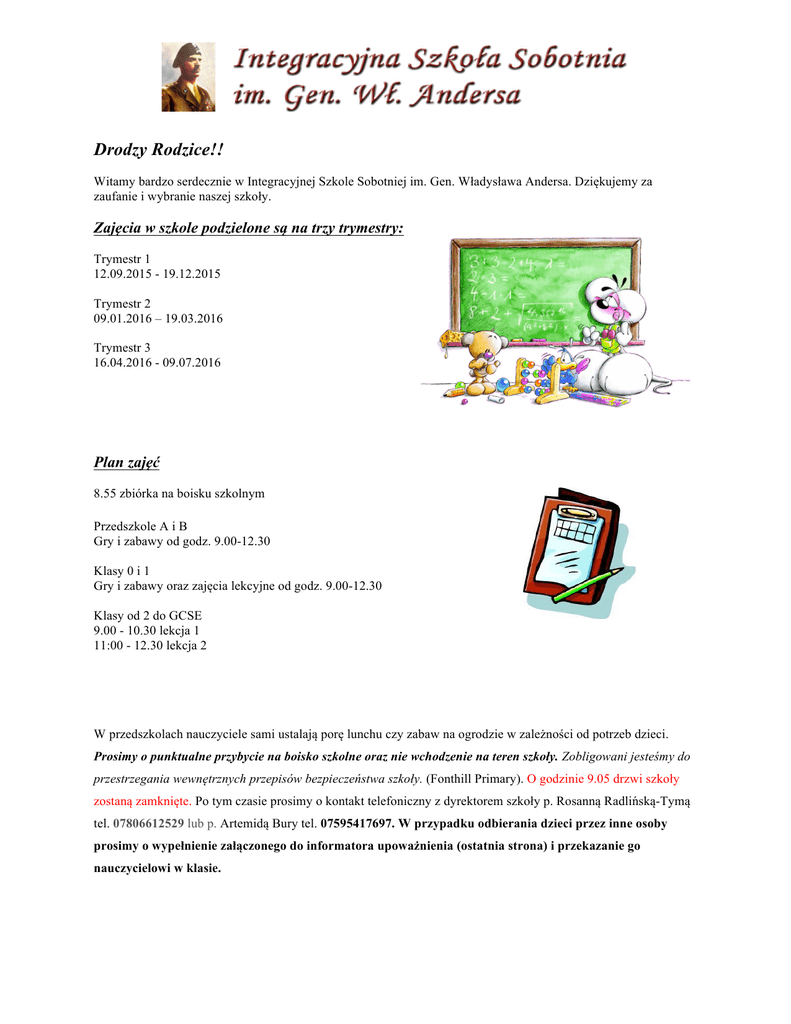 Drodzy Rodzice!! Witamy bardzo serdecznie w Integracyjnej Szkole Sobotniej im. Gen. Władysława Andersa. Dziękujemy za zaufanie i wybranie naszej szkoły. Zajęcia w szkole podzielone są na trzy trymestry: Trymestr 1 12.09.2015 - 19.12.2015 Trymestr 2 09.01.2016 – 19.03.2016 Trymestr 3 16.04.2016 - 09.07.2016 Plan zajęć 8.55 zbiórka na boisku szkolnym Przedszkole A i B Gry i zabawy od godz. 9.00-12.30 Klasy 0 i 1 Gry i zabawy oraz zajęcia lekcyjne od godz. 9.00-12.30 Klasy od 2 do GCSE 9.00 - 10.30 lekcja 1 11:00 - 12.30 lekcja 2 W przedszkolach nauczyciele sami ustalają porę lunchu czy zabaw na ogrodzie w zależności od potrzeb dzieci. Prosimy o punktualne przybycie na boisko szkolne oraz nie wchodzenie na teren szkoły. Zobligowani jesteśmy do przestrzegania wewnętrznych przepisów bezpieczeństwa szkoły. (Fonthill Primary). O godzinie 9.05 drzwi szkoły zostaną zamknięte. Po tym czasie prosimy o kontakt telefoniczny z dyrektorem szkoły p. Rosanną Radlińską-Tymą tel. 07806612529 lub p. Artemidą Bury tel. 07595417697. W przypadku odbierania dzieci przez inne osoby prosimy o wypełnienie załączonego do informatora upoważnienia (ostatnia strona) i przekazanie go nauczycielowi w klasie. Strój Prosimy o schludny strój dostosowany do warunków panujących na zewnątrz. W szkole obowiązuje obuwie sportowe. Zabrania się przychodzenia w butach na obcasach, szpilkach i klapkach itp. Prosimy o podpisanie dzieciom w przedszkolach oraz w klasie 0 i 1 kurtek, butów, czapek (w widocznym miejscu), oraz plecaków i przyborów szkolnych. Zdrowie najważniejsze Szkoła promuje zdrowy styl życia. W związku z tym prosimy aby w lunch box’ie dzieci znalazły się: Owoce, warzywa, woda, sok, mleko Zabrania sie na terenie szkoły spożywania: słodyczy, (batonów, ciastek, cukierków), orzechów i produktów zawierających orzechy Chipsów, coli, napojów gazowanych i innych napojów energetycznych. Nieobecności W razie nieobecności ucznia w szkole prosimy o kontakt tel. lub e-mailowym z wychowawcą klasy najpóźniej do piątku. Prosimy o śledzenie na bierząco strony szkoły. Tam umieszczane będą najważniejsze informacje i formularze. Na stronie mogą państwo przeczytać również co dziecko robiło w szkole oraz jakie są zadania domowe. http://issb.info/szkola-im-gen-wl-andersa.html (szkoła im. W. Gen. Andersa) Każdy rodzic ma obowiązek zapoznać się z regulaminem szkoły, dostępnym na stronie: http://issb.info/regulamin-szkoly-fh.html Płatność Opłaty za szkołę w roku szkolnym 2015/2016 liczone są w następujący sposób: 8.00 GBP za sobotę za jedno dziecko 12.00 GBP za sobotę za dwoje i więcej dzieci W roku szkolnym 2015/2016 jest 36 sobót: Trymestr 1: wrzesień-grudzień - 14 sobót Trymestr 2: styczeń-marzec - 10 sobót Trymestr 3: kwiecień-lipiec - 12 sobót Otrzymacie Państwo fakturę za cały rok szkolny na adres email podany podczas rejestracji. Faktury będą w formacie PDF, z terminem płatności 12 dni i możliwością wyboru między trzema formami płatności: całość z góry z 5% rabatem, 3 raty, 9 rat. Zgodnie z Regulaminem Szkoły brak opłaty za szkołę uniemożliwia udział dzieci w zajęciach szkolnych. Nieobecność dziecka na zajęciach nie zwalnia z opłaty za szkołę. Inne opłaty, dotyczące na przykład podręczników lub imprez szkolnych, również będą fakturowane. Przyjmujemy wyłącznie wpłaty na konto bankowe: Bank: NatWest Name: Integrative Saturday School Sort Code: 60-08-24 Account: 61692255 Reference: nr faktury lub imię i nazwisko dziecka Terminy płatności za rok szkolny 2015/2016 Jeśli wybrali Państwo płatność jednorazową z 5% zniżką, proszę o dokonanie wpłaty na konto szkoły zgodnie z terminem podanym na fakturze. Jeśli wybrali Państwo płatność w 3 ratach, proszę o dokonanie wpłat na konto szkoły zgodnie z poniższymi terminami: Rata Płatna do 1 dziecko 2 lub więcej dzieci 1 1.09.2015 £112 £168 2 31.12.2015 £80 £120 3 8.04.2016 £96 £144 Jeśli wybrali Państwo płatnośćw 9 ratach, proszę o dokonanie wpłat na konto szkoły zgodnie z poniższymi terminami: Rata Płatna do 1 dziecko 2 lub więcej dzieci 1 1.09.2015 £32 £48 2 1.10.2015 £32 £48 3 1.11.2015 £32 £48 4 1.12.2015 £32 £48 5 1.01.2016 £32 £48 6 1.02.2016 £32 £48 7 1.03.2016 £32 £48 8 1.04.2016 £32 £48 9 1.05.2016 £32 £48 Przypominam, że brak terminowej wpłaty na koncie szkoły będzie skutkować doliczeniem opłaty administracyjnej w wysokości £5. UPOWAŻNIENIE Upoważniam do odbioru mojego dziecka ……………………………………………………......, z klasy …… następujące osoby: 1)…………………………………………………………………………………………………… tel. kontaktowy: …………………………………………. 2)…………………………………………………………………………………………………… tel. kontaktowy: …………………………………………. Hasło upoważniające do odbioru dziecka: ……………………………………………………………………………………………………… ………………………………………………… (imię i nazwisko osoby upoważniającej) ………………………………………………… (pokrewieństwo) …………………………………………………. (data) ………………………………………………… (podpis) ………………………………………………… (tel. kontaktowy)