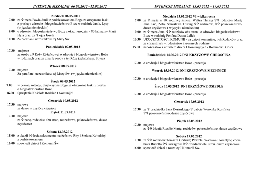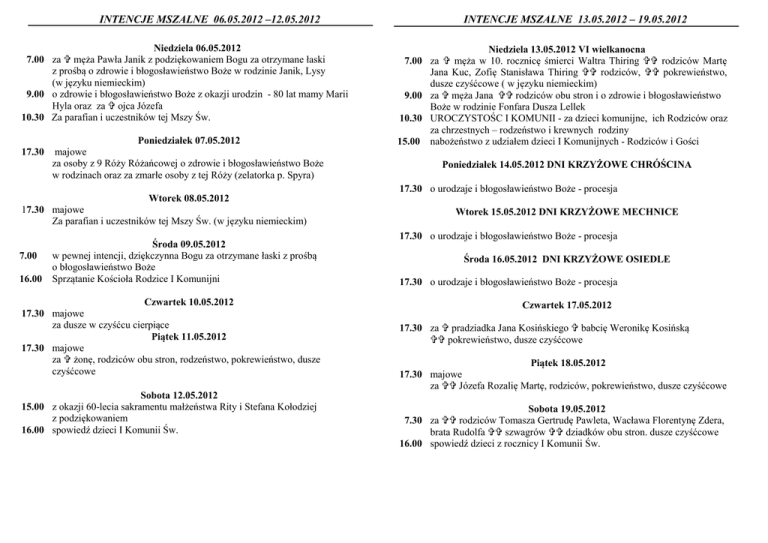 INTENCJE MSZALNE 06.05.2012 –12.05.2012 Niedziela 06.05.2012 7.00 za męża Pawła Janik z podziękowaniem Bogu za otrzymane łaski z prośbą o zdrowie i błogosławieństwo Boże w rodzinie Janik, Lysy (w języku niemieckim) 9.00 o zdrowie i błogosławieństwo Boże z okazji urodzin - 80 lat mamy Marii Hyla oraz za ojca Józefa 10.30 Za parafian i uczestników tej Mszy Św. 17.30 Poniedziałek 07.05.2012 majowe za osoby z 9 Róży Różańcowej o zdrowie i błogosławieństwo Boże w rodzinach oraz za zmarłe osoby z tej Róży (zelatorka p. Spyra) INTENCJE MSZALNE 13.05.2012 – 19.05.2012 Niedziela 13.05.2012 VI wielkanocna 7.00 za męża w 10. rocznicę śmierci Waltra Thiring rodziców Martę Jana Kuc, Zofię Stanisława Thiring rodziców, pokrewieństwo, dusze czyśćcowe ( w języku niemieckim) 9.00 za męża Jana rodziców obu stron i o zdrowie i błogosławieństwo Boże w rodzinie Fonfara Dusza Lellek 10.30 UROCZYSTOŚC I KOMUNII - za dzieci komunijne, ich Rodziców oraz za chrzestnych – rodzeństwo i krewnych rodziny 15.00 nabożeństwo z udziałem dzieci I Komunijnych - Rodziców i Gości Poniedziałek 14.05.2012 DNI KRZYŻOWE CHRÓŚCINA 17.30 o urodzaje i błogosławieństwo Boże - procesja Wtorek 08.05.2012 17.30 majowe Za parafian i uczestników tej Mszy Św. (w języku niemieckim) 7.00 16.00 Środa 09.05.2012 w pewnej intencji, dziękczynna Bogu za otrzymane łaski z prośbą o błogosławieństwo Boże Sprzątanie Kościoła Rodzice I Komunijni Czwartek 10.05.2012 17.30 majowe za dusze w czyśćcu cierpiące Piątek 11.05.2012 17.30 majowe za żonę, rodziców obu stron, rodzeństwo, pokrewieństwo, dusze czyśćcowe Sobota 12.05.2012 15.00 z okazji 60-lecia sakramentu małżeństwa Rity i Stefana Kołodziej z podziękowaniem 16.00 spowiedź dzieci I Komunii Św. Wtorek 15.05.2012 DNI KRZYŻOWE MECHNICE 17.30 o urodzaje i błogosławieństwo Boże - procesja Środa 16.05.2012 DNI KRZYŻOWE OSIEDLE 17.30 o urodzaje i błogosławieństwo Boże - procesja Czwartek 17.05.2012 17.30 za pradziadka Jana Kosińskiego babcię Weronikę Kosińską pokrewieństwo, dusze czyśćcowe Piątek 18.05.2012 17.30 majowe za Józefa Rozalię Martę, rodziców, pokrewieństwo, dusze czyśćcowe Sobota 19.05.2012 7.30 za rodziców Tomasza Gertrudę Pawleta, Wacława Florentynę Zdera, brata Rudolfa szwagrów dziadków obu stron. dusze czyśćcowe 16.00 spowiedź dzieci z rocznicy I Komunii Św. 6 maja 2012 INTENCJE MSZALNE 20.05.2012 – 27.05.2012 7.00 9.00 10.30 14.30 17.30 7.00 17.30 13.00 17.30 7.00 19.00 7.30 7.00 9.00 10.30 Niedziela 20.05.2012 WNIEBOWSTĄPIENIE PAŃSKIE za męża Mariana Maćkowiak w 10. rocznicę śmierci, rodziców obu stron, siostrę, bratową, pokrewieństwo i o zdrowie i błogosławieństwo w rodzinie za rodziców, rodzeństwo, pokrewieństwo Nowak Dornfeld oraz o zdrowie i błogosławieństwo Boże w rodzinie Nowak Biskup Labusga Sosna Rocznica dzieci I Komunii - za ich Rodziców oraz chrzestnych, rodzeństwo i pokrewieństwo (z oddaniem karteczki I Piątków Serca Jezusa) majowe z udziałem dzieci z rocznicy I Komunii wraz z Rodzicami Poniedziałek 21.05.2012 majowe I rocznica mamy Gertrudy Sowada Wtorek 22.05.2012 Za parafian i uczestników tej Mszy Św. (w języku niemieckim) majowe za wnuków z okazji urodzin o opiekę Anioła Stróża i błogosławieństwo w rodzinach Środa 23.05.2012 z podziękowaniem Bogu za otrzymane łaski z prośbą o opiekę Bożą z okazji 50-lecia sakramentu małżeństwa Annelisy i Rudolfa Glomb o błogosławieństwo Boże w rodzinie Czwartek 24.05.2012 majowe w intencji osób z 4 Róży Różańcowej i ich rodzin oraz za osoby Marię Scheinberg, Jadwigę Mumot, Krystynę Hullin, Marię Nicpoń, Klarę Schabe Piątek 25.05.2012 o urodzaje i błogosławieństwo Boże w pracy na roli i w ogrodach ku czci Św. Urbana i procesja spotkanie modlitewne młodzieży naszej parafi i młodzieży z dekanatu Sobota 26.05.2012 majowe w intencji Matek żyjących i zmarłych Niedziela 27.05.2012 za rodziców obu stron Wieschalla Glomb, wnuka Łukasza, 3 braci, szwagra i o zdrowie i błogosławieństwo Boże w rodzinie z podziękowaniem Bogu za odebrane łaski z prośbą o opiekę Bożą w rodzinach Kluczny, Szymaniec oraz za rodziców, rodzeństwo i pokrewieństwo za ojca Pawła Knosala i o zdrowie i błogosławieństwo Boże w rodzinie Holek, Knosala, Mikietyn Nr 199 www.parafia.chroscina.eu Pierwsza Komunia Święta - 2012 1. 2. 3. 4. 5. 6. 7. 8. 9. 10. 11. 12. 13. 14. 15. Michał Bednorz Maciej Cechowski Klaudiusz Gonsior Anna Górny Daniel Hanack Paulina Holek Maksymilian Jarek Natalia Kania Jakub Leśniak Aleksander Liskowicz Paulina Malosczyk Julia Niedziela Patrycja Sękowska Wiktoria Sprung Jakub Szczeciński Niech żyje Jezus w sercu mym… Gratuluję Wam kochane dzieci przyjęcia Pana Jezusa do swojego serca. Idźcie z Jezusem przez całe życie do życia wiecznego w Niebie – do Domu Ojca. Gratuluję Rodzicom dzieci Komunijnych za troskę o Boga w sercach dzieci, w rodzinie i w domu. Święta Maryja, którą kochajcie w nabożeństwach majowych, jest Waszą pośredniczką i przewodniczką w codzienności i w radościach życia. Wasz Ksiądz Proboszcz