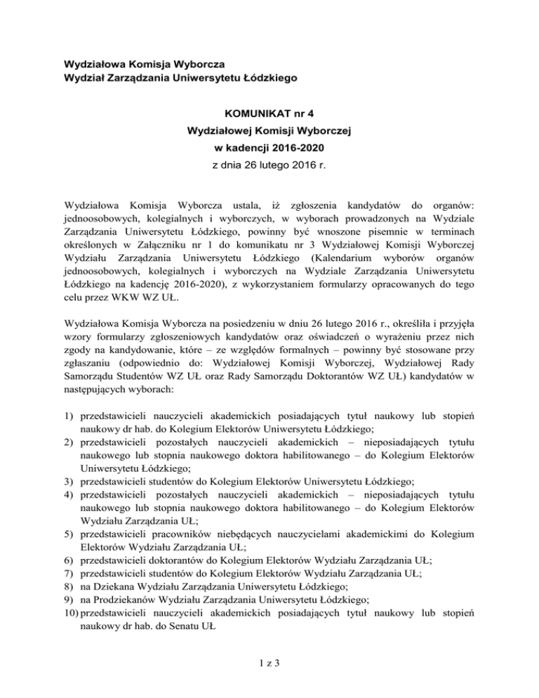 Wydziałowa Komisja Wyborcza Wydział Zarządzania Uniwersytetu Łódzkiego KOMUNIKAT nr 4 Wydziałowej Komisji Wyborczej w kadencji 2016-2020 z dnia 26 lutego 2016 r. Wydziałowa Komisja Wyborcza ustala, iż zgłoszenia kandydatów do organów: jednoosobowych, kolegialnych i wyborczych, w wyborach prowadzonych na Wydziale Zarządzania Uniwersytetu Łódzkiego, powinny być wnoszone pisemnie w terminach określonych w Załączniku nr 1 do komunikatu nr 3 Wydziałowej Komisji Wyborczej Wydziału Zarządzania Uniwersytetu Łódzkiego (Kalendarium wyborów organów jednoosobowych, kolegialnych i wyborczych na Wydziale Zarządzania Uniwersytetu Łódzkiego na kadencję 2016-2020), z wykorzystaniem formularzy opracowanych do tego celu przez WKW WZ UŁ. Wydziałowa Komisja Wyborcza na posiedzeniu w dniu 26 lutego 2016 r., określiła i przyjęła wzory formularzy zgłoszeniowych kandydatów oraz oświadczeń o wyrażeniu przez nich zgody na kandydowanie, które – ze względów formalnych – powinny być stosowane przy zgłaszaniu (odpowiednio do: Wydziałowej Komisji Wyborczej, Wydziałowej Rady Samorządu Studentów WZ UŁ oraz Rady Samorządu Doktorantów WZ UŁ) kandydatów w następujących wyborach: 1) przedstawicieli nauczycieli akademickich posiadających tytuł naukowy lub stopień naukowy dr hab. do Kolegium Elektorów Uniwersytetu Łódzkiego; 2) przedstawicieli pozostałych nauczycieli akademickich – nieposiadających tytułu naukowego lub stopnia naukowego doktora habilitowanego – do Kolegium Elektorów Uniwersytetu Łódzkiego; 3) przedstawicieli studentów do Kolegium Elektorów Uniwersytetu Łódzkiego; 4) przedstawicieli pozostałych nauczycieli akademickich – nieposiadających tytułu naukowego lub stopnia naukowego doktora habilitowanego – do Kolegium Elektorów Wydziału Zarządzania UŁ; 5) przedstawicieli pracowników niebędących nauczycielami akademickimi do Kolegium Elektorów Wydziału Zarządzania UŁ; 6) przedstawicieli doktorantów do Kolegium Elektorów Wydziału Zarządzania UŁ; 7) przedstawicieli studentów do Kolegium Elektorów Wydziału Zarządzania UŁ; 8) na Dziekana Wydziału Zarządzania Uniwersytetu Łódzkiego; 9) na Prodziekanów Wydziału Zarządzania Uniwersytetu Łódzkiego; 10) przedstawicieli nauczycieli akademickich posiadających tytuł naukowy lub stopień naukowy dr hab. do Senatu UŁ 1z3 11) przedstawiciela pozostałych nauczycieli akademickich – nieposiadających tytułu naukowego lub stopnia naukowego doktora habilitowanego – do Senatu UŁ 12) przedstawiciela studentów Wydziału do Senatu UŁ; 13) przedstawicieli pozostałych nauczycieli akademickich – nieposiadających tytułu naukowego lub stopnia naukowego doktora habilitowanego – do Rady Wydziału Zarządzania UŁ; 14) przedstawicieli pracowników niebędących nauczycielami akademickimi do Rady Wydziału Zarządzania UŁ; 15) przedstawicieli doktorantów Wydziału do Rady Wydziału Zarządzania UŁ; 16) przedstawicieli studentów Wydziału do Rady Wydziału Zarządzania UŁ; 17) przedstawiciela nauczycieli akademickich posiadających tytuł naukowy lub stopień naukowy doktora habilitowanego do Rady Bibliotecznej UŁ. Formularze zgłoszeniowe o których mowa wyżej, stanowią załączniki do niniejszego dokumentu. Wydziałowa Komisja Wyborcza ustala, iż zgłoszenia kandydatów do organów jednoosobowych, kolegialnych i wyborczych składne po terminie oznaczonym przez WKW lub w sposób inny niż określony przez WKW (na podstawie przepisów Statutu UŁ: §90, §98, ust. 1, 3, 4 i 5, §112, pkt. 2 i 3) – nie będą przyjmowane. Ponadto, Wydziałowa Komisja Wyborcza, działając na podstawie przepisów Statutu UŁ (§90, pkt. 7) ustala, iż dokumentacja poszczególnych głosowań wyborczych będzie obejmować: 1. Listę osób, posiadających czynne prawo wyborcze, które wzięły udział w głosowaniu. Osoba, której wydawana jest karta do głosowania (wyborcza) składa na liście przy swoim imieniu i nazwisku odręczny, czytelny podpis potwierdzając tym samym odbiór karty. W nagłówku listy muszą znajdować się następujące informacje: jakiego głosowania dotyczy lista obecności (która grupa społeczności akademickiej głosowała i/lub wyborów którego organu Uniwersytetu dokonywano), data przeprowadzenia wyborów, termin wyborów (podstawowy/uzupełniający), tura wyborów. 2. Pisemne zgłoszenia kandydatów wraz z pisemnymi oświadczeniami kandydatów o wyrażeniu przez nich zgody na kandydowanie (złożone na formularzach zgłoszeniowych określonych przez WKW). 3. Karta wyników głosowania – wypełniona przez komisję skrutacyjną bezpośrednio po obliczeniu głosów podczas każdego głosowania. Karta wyników głosowania powinna zawierać następujące informacje: jakiego głosowania dotyczy (która grupa społeczności akademickiej głosowała i/lub wyborów którego organu Uniwersytetu dokonywano), data przeprowadzenia wyborów, termin wyborów (podstawowy/uzupełniający), tura wyborów, imiona i nazwiska członków komisji skrutacyjnej, 2z3 ilość osób uprawnionych do głosowania, ilość głosów oddanych, ilość głosów ważnych, ilość głosów nieważnych, wyniki głosowania: imiona i nazwiska kandydatów wraz z ilości oddanych na nich głosów, odręczne podopisy członków komisji skrutacyjnej. 4. Wykorzystane karty do głosowania (karty wyborcze) – zgodne z wymogami określonymi w przepisach Statutu UŁ: §106 pkt. 4 i 5, §108, §112 pkt. 4, 5 i 6. 5. Protokół z wyborów opisujący w sposób wyczerpujący przebieg zebrania wyborczego i wyniki głosowania, lub przebieg wyborów przedstawicieli do organów kolegialnych zorganizowanych w innej formie zgodnie z przepisami Statutu UŁ (§111). Obowiązek sporządzenia powyższej dokumentacji i jej dostarczenia do Wydziałowej Komisji Wyborczej spoczywa na osobach organizujących i przeprowadzających zebrania wyborcze lub głosowania w innej formie dopuszczalnej przez Statut UŁ