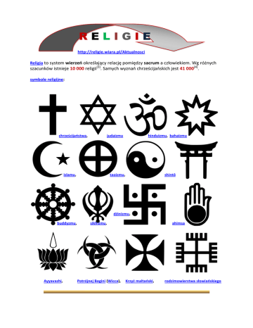 RELIGIE http://religie.wiara.pl/Aktualnosci Religia to system wierzeo określający relację pomiędzy sacrum a człowiekiem. Wg różnych szacunków istnieje 10 000 religii[3]. Samych wyznao chrześcijaoskich jest 41 000[4]. symbole religijne: chrześcijaostwa, judaizmu islamu, hinduizmu, bahaizmu taoizmu, shintō dźinizmu, buddyzmu, Ayyavazhi, sikhizmu, Potrójnej Bogini (Wicca), ahimsa Krzyż maltaoski, rodzimowierstwa słowiaoskiego BUDDYZM Buddyzm Flaga buddyjska http://religie.wiara.pl/Buddyzm/Czym_jest_buddyzm# Wojciech Cejrowski o Buddyzmie - https://www.youtube.com/watch?v=kAMbtGLFfW8 . Buddyzm w Polsce: 1. 2. 3. 4. 5. 6. 7. 8. 9. 10. 11. 12. 13. 14. 15. 16. 17. 18. 19. 20. 21. 22. 23. 24. 25. 26. 27. 28. Szczecin — Główna Siedziba Misji — Ośrodek Misyjny — Biuro Misji Katowice — Ośrodek Misyjny (Shangpa Kagyu) Kazimierz Dolny — Ośrodek Misyjny (Soto Zen) Kraków — Krakowska Grupa Szambali Lublin — Ośrodek Misyjny (Soto Zen) Lublin — Ośrodek Misyjny Zangdok Palri Poznao — Świątynia Buddyjska Engakuin (Soto Zen i Ningma) Poznao — Ośrodek Misyjny Yeshe Khorlo Radom — Ośrodek Misyjny (Karma Kagyu) Sulejówek — Instytut Marpy Szczecin — Świątynia Trzech Klejnotów (Soto Zen) Szczecin — Szambala Polska (Kagyu i Ningma) Ścieniawa Mała — Gom Den Cie Lin (Shangpa Kagyu) Toruo — Sakya Dechen Choling (Sakya) Warszawa — Ośrodek Misyjny Ho Hakubaji Sangen (Rinzai Zen) Warszawa — Polska Sangha Jodo Shinshu Nishi Honganji-ha (Jodo Shinshu) Warszawa — Ośrodek Informacyjny Misji (ogólny) Warszawa — Świątynia Bukkoin (Soto Zen) Warszawa — Świątynia Shogakuin (Soto Zen) Warszawa — Warszawska Grupa Szambali Warszawa — Dro Phen Dziang Ciub Ling Warszawa — Drikung Samten Choling Warszawa — Sangha Uśmiech Buddy Warszawa — Jamchoe Choeling Wólka Kosowska — Ośrodek Misyjny Ho Hakubaji Sangen (Rinzai Zen) Wrocław — Świątynia Buddyjska Horakuji (Rinzai Zen i Soto Zen) Wrocław — Ośrodek Misyjny Druk Jesze Dordże (Drukpa Kagyu) Wrocław — Ośrodek Misyjny (Soto Zen) 29. Wrocław — Ośrodek Misyjny Tekisuian (Rinzai Zen) HINDUIZM Hinduizm Hare Kriszna - podstawowe informacje Świątynia Śri Wara Lakszmi Narszingadew w Warszawie. Działają też aśramy, 34-143 Lanckorona, ul. Św. Jana 15, Aśram Bhole Baba Seva Dham w Lanckoronie. Aśram posiada miejsca noclegowe i gastronomię, księgarnie. Prowadzi kursy jogi, medytacji, organizuje ceremonie religijne i inne programy[1]. Stowarzyszenie Świadomości Duchowej Miłości, ul. Basztowa 5/5A w Krakowie, a także dom w Brzegach koło Krakowa. https://pl.wikipedia.org/wiki/Hinduizm_w_Polsce. Joga to praktyka hinduizmu, który oddaje cześd także demonom – mówi koordynator Śląskiego Centrum Informacji o Sektach i Grupach Psychomanipulacyjnych. Podkreśla on, że Hindusi, którzy są chrześcijanami, nie praktykują jogi, ponieważ wiedzą, że nie są to neutralne dwiczenia relaksacyjne, ale hinduistyczna praktyka religijna. – Hinduizm natomiast jest nie do pogodzenia z chrześcijaostwem. http://religie.wiara.pl/doc/471800.Joga-niewinna-gimnastyka Synkretyzm, czyli mieszanka wielu religii. Zakon Sufich przyjmuje 30.IV. 1988 na Wawelu grupę polskich uczniów (murid). Liderem w naszym kraju jest Starszy Przewodnik Zakonu Uzdrawiania Jakub Krzywobłocki. Organizacja liczy w Polsce ok. 500 członków. Źródłem nauk religijnych ZZS są; Wedy i Bhagawad Gita, Dammapada, Zend Avesta, Biblia, Ewangelie Apokryficzne, Koran, Tao-te-king. Funkcjonuje pięd szkół: Zakonu Sufi zwanego też Szkołą Ezoteryczną (siedem stopni inicjacji), Zakonu Uzdrawiania (niekonwencjonalne metody uzdrawiania), Uzdrawiania Świadomości i Atmosfery Agnihotra" w Toruniu. http://www.psychomanipulacja.pl/baza-informacji.htm Centrum Doskonalenia Człowieka "Joga Sumoi" - 1985 r. w Krakowie. http://religie.wiara.pl/doc/471864.Joga-Sumoi-Spolka-z-ograniczona-odpowiedzialnoscia Agnihotra to hinduistyczny rytuał oddawania czci bogowi słooca i ognia – Agni. Niektóre działające w Polsce organizacje praktykujące Agnihotrę przedstawiają ją nie jako obrzęd lecz jako zabieg leczniczy lub ekologiczny. Tak robią istniejącym Międzynarodowym Ośrodku Homa Terapii "Agnifarm" w Dachowie (woj. dolnośląskie), "Oazie" – Centrum Uzdrawiania w Wysokiej oraz gospodarstwie ekologicznym w Węgorzynie. http://religie.wiara.pl/doc/471863.Agnihotra-Wladca-Plomieni http://tlvp.net/~b.mikolajewska/booknook/Mahabharata/MahaSlowniczek.htm ISLAM Islam Półksiężyc symbolem islamu Muzułmaoskie święta Co wiemy o islamie? Wobec islamu Koran - Podręczna wyszukiwarka Koranu Gminy Muzułmaoskie - http://poland-muslims.de.tl/Gminy-Muzulmanskie-w-Polsce.htm http://www.mzr.pl/pl/ Meczet w Bohonikach Meczet w Kruszynianach Meczet w Warszawie Meczet w Poznaniu. Meczet w Gdaosku JUDAIZM Judaizm Żydzi synagoga Judaizm Synagoga Remuh w Krakowie Synagoga im. Małżonków Nożyków w Warszawie Synagoga Reicherów w Łodzi Synagoga Tempel w Krakowie M E N O R A Synagoga Chewra Nosim w Lublinie Synagoga pod Białym Bocianem we Wrocławiu Synagoga Chewra Lomdei Misznajot w Oświęcimiu Synagoga w Jeszywas Chachmej Lublin Nowa Synagoga w Gdaosku-Wrzeszczu Synagoga Bajs Nusn w Nowym Sączu Synagoga w Bobowej, Synagoga w Bielsku-Białej, Synagoga w Bytomiu , Synagoga w Gliwicach, Synagoga w Katowicach, Synagoga w Legnicy, Synagoga w Łodzi, Synagoga w Poznaniu, Synagoga w Szczecinie, Synagoga w Wałbrzychu, Mała Synagoga we Wrocławiu, Synagoga w Żarach, Synagoga Towarzystwa Beit Warszawa w Warszawie ,Synagoga chasydów z Chabad-Lubavitch w Warszawie, Synagoga na nowym cmentarzu żydowskim w Lublinie, Synagoga w Leżajsku, Synagoga w Lelowie. MORMONI Mormoni Siedziba w kaplicy mormooskiej na Woli, ul. Wolska 142. W niedzielę, trzy nabożeostwa: spotkanie sakramentalne, szkoła niedzielna oraz spotkanie kapłaostwa lub stowarzyszenia pomocy[1]. - członkowie Kościoła Jezusa Chrystusa Świętych w Dniach Ostatnic