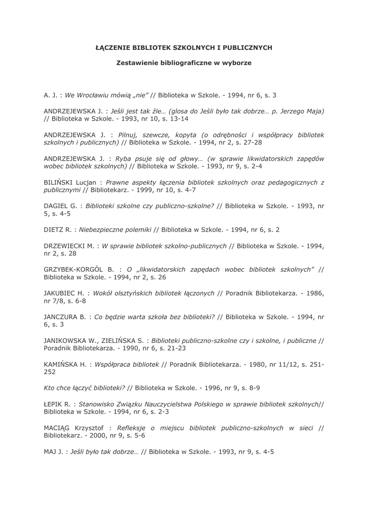 ŁĄCZENIE BIBLIOTEK SZKOLNYCH I PUBLICZNYCH Zestawienie bibliograficzne w wyborze A. J. : We Wrocławiu mówią „nie” // Biblioteka w Szkole. - 1994, nr 6, s. 3 ANDRZEJEWSKA J. : Jeśli jest tak źle… (glosa do Jeśli było tak dobrze… p. Jerzego Maja) // Biblioteka w Szkole. - 1993, nr 10, s. 13-14 ANDRZEJEWSKA J. : Pilnuj, szewcze, kopyta (o odrębności i współpracy bibliotek szkolnych i publicznych) // Biblioteka w Szkole. - 1994, nr 2, s. 27-28 ANDRZEJEWSKA J. : Ryba psuje się od głowy… (w sprawie likwidatorskich zapędów wobec bibliotek szkolnych) // Biblioteka w Szkole. - 1993, nr 9, s. 2-4 BILIŃSKI Lucjan : Prawne aspekty łączenia bibliotek szkolnych oraz pedagogicznych z publicznymi // Bibliotekarz. - 1999, nr 10, s. 4-7 DAGIEL G. : Biblioteki szkolne czy publiczno-szkolne? // Biblioteka w Szkole. - 1993, nr 5, s. 4-5 DIETZ R. : Niebezpieczne polemiki // Biblioteka w Szkole. - 1994, nr 6, s. 2 DRZEWIECKI M. : W sprawie bibliotek szkolno-publicznych // Biblioteka w Szkole. - 1994, nr 2, s. 28 GRZYBEK-KORGÓL B. : O „likwidatorskich zapędach wobec bibliotek szkolnych” // Biblioteka w Szkole. - 1994, nr 2, s. 26 JAKUBIEC H. : Wokół olsztyńskich bibliotek łączonych // Poradnik Bibliotekarza. - 1986, nr 7/8, s. 6-8 JANCZURA B. : Co będzie warta szkoła bez biblioteki? // Biblioteka w Szkole. - 1994, nr 6, s. 3 JANIKOWSKA W., ZIELIŃSKA S. : Biblioteki publiczno-szkolne czy i szkolne, i publiczne // Poradnik Bibliotekarza. - 1990, nr 6, s. 21-23 KAMIŃSKA H. : Współpraca bibliotek // Poradnik Bibliotekarza. - 1980, nr 11/12, s. 251252 Kto chce łączyć biblioteki? // Biblioteka w Szkole. - 1996, nr 9, s. 8-9 ŁEPIK R. : Stanowisko Związku Nauczycielstwa Polskiego w sprawie bibliotek szkolnych// Biblioteka w Szkole. - 1994, nr 6, s. 2-3 MACIĄG Krzysztof : Refleksje o miejscu bibliotek publiczno-szkolnych w sieci // Bibliotekarz. - 2000, nr 9, s. 5-6 MAJ J. : Jeśli było tak dobrze… // Biblioteka w Szkole. - 1993, nr 9, s. 4-5 NIEDZIELA S. : Nie łączyć, lecz współpracować // Biblioteka w Szkole. - 1992, nr 5, s. 22-23 NIEMCZYKOWA A. : Dziwne jest w tej materii rzeczy pomieszanie // Poradnik Bibliotekarza. - 1981, nr 5, s. 112-114 OLEJNICZAK B. : Stanowisko w sprawie łódzkich bibliotek szkolnych // Biblioteka w Szkole. - 1996, nr 6, s. 16 Pomyślmy o bibliotekach szkolnych. List otwarty Rady Głównej Towarzystwa Nauczycieli Bibliotekarzy Szkół Polskich do władz samorządowych // Biblioteka w Szkole. - 1996, nr 1, s. 23 SEKULSKI J. : Dla czytelników nazwa biblioteki nie jest ważna // Biblioteka w Szkole. 1993, nr 10, s. 14-15 STANIÓW B. : Czy nowa ustawa o bibliotekach usankcjonuje łączenie bibliotek? // Biblioteka w Szkole. - 2008, nr 3, s. 1 TOMKIEWICZ B. : Biblioteka pierwszego kontaktu // Biblioteka w Szkole. - 1992, nr 1, s. 2-3 TOMKIEWICZ B. : Biblioteki szkolno-publiczne w opinii nauczycieli bibliotekarzy – członków TNBSP // Biblioteka w Szkole. - 1996, nr 9, s. 10-11 WASILEWSKI J. : Bibliotekarz do bicia // Biblioteka w Szkole. - 2005, nr 11, s. 1 WASILEWSKI Juliusz : Łączenie bibliotek - reaktywacja // Biblioteka w Szkole. - 2007, nr 4, s. WOJCIECHOWSKI J. : Biblioteka pierwszego kontaktu // Biblioteka w Szkole. - 1994, nr 6, s. 4 WOJCIECHOWSKI J. : Odrębność biblioteki szkolnej // Biblioteka w Szkole. - 2000, nr 6, s. 1-3 WOJCIECHOWSKI J. : Razem czy osobno? // Biblioteka w Szkole. - 1993, nr 9, s. 6-7 WYRZYKOWSKA U. : Biblioteka szkolno-publiczna? // Biblioteka w Szkole. - 1993, nr 6, s. 33