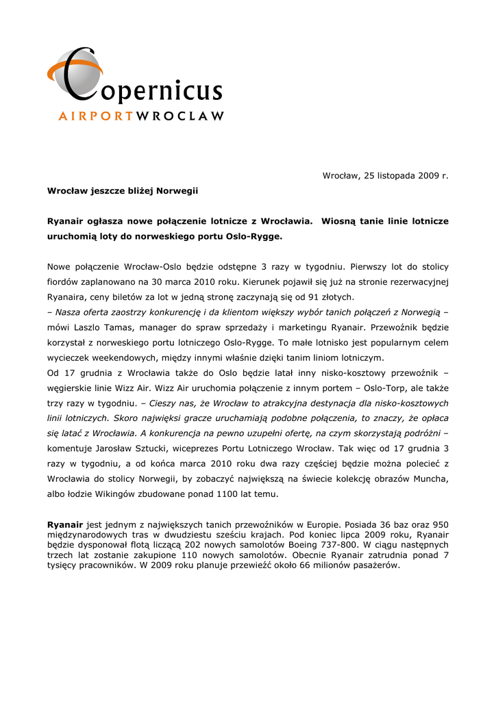 Wrocław, 25 listopada 2009 r. Wrocław jeszcze bliŜej Norwegii Ryanair ogłasza nowe połączenie lotnicze z Wrocławia. Wiosną tanie linie lotnicze uruchomią loty do norweskiego portu Oslo-Rygge. Nowe połączenie Wrocław-Oslo będzie odstępne 3 razy w tygodniu. Pierwszy lot do stolicy fiordów zaplanowano na 30 marca 2010 roku. Kierunek pojawił się juŜ na stronie rezerwacyjnej Ryanaira, ceny biletów za lot w jedną stronę zaczynają się od 91 złotych. – Nasza oferta zaostrzy konkurencję i da klientom większy wybór tanich połączeń z Norwegią – mówi Laszlo Tamas, manager do spraw sprzedaŜy i marketingu Ryanair. Przewoźnik będzie korzystał z norweskiego portu lotniczego Oslo-Rygge. To małe lotnisko jest popularnym celem wycieczek weekendowych, między innymi właśnie dzięki tanim liniom lotniczym. Od 17 grudnia z Wrocławia takŜe do Oslo będzie latał inny nisko-kosztowy przewoźnik – węgierskie linie Wizz Air. Wizz Air uruchomia połączenie z innym portem – Oslo-Torp, ale takŜe trzy razy w tygodniu. – Cieszy nas, Ŝe Wrocław to atrakcyjna destynacja dla nisko-kosztowych linii lotniczych. Skoro najwięksi gracze uruchamiają podobne połączenia, to znaczy, Ŝe opłaca się latać z Wrocławia. A konkurencja na pewno uzupełni ofertę, na czym skorzystają podróŜni – komentuje Jarosław Sztucki, wiceprezes Portu Lotniczego Wrocław. Tak więc od 17 grudnia 3 razy w tygodniu, a od końca marca 2010 roku dwa razy częściej będzie moŜna polecieć z Wrocławia do stolicy Norwegii, by zobaczyć największą na świecie kolekcję obrazów Muncha, albo łodzie Wikingów zbudowane ponad 1100 lat temu. Ryanair jest jednym z największych tanich przewoźników w Europie. Posiada 36 baz oraz 950 międzynarodowych tras w dwudziestu sześciu krajach. Pod koniec lipca 2009 roku, Ryanair będzie dysponował flotą liczącą 202 nowych samolotów Boeing 737-800. W ciągu następnych trzech lat zostanie zakupione 110 nowych samolotów. Obecnie Ryanair zatrudnia ponad 7 tysięcy pracowników. W 2009 roku planuje przewieźć około 66 milionów pasaŜerów. Port Lotniczy im. Mikołaja Kopernika we Wrocławiu połoŜony jest w południowo-zachodniej części Wrocławia, w odległości ok. 10 km od centrum miasta. Dynamiczny rozwój ruchu lotniczego port notuje od 2003 roku. W ciągu 5 lat liczba pasaŜerów wzrosła pięciokrotnie. W 2003 roku Strachowice miały 300 tysięcy podróŜnych, w 2008 roku było ich juŜ prawie 1.5 mln. Ze wzrostem ruchu związane są zmiany w lotniskowej infrastrukturze. W roku 2011 lotnisko wzbogaci się o nowy terminal. Jego początkowa przepustowość wyniesie 2 mln pasaŜerów, docelowo będzie moŜna tam obsłuŜyć 7 mln osób. Więcej informacji Sylwia Chmielarz Profit Communications [email protected] +48 512 036 303