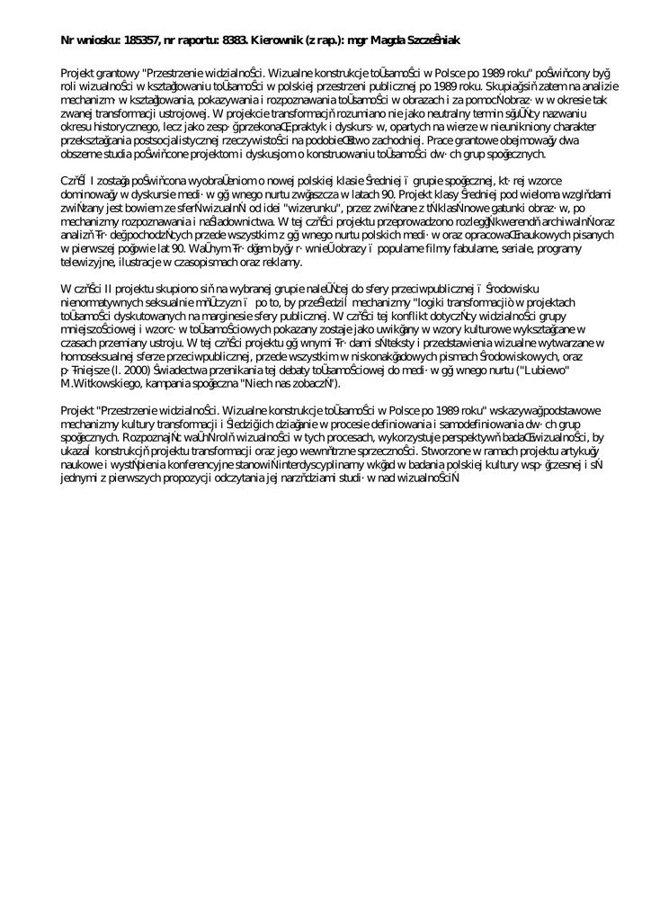 Nr wniosku: 185357, nr raportu: 8383. Kierownik (z rap.): mgr Magda