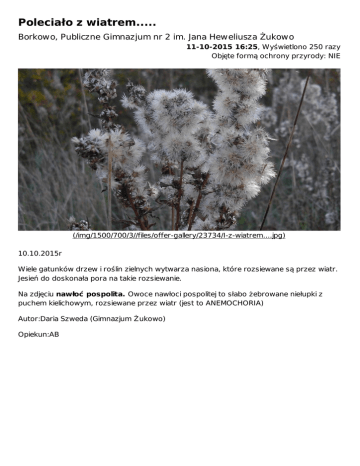 Poleciało z wiatrem..... Borkowo, Publiczne Gimnazjum nr 2 im. Jana Heweliusza Żukowo 11-10-2015 16:25, Wyświetlono 250 razy Objęte formą ochrony przyrody: NIE (/img/1500/700/3//files/offer-gallery/23734/I-z-wiatrem....jpg) 10.10.2015r Wiele gatunków drzew i roślin zielnych wytwarza nasiona, które rozsiewane są przez wiatr. Jesień do doskonała pora na takie rozsiewanie. Na zdjęciu nawłoć pospolita. Owoce nawłoci pospolitej to słabo żebrowane niełupki z puchem kielichowym, rozsiewane przez wiatr (jest to ANEMOCHORIA) Autor:Daria Szweda (Gimnazjum Żukowo) Opiekun:AB