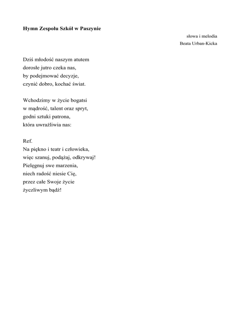 Hymn Zespołu Szkół w Paszynie słowa i melodia Beata Urban-Kicka Dziś młodość naszym atutem dorosłe jutro czeka nas, by podejmować decyzje, czynić dobro, kochać świat. Wchodzimy w życie bogatsi w mądrość, talent oraz spryt, godni sztuki patrona, która uwrażliwia nas: Ref. Na piękno i teatr i człowieka, więc szanuj, podążaj, odkrywaj! Pielęgnuj swe marzenia, niech radość niesie Cię, przez całe Swoje życie życzliwym bądź!