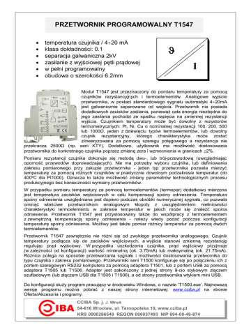 PRZETWORNIK PROGRAMOWALNY T1547 temperatura czujnika / 420 mA klasa dokładności: 0.1 separacja galwaniczna 2kV zasilanie z wyjściowej pętli prądowej w pełni programowalny obudowa o szerokości 6.2mm I Moduł T1547 jest przeznaczony do pomiaru temperatury za pomocą czujników rezystancyjnych i termoelementów. Analogowe wyjście przetwornika, w postaci standardowego sygnału automatyki 420mA jest galwanicznie separowane od wejścia. Przetwornik nie posiada dodatkowych zacisków zasilania, ponieważ cała energia niezbędna do jego zasilania pochodzi ze spadku napięcia na zmiennej rezystancji wyjścia. Czujnikiem temperatury może być dowolny z rezystorów termometrycznych: Pt, Ni, Cu o nominalnej rezystancji 100, 200, 500 lub 1000Ω, jeden z dziewięciu typów termoelementów, lub dowolny czujnik rezystancyjny, którego charakterystyka może zostać zlinearyzowana za pomocą szeregu potęgowego a rezystancja nie przekracza 2500Ω (np. serii KTY). Dodatkowo, użytkownik ma możliwość dostosowania przetwornika do konkretnego czujnika poprzez zmianę zera i wzmocnienia w granicach 2%. Pomiaru rezystancji czujnika dokonuje się metodą dwu-, lub trój-przewodową (uwzględniając oporność przewodów doprowadzających). Nie ma potrzeby wyboru czujnika, lub definiowania zakresu pomiarowego przy zakupie przetwornika - jeden typ przetwornika pozwala mierzyć temperaturę za pomocą różnych czujników w praktycznie dowolnym podzakresie temperatur (do 400ºC dla Pt1000). Oznacza to także możliwość zmiany parametrów technologicznych procesu produkcyjnego bez konieczności wymiany przetworników. W przypadku pomiaru temperatury za pomocą termoelementów (termopar) dodatkowo mierzona jest temperatura zacisków wejściowych w celu kompensacji spoiny odniesienia. Temperatura spoiny odniesienia uwzględniana jest dopiero podczas obróbki numerycznej sygnału, co pozwala ominąć właściwe przetwornikom analogowym kłopoty z uwzględnieniem nieliniowości charakterystyki termoelementu w zakresie temperatur w jakich może się znaleźć spoina odniesienia. Przetwornik T1547 jest przystosowany także do współpracy z termoelementem z zewnętrzną kompensacją spoiny odniesienia - należy wtedy podać podczas konfiguracji temperaturę spoiny odniesienia. Możliwy jest także pomiar różnicy temperatur za pomocą dwóch termoelementów. Przetwornik T1547 zewnętrznie nie różni się od zwykłego przetwornika analogowego. Czujnik temperatury podłącza się do zacisków wejściowych, a wyjście stanowi zmienną rezystancję regulując prąd wyjściowy. W przypadku uszkodzenia czujnika, prąd wyjściowy przyjmuje (w zależności od konfiguracji) wartość minimalną (ok. 3.75mA) lub maksymalną (ok. 21.75mA). Różnica polega na sposobie przetwarzania sygnału i możliwości dostosowania przetwornika do typu czujnika i zakresu pomiarowego. Przetworniki serii T1500 konfiguruje się po połączeniu ich z portem szeregowym RS232 komputera za pomocą adaptera T1501, lub z portem USB za pomocą adaptera T1505 lub T1506. Adapter jest zakończony z jednej strony 9-cio stykowym złączem szufladowym (lub złączem USB dla T1505 i T1506), a od strony przetwornika wtykiem mini USB. Do konfiguracji służy program pracujący w środowisku Windows, o nazwie ‘T1500.exe’. Najnowszą wersję programu można pobrać z naszej strony internetowej: www.cciba.pl na stronie Oferta/Akcesoria i programy. CCIBA Sp. j. J. Wnuk 54-616 Wrocław, ul. Tarnopolska 10, www.cciba.pl KRS 0000296549 REGON 006037493 NIP 894-00-49-874 Schemat blokowy 1 4 V 2 A/C 3 P 5 T1501, 5 Podczas pomiaru rezystancji prąd wymuszany przez źródło napięcia wywołuje spadek napięcia na rezystancji czujnika. Sygnał napięciowy z zacisków 2 i 3, po przejściu przez układ zabezpieczeń trafia do filtru dolnoprzepustowego, a następnie jest przetwarzany do postaci cyfrowej razem z prądem pobudzenia. Oprócz tego mierzona jest rezystancja przewodów doprowadzających czujnika. Mikroprocesor oblicza aktualną wartość temperatury i obsługuje łącze szeregowe. Wynik obliczeń jest przekazywany poprzez barierę galwaniczną do wyjściowego stopnia regulującego prąd. Wyjściowy układ zabezpieczeń chroni moduł przed przekroczeniem maksymalnego napięcia oraz przed zmianą jego polaryzacji. Prąd wyjściowy jest ograniczony wewnętrznie do 25mA. Część wejściowa przetwornika jest zasilana przez przetwornicę prądu stałego. Parametry toru wejściowego przetwornika są mierzone w procesie kalibracji i zapisane w pamięci nieulotnej. W pamięci nieulotnej zapisywane są również parametry konfiguracji: rodzaj czujnika, sposób pomiaru, parametry filtrów, współczynniki linearyzacji charakterystyki czujnika, zakres pomiarowy, poprawki zera i wzmocnienia, oraz notatki użytkownika i data ostatniej konfiguracji. Przetwarzanie sygnału Sygnał pochodzący z czujnika podlega filtracji. W przetworniku zastosowano kilka filtrów, które w sposób ‘inteligentny’ oczyszczają sygnał z zakłóceń. Na wstępie, napięcie termoelementu (lub spadek napięcia na termorezystorze) przechodzi przez filtr dolnoprzepustowy eliminujący zakłócenia wysokoczęstościowe. Cyfrowy filtr sieciowy usuwa zakłócenia o częstotliwości sieci energetycznej. Procesor śledzi również szumy pozostałe po wstępnej filtracji odrzucając zakłócenia przypadkowe. Ostateczna filtracja sygnału ma miejsce po wstępnych obliczeniach i jest opisywana jest dwoma parametrami, które może dobrać użytkownik: stałą czasową oraz zakresem filtracji. Ten ostatni parametr jest wyrażany w procentach zakresu pomiarowego i służy do określenia progu zmiany sygnału pomiędzy kolejnymi cyklami pomiarowymi, powyżej którego uśrednianie zaczyna się od nowa. W ten sposób możliwe jest zachowanie długiej stałej czasowej filtru i jednocześnie natychmiastowej reakcji na szybką zmianę sygnału wejściowego. Wartość mierzonego sygnału jest porównyw