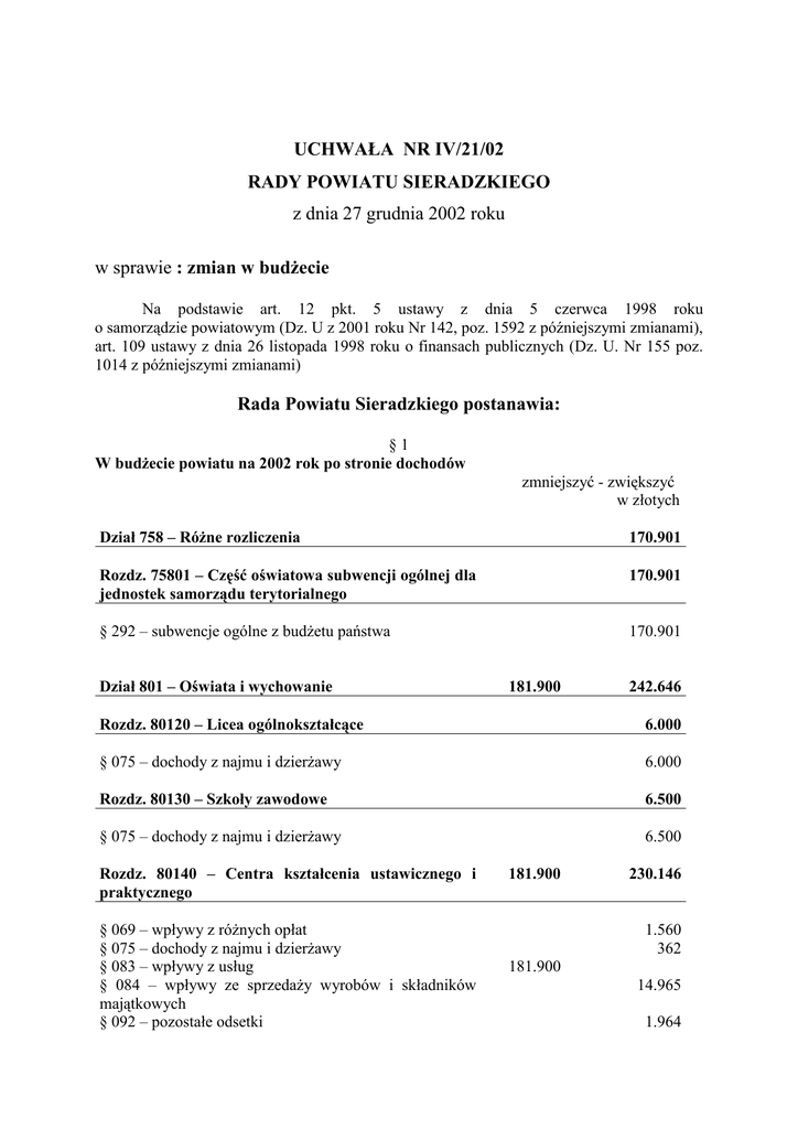 UCHWAŁA NR IV/21/02 RADY POWIATU SIERADZKIEGO z dnia 27 grudnia 2002 roku w sprawie : zmian w budŜecie Na podstawie art. 12 pkt. 5 ustawy z dnia 5 czerwca 1998 roku o samorządzie powiatowym (Dz. U z 2001 roku Nr 142, poz. 1592 z późniejszymi zmianami), art. 109 ustawy z dnia 26 listopada 1998 roku o finansach publicznych (Dz. U. Nr 155 poz. 1014 z późniejszymi zmianami) Rada Powiatu Sieradzkiego postanawia: §1 W budŜecie powiatu na 2002 rok po stronie dochodów zmniejszyć - zwiększyć w złotych Dział 758 – RóŜne rozliczenia 170.901 Rozdz. 75801 – Część oświatowa subwencji ogólnej dla jednostek samorządu terytorialnego 170.901 § 292 – subwencje ogólne z budŜetu państwa 170.901 Dział 801 – Oświata i wychowanie 181.900 242.646 Rozdz. 80120 – Licea ogólnokształcące 6.000 § 075 – dochody z najmu i dzierŜawy 6.000 Rozdz. 80130 – Szkoły zawodowe 6.500 § 075 – dochody z najmu i dzierŜawy 6.500 Rozdz. 80140 – Centra kształcenia ustawicznego i praktycznego § 069 – wpływy z róŜnych opłat § 075 – dochody z najmu i dzierŜawy § 083 – wpływy z usług § 084 – wpływy ze sprzedaŜy wyrobów i składników majątkowych § 092 – pozostałe odsetki 181.900 230.146 1.560 362 181.900 14.965 1.964 2 § 232 – dotacje celowe otrzymane z powiatu na zadania bieŜące realizowane na podstawie porozumień między jednostkami samorządu terytorialnego 211.295 Dział 853 – Opieka społeczna 18.300 Rozdz. 85302 – Domy pomocy społecznej 9.000 § 244 – dotacje otrzymane z funduszy celowych na realizację zadań bieŜących jednostek sektora finansów publicznych Dom Pomocy Społecznej w Sieradzu 9.000 Rozdz. 85302 – Domy pomocy społecznej 8.200 § 075 – dochody z najmu i dzierŜawy 8.200 Rozdz. 85326 – Ośrodki adopcyjno - opiekuńcze 1.100 § 083 – wpływy z usług 1.100 Ogółem dochody 181.900 431.847 §2 W budŜecie powiatu na 2002 rok po stronie wydatków: zmniejszyć – zwiększyć w złotych 1. Zadania własne powiatu Dział 600 – Transport i łączność 218.363 218.363 Rozdz. 60014 – Drogi publiczne powiatowe 218.363 218.363 § 4270 – zakup usług remontowych § 6050 – wydatki inwestycyjne jednostek budŜetowych § 6060 – wydatki na zakupy inwestycyjne 216.741 Dział – 801 – Oświata i wychowanie Rozdz. 80102 – Szkoły podstawowe specjalne § 3020 – nagrody i wydatki osobowe nie zaliczone do wynagrodzeń § 4010 – wynagrodzenia osobowe pracowników § 4110 – składki na ubezpieczenie społeczne § 4120 – składki na Fundusz Pracy § 4260 – zakup energii 218.363 1.622 57.328 284.510 34.811 2.156 14.500 4.000 600 255 3 § 4270 – zakup usług remontowych § 4300 – zakup usług pozostałych 13.235 65 Rozdz. 80111 – Gimnazja specjalne 10.782 § 3020 – nagrody i wydatki osobowe nie zaliczone do wynagrodzeń § 4010 – wynagrodzenia osobowe pracowników § 4110 – składki na ubezpieczenie społeczne 1.682 Rozdz. 80114 – Zespoły ekonomiczno –administracyjne szkół 720 § 4010 – wynagrodzenia osobowe pracowników 720 7.600 1.500 Rozdz. 80120 – Licea ogólnokształcące 57.328 § 2540 – dotacja podmiotowa z budŜetu dla niepublicznej szkoły § 4010 – wynagrodzenia osobowe pracowników § 4110 – składki na ubezpieczenie społeczne § 4120 – składki na Fundusz Pracy § 4210 – zakup materiałów i wyposaŜenia § 4260 – zakup energii § 4270 – zakup usług remontowych § 6060 – wydatki na zakupy inwestycyjne jednostek budŜetowych 42.628 108.800 60.500 22.000 1.600 6.000 4.000 14.700 14.700 Rozdz. 80130 – Szkoły zawodowe 55.400 § 4010 – wynagrodzenia osobowe pracowników § 4110 – składki na ubezpieczenie społeczne § 4120 – składki na Fundusz Pracy § 4210 – zakup materiałów i wyposaŜenia § 4260 – zakup energii 38.300 4.000 600 6.500 6.000 Rozdz. 80133 – Szkoły pomaturalne i policealne § 2540 – dotacja podmiotowa z budŜetu dla niepublicznej szkoły § 4010 – wynagrodzenia osobowe pracowników § 4110 – składki na ubezpieczenie społeczne 1.697 647 800 250 Rozdz. 80134 – Szkoły zawodowe specjalne 3.800 § 4010 – wynagrodzenia osobowe pracowników 3.800 Rozdz. 80140 – Centra kształcenia ustawicznego i praktycznego 68.500 4 § 4010 – wynagrodzenia osobowe pracowników § 4110 – składki na ubezpieczenie społeczne § 4120 – składki na Fundusz Pracy § 4210 – zakup materiałów i wyposaŜenia § 4260 – zakup energii 35.200 16.500 1.800 5.000 10.000 Dział 853 – Opieka społeczna 18.300 Dom Pomocy Społecznej w Biskupicach Rozdz. 85302- Domy pomocy społecznej 17.200 § 4270 – zakup usług remontowych § 6060 – wydatki na zakupy inwestycyjne jednostek budŜetowych 9.000 8.200 Rozdz. 85326 – Ośrodki adopcyjno - opiekuńcze 1.100 § 4210 – zakup materiałów i wyposaŜenia 1.100 Dział 854 – Edukacyjna opieka wychowawcza Rozdz. 85403 wychowawcze – Specjalne ośrodki szkolno - § 4010 – wynagrodzenia osobowe pracowników § 4110 – składki na ubezpieczenie społeczne § 4210 – zakup materiałów i wyposaŜenia § 4270 – zakup usług remontowych Rozdz. 85406 pedagogiczne – Poradnie psychologiczno 12.235 16.700 12.235 6.300 3.800 2.500 6.000 6.235 - 3.200 § 4010 – wynagrodzenia osobowe pracowników § 4110 – składki na ubezpieczenie społeczne 2.800 400 Rozdz. 85407 – Placówki wychowania pozaszkolnego 2.500 § 4010 – wynagrodzenia osobowe pracowników 2.500 Rozdz. 85410 – Internaty i bursy szkolne 4.700 § 4010 – wynagrodzenia osobowe pracowników § 4110 – składki na ubezpieczenie społeczne 4.000 700 2. Zadania z zakresu administracji rządowej Dział 853 – Opieka społeczna 360 360 5 Rozdz. 85321 – Zespoły do spraw orzekania o stopniu niepełnosprawności 360 360 § 4110 – składki na ubezpieczenie społeczne § 4300 – zakup usług pozostałych 360 360 Ogółem wydatki 288.286 538.233 §3 Dokonuje się zmian w planie wydatków majątkowych na 2002 rok zawartych w załączn