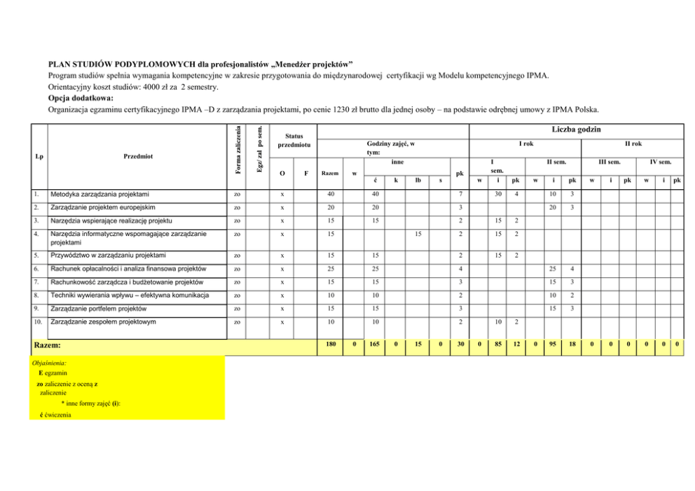 PLAN STUDIÓW PODYPLOMOWYCH dla profesjonalistów „Menedżer projektów” Program studiów spełnia wymagania kompetencyjne w zakresie przygotowania do międzynarodowej certyfikacji wg Modelu kompetencyjnego IPMA. Orientacyjny koszt studiów: 4000 zł za 2 semestry. Opcja dodatkowa: Organizacja egzaminu certyfikacyjnego IPMA –D z zarządzania projektami, po cenie 1230 zł brutto dla jednej osoby – na podstawie odrębnej umowy z IPMA Polska. Liczba godzin Status przedmiotu Lp Godziny zajęć, w tym: inne Przedmiot O F Razem w ć I rok pk k lb s w I sem. i pk 30 4 II rok II sem. w III sem. i pk 10 3 20 3 1. Metodyka zarządzania projektami zo x 40 40 7 2. Zarządzanie projektem europejskim zo x 20 20 3 3. Narzędzia wspierające realizację projektu zo x 15 15 2 15 2 4. Narzędzia informatyczne wspomagające zarządzanie projektami zo x 15 2 15 2 5. Przywództwo w zarządzaniu projektami zo x 15 15 2 15 2 6. Rachunek opłacalności i analiza finansowa projektów zo x 25 25 4 25 4 7. Rachunkowość zarządcza i budżetowanie projektów zo x 15 15 3 15 3 8. Techniki wywierania wpływu – efektywna komunikacja zo x 10 10 2 10 2 9. Zarządzanie portfelem projektów zo x 15 15 3 15 3 10. Zarządzanie zespołem projektowym zo x 10 10 2 95 18 180 Razem: Objaśnienia: E egzamin zo zaliczenie z oceną z zaliczenie * inne formy zajęć (i): ć ćwiczenia 15 0 165 0 15 0 30 0 10 2 85 12 0 IV sem. w i pk w i pk 0 0 0 0 0 0 k konwersatorium lb laboratoria s seminaria pk punkty ECTS O/F obowiązkowy/ fakulatywny