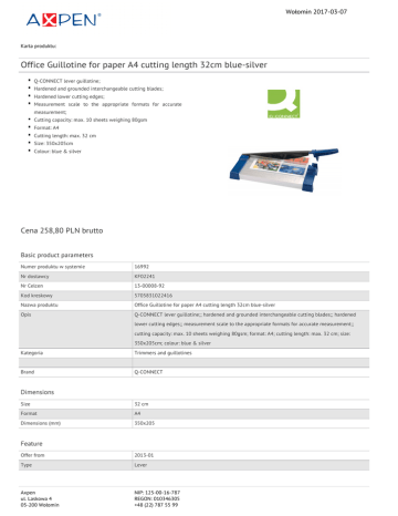 Wołomin 2017-03-07 Karta produktu: Office Guillotine for paper A4 cutting length 32cm blue-silver Q-CONNECT lever guillotine; Hardened and grounded interchangeable cutting blades; Hardened lower cutting edges; Measurement scale to the appropriate formats for accurate measurement; Cutting capacity: max. 10 sheets weighing 80gsm Format: A4 Cutting length: max. 32 cm Size: 350x205cm Colour: blue & silver Cena 258,80 PLN brutto Basic product parameters Numer produktu w systemie 16992 Nr dostawcy KF02241 Nr Celcen 13-00008-92 Kod kreskowy 5705831022416 Nazwa produktu Office Guillotine for paper A4 cutting length 32cm blue-silver Opis Q-CONNECT lever guillotine;; hardened and grounded interchangeable cutting blades;; hardened lower cutting edges;; measurement scale to the appropriate formats for accurate measurement;; cutting capacity: max. 10 sheets weighing 80gsm; format: A4; cutting length: max. 32 cm; size: 350x205cm; colour: blue & silver Kategoria Trimmers and guillotines Brand Q-CONNECT Dimensions Size 32 cm Format A4 Dimensions (mm) 350x205 Feature Offer from 2013-01 Type Lever Axpen ul. Laskowa 4 05-200 Wołomin NIP: 125-00-16-787 REGON: 010346305 +48 (22) 787 55 99 Wołomin 2017-03-07 Karta katalogowa produktu cd. Office Guillotine for paper A4 cutting length 32cm blue-silver Product Guillotine Kind A4 Material Metal/metal Colour Colour Silver/blue Procurement vocabulary CPV 30191000-4 Sprzęt biurowy, z wyjątkiem mebli Certifications Hit Hit New product Standard Amount Number of sheets 10 Pozostałe zdjęcia produktu Serdecznie zapraszamy do współpracy Axpen zespół. Axpen ul. Laskowa 4 05-200 Wołomin NIP: 125-00-16-787 REGON: 010346305 +48 (22) 787 55 99
